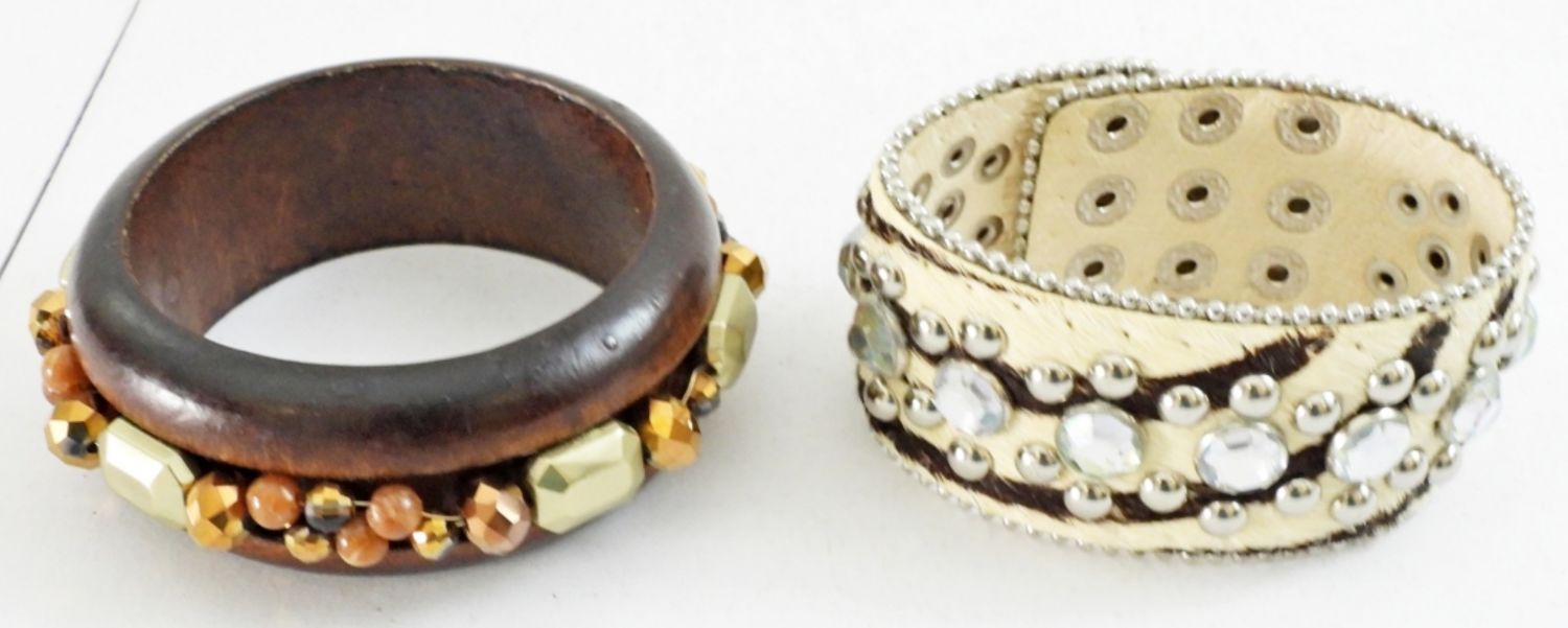 (4) NECKLACE 16″ – 18″ (2) BRACELETS with WOOD BANGLE & LEATHER SNAP 8″
