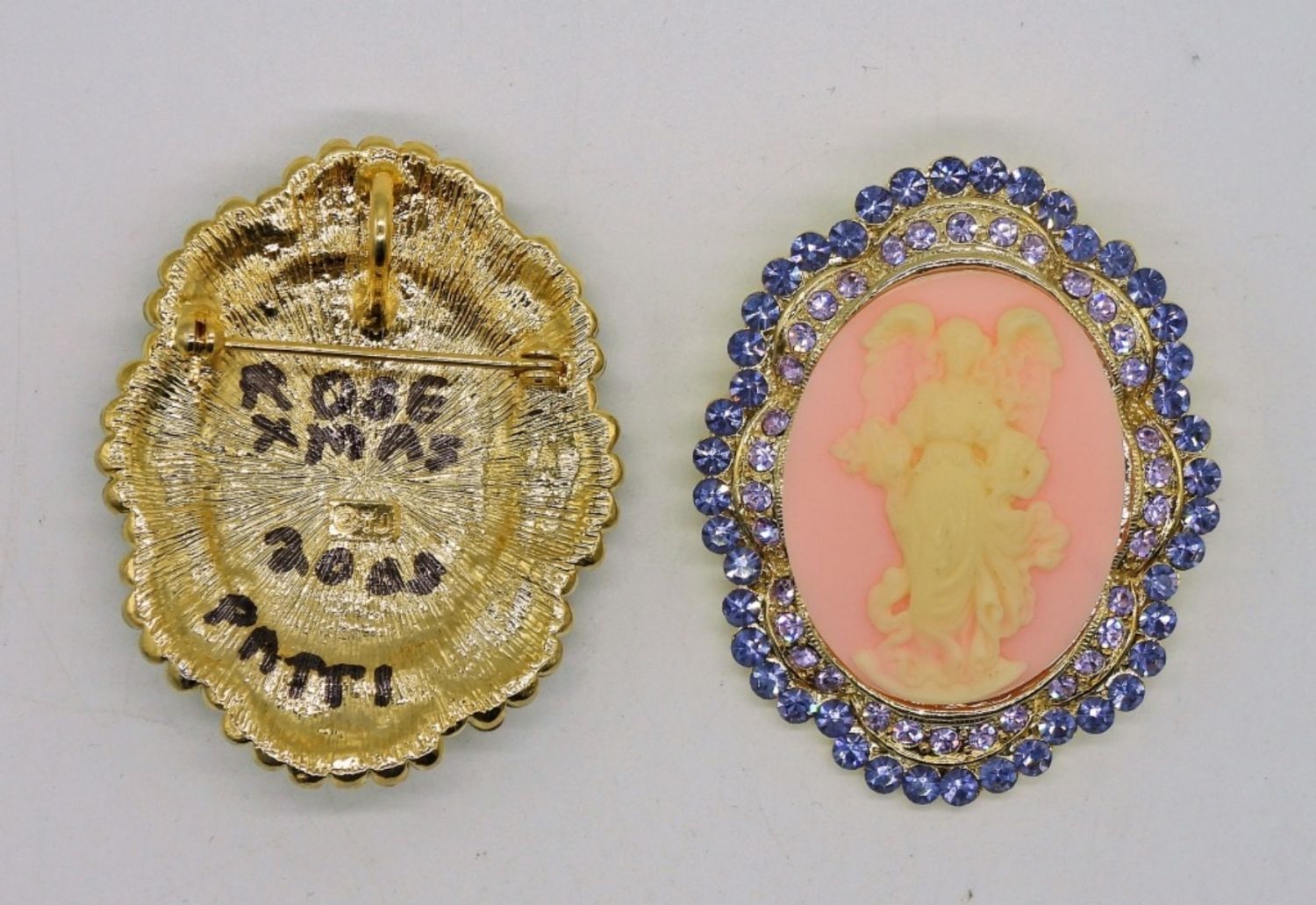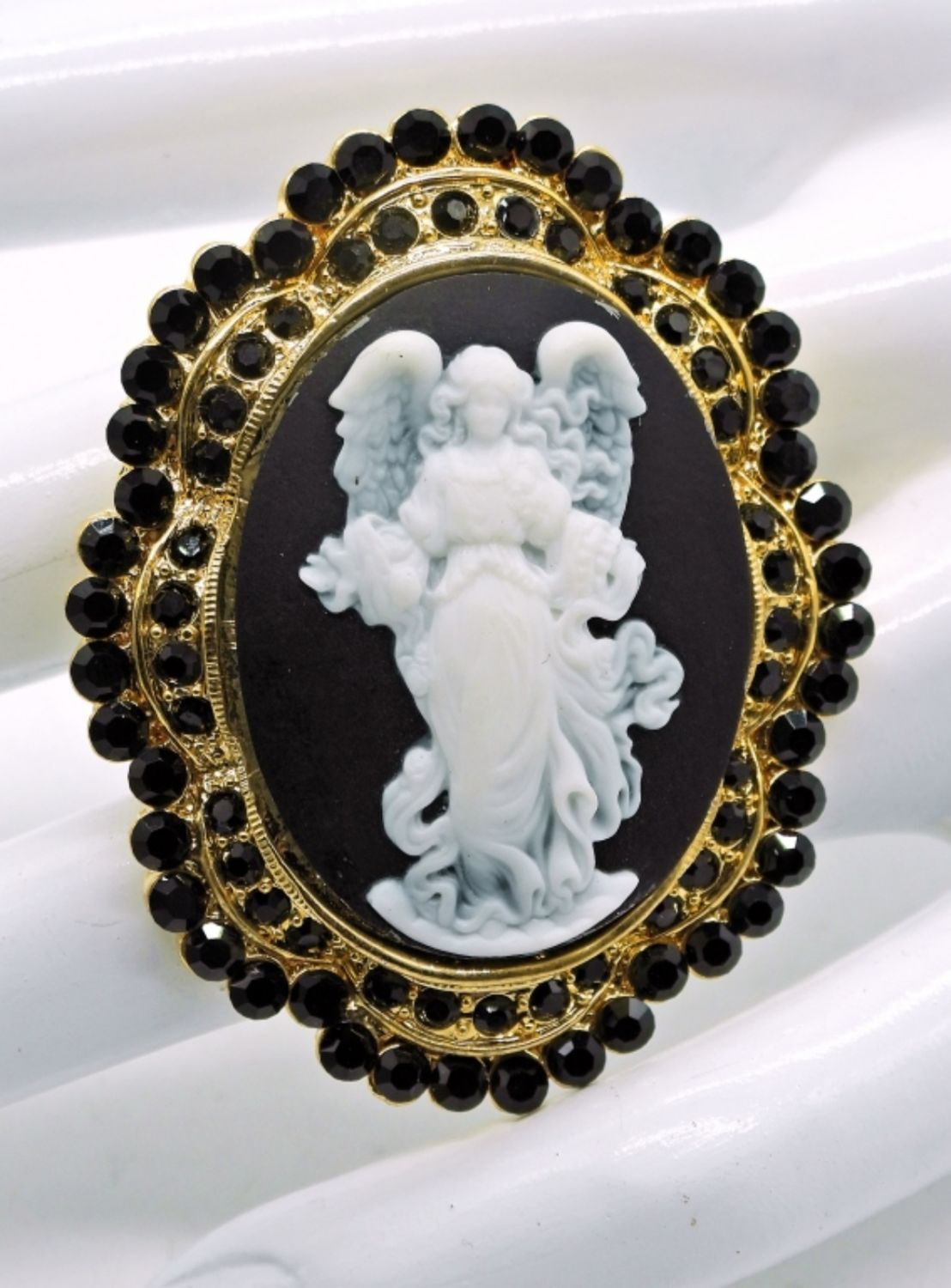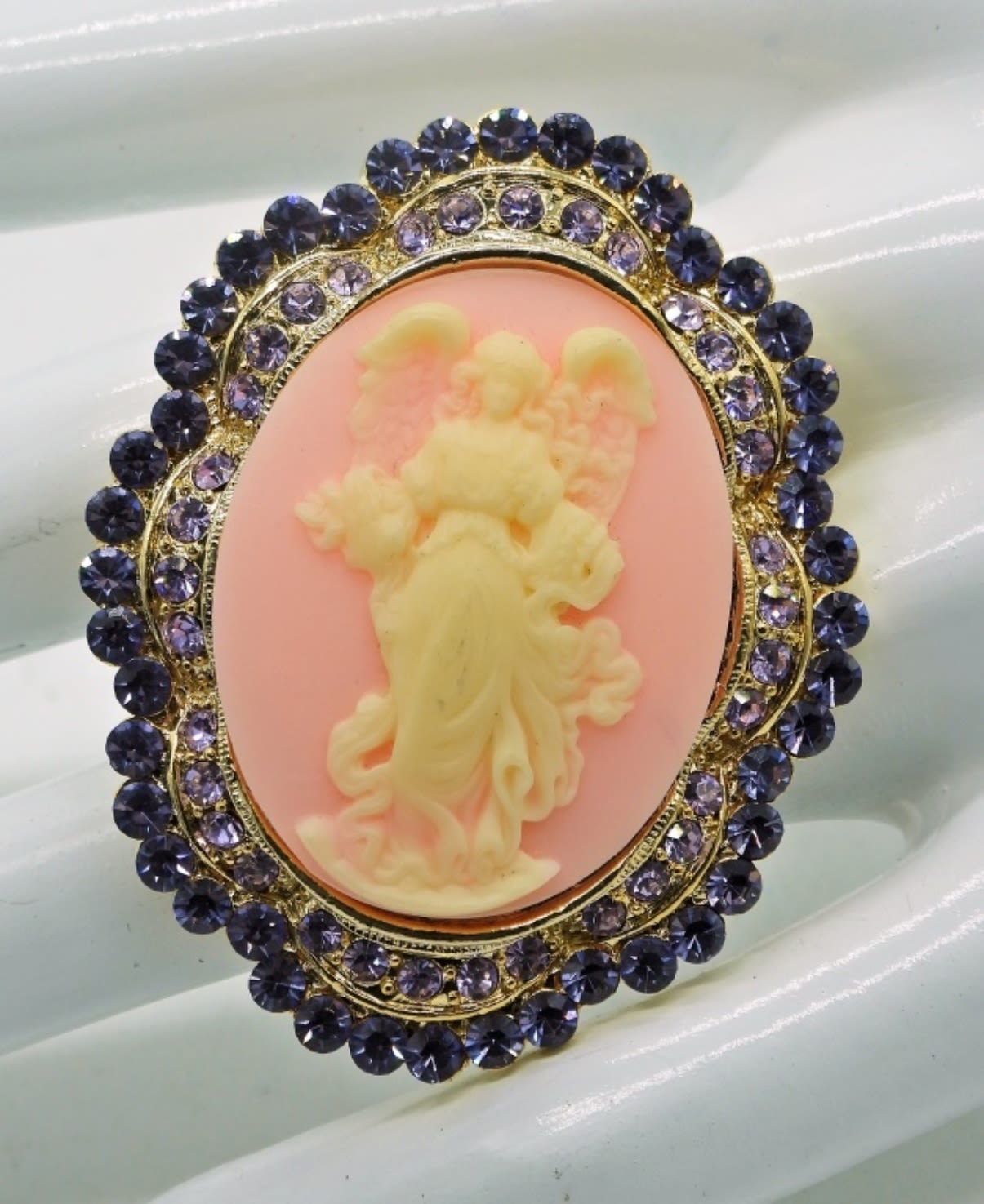 Angel Cameo in gold tone with Black Rhinestones & Angel Cameo in gold tone with Pink Background and Violet Rhinestones.