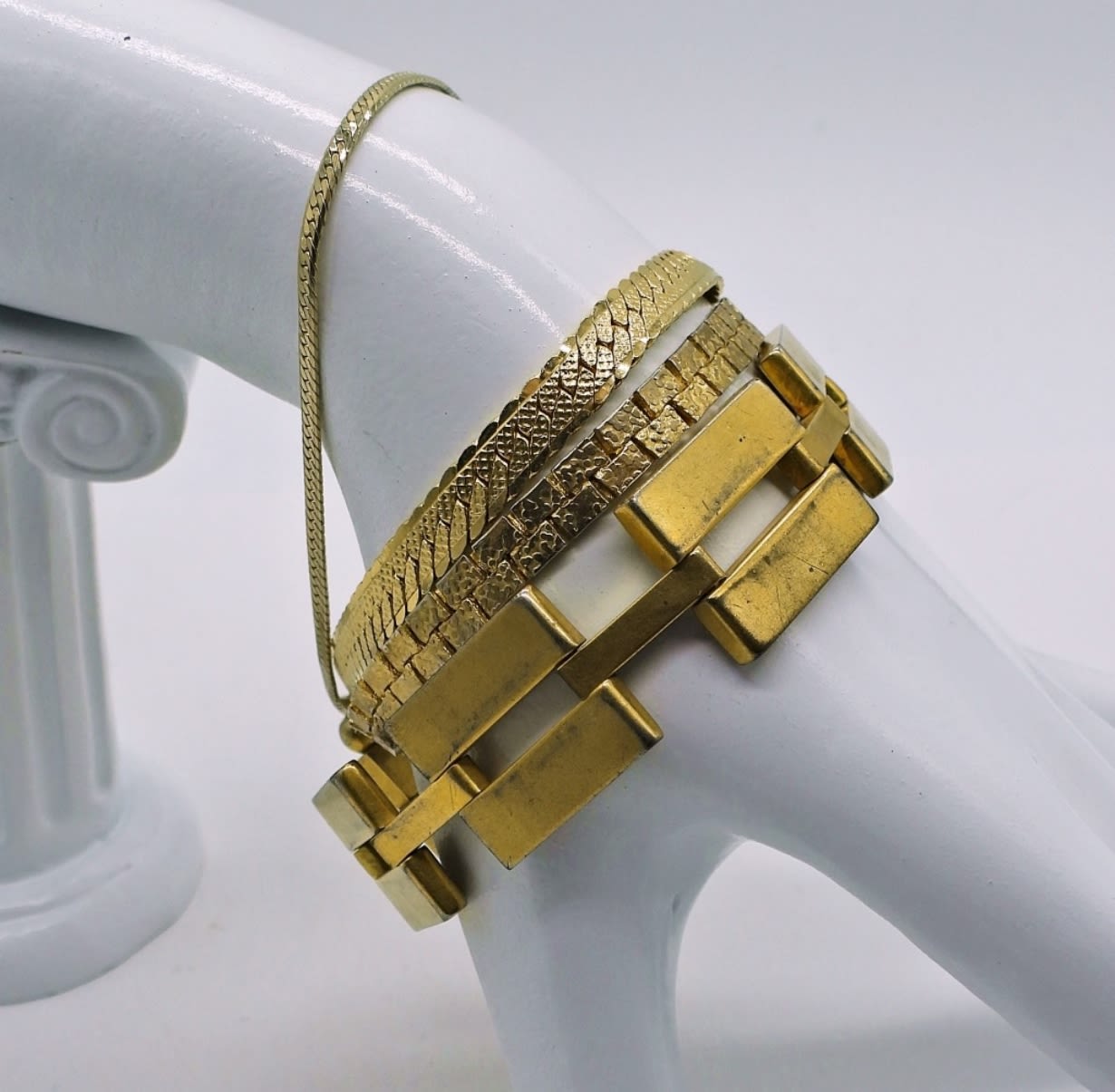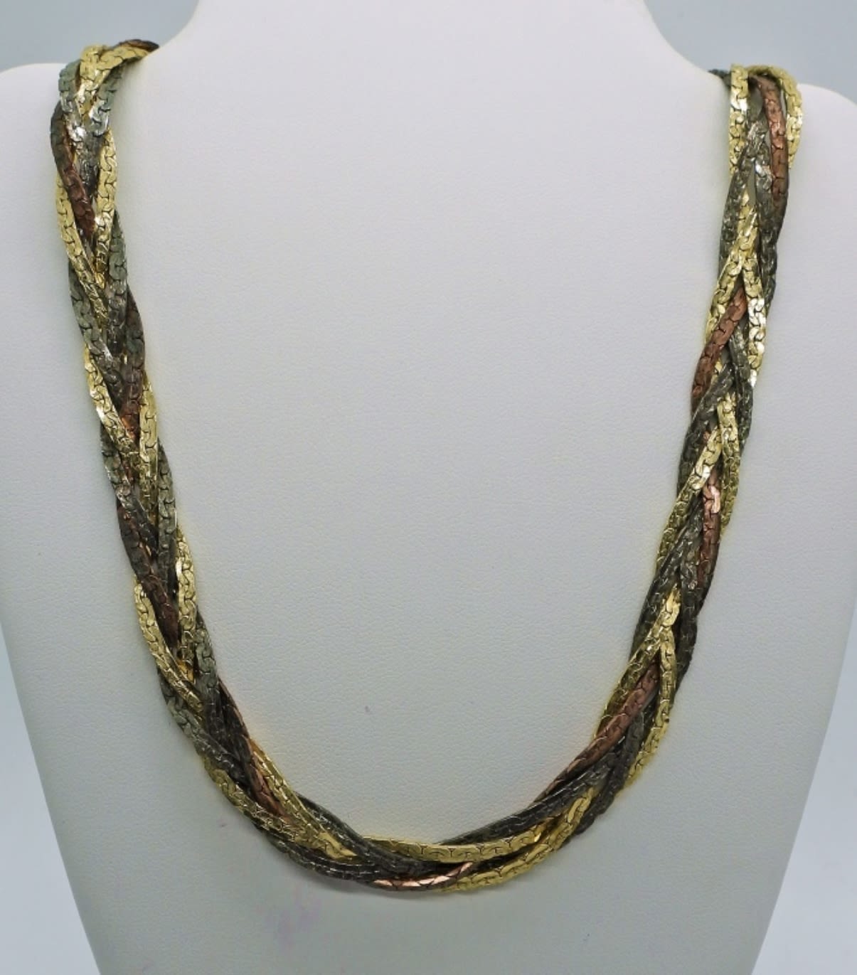 Tri Color Braided Metal Necklace, 17 inches and Four Gold Toned Chain Bracelets.