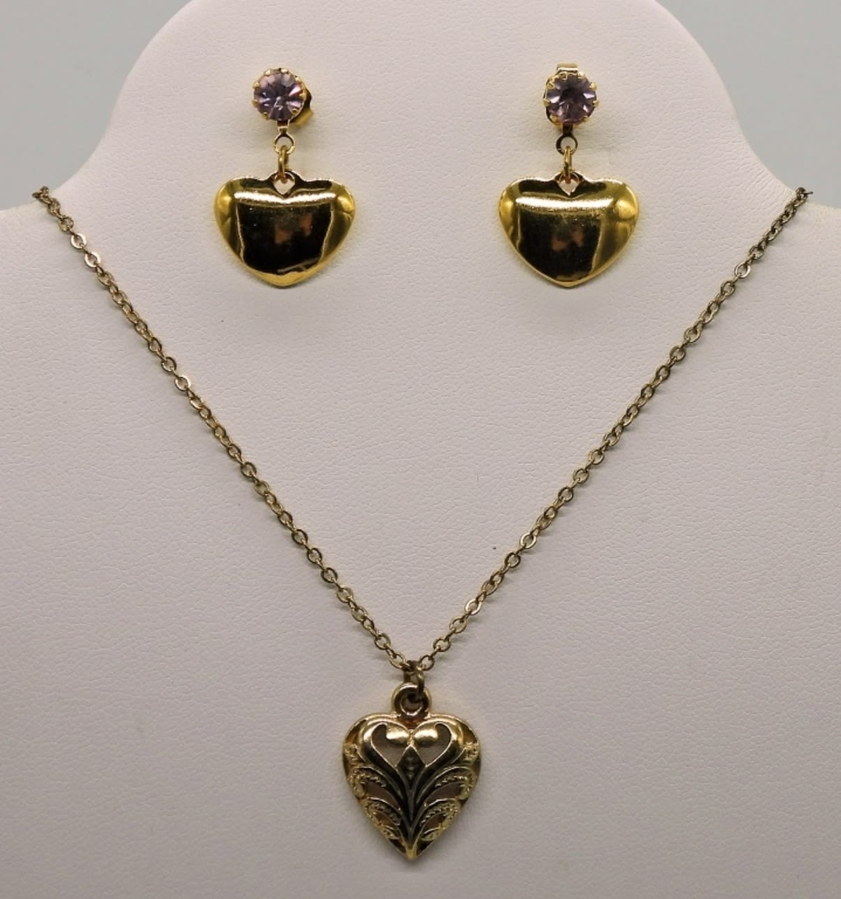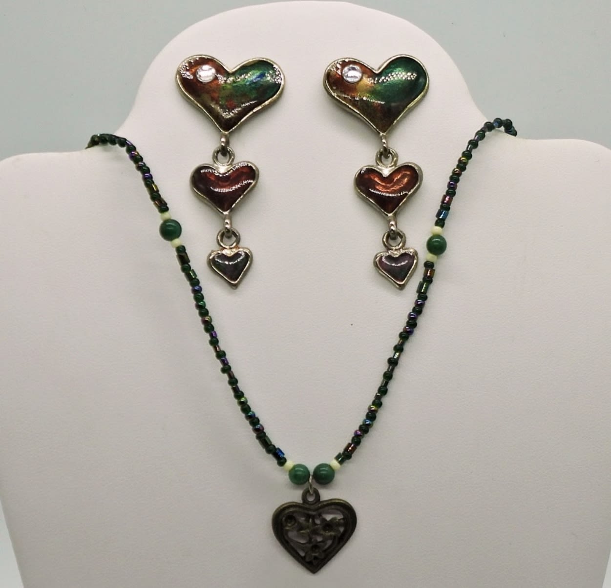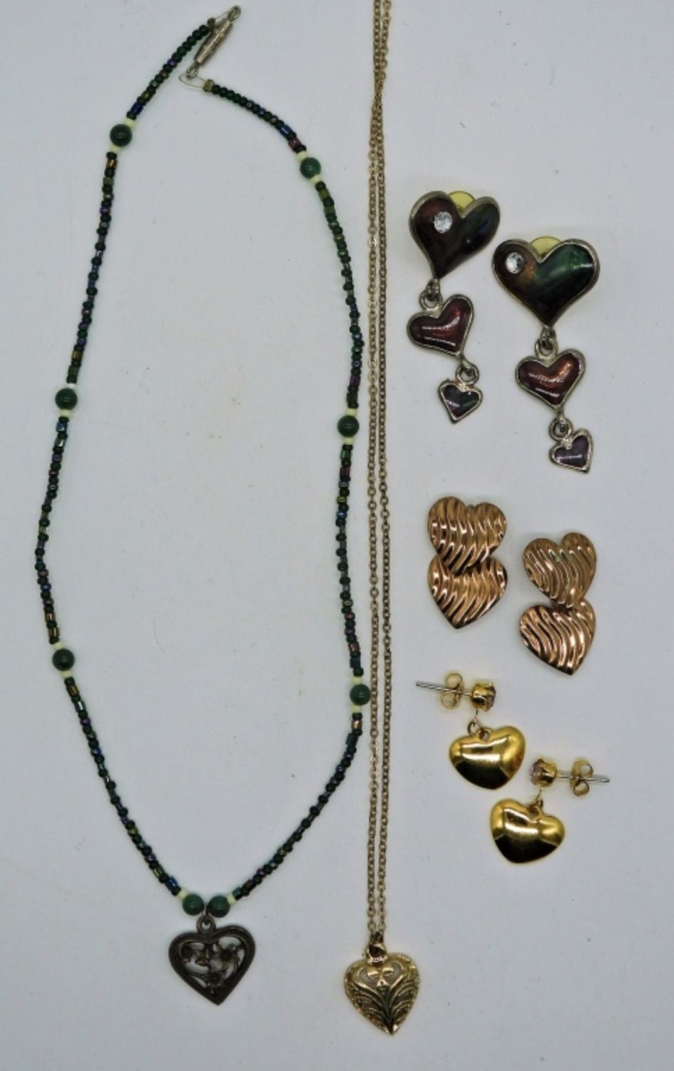 Gold, Silver & Copper Toned Heart Shaped Pierced Earrings. One 16 inch Heart Shaped Necklace and 14 inch floral heart on a beaded chain Necklace.