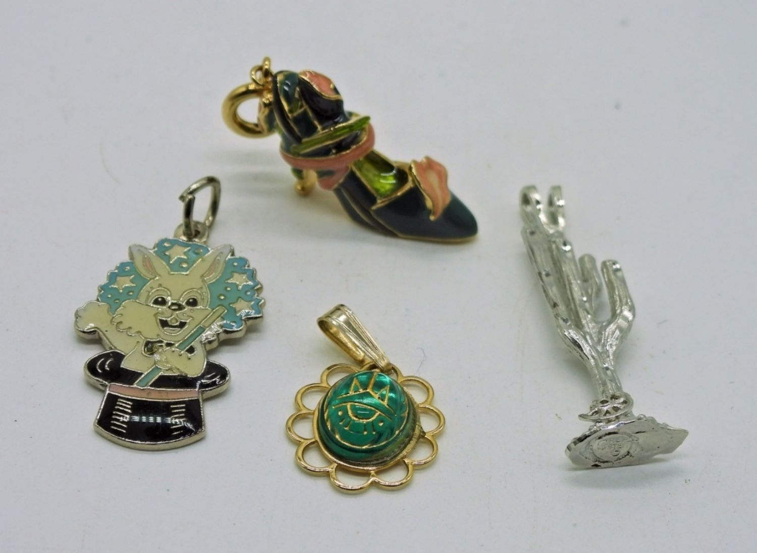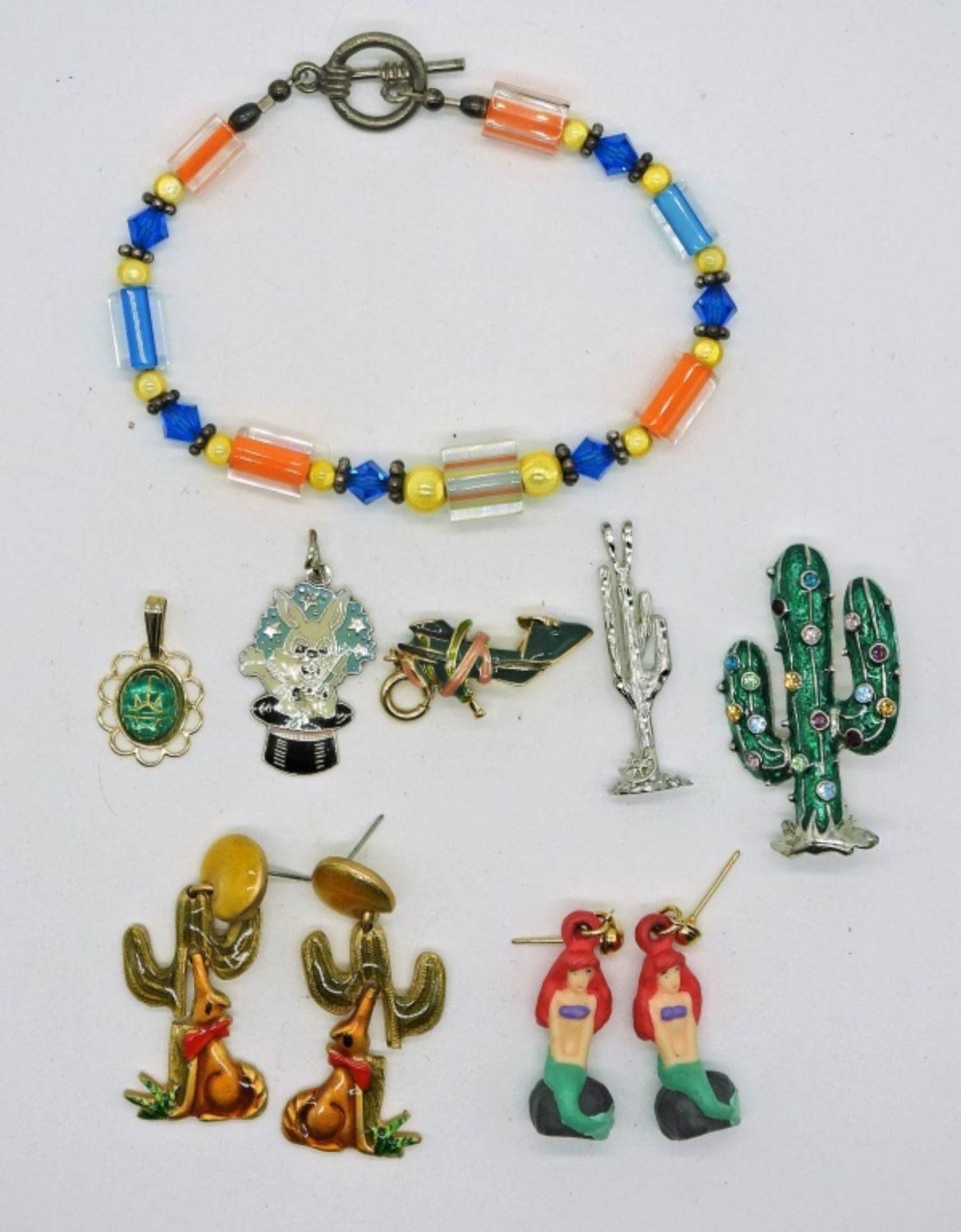 Enameled, Colorful, Fun Earrings. Colorful Cactus Pin & Colorful Beaded Bracelet. 4 Small Pendants.