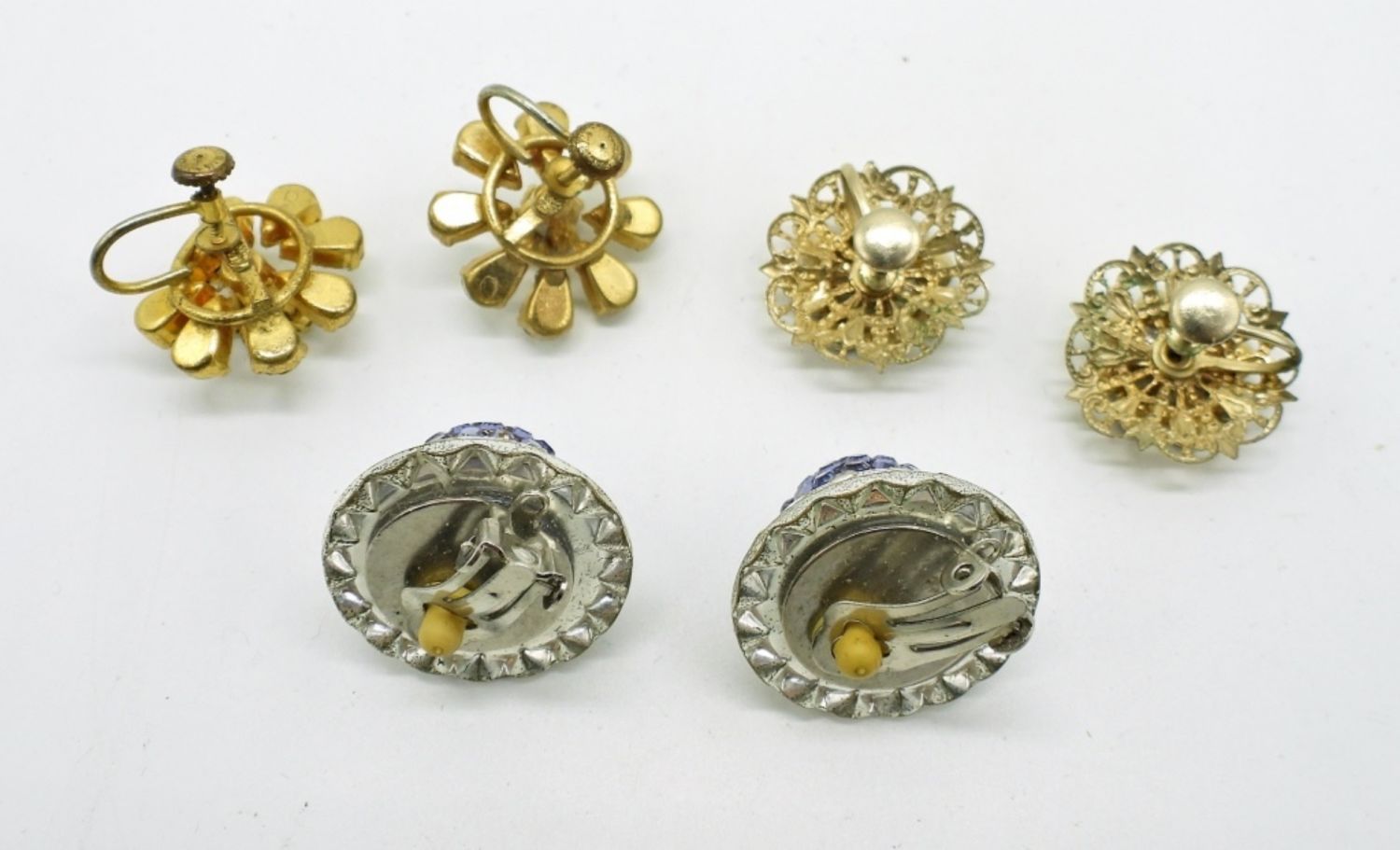 Three pair screw back and clip-on style round earrings.