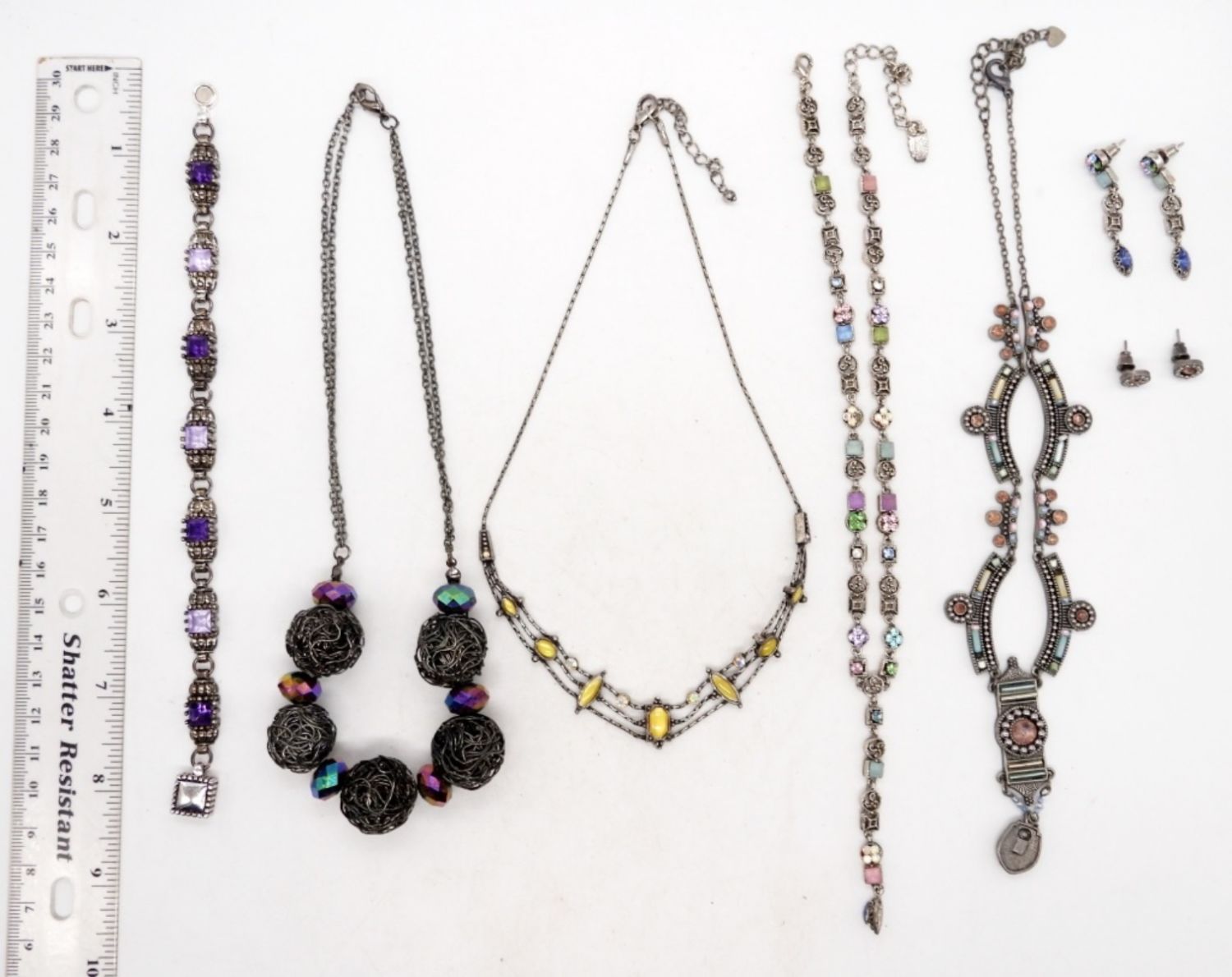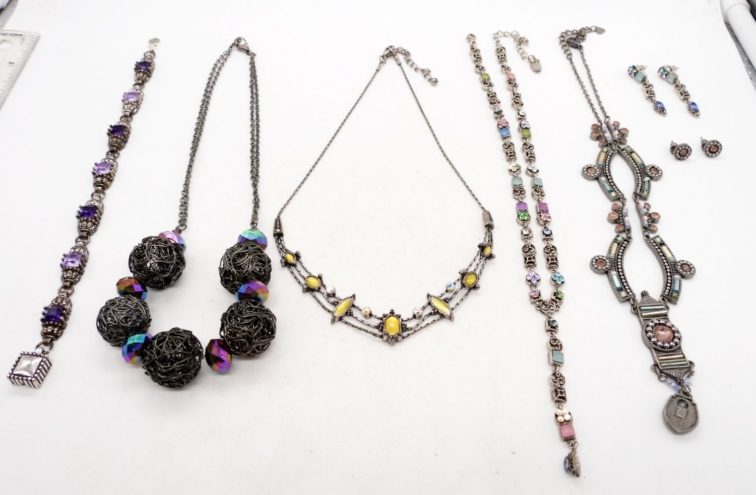 (4) NECKLACES, (2) PAIRS OF EARRINGS, (1) BRACELET; VARIOUS COLOR GEMSTONES – ALL DIFFERENT, ETCHED DESIGNS