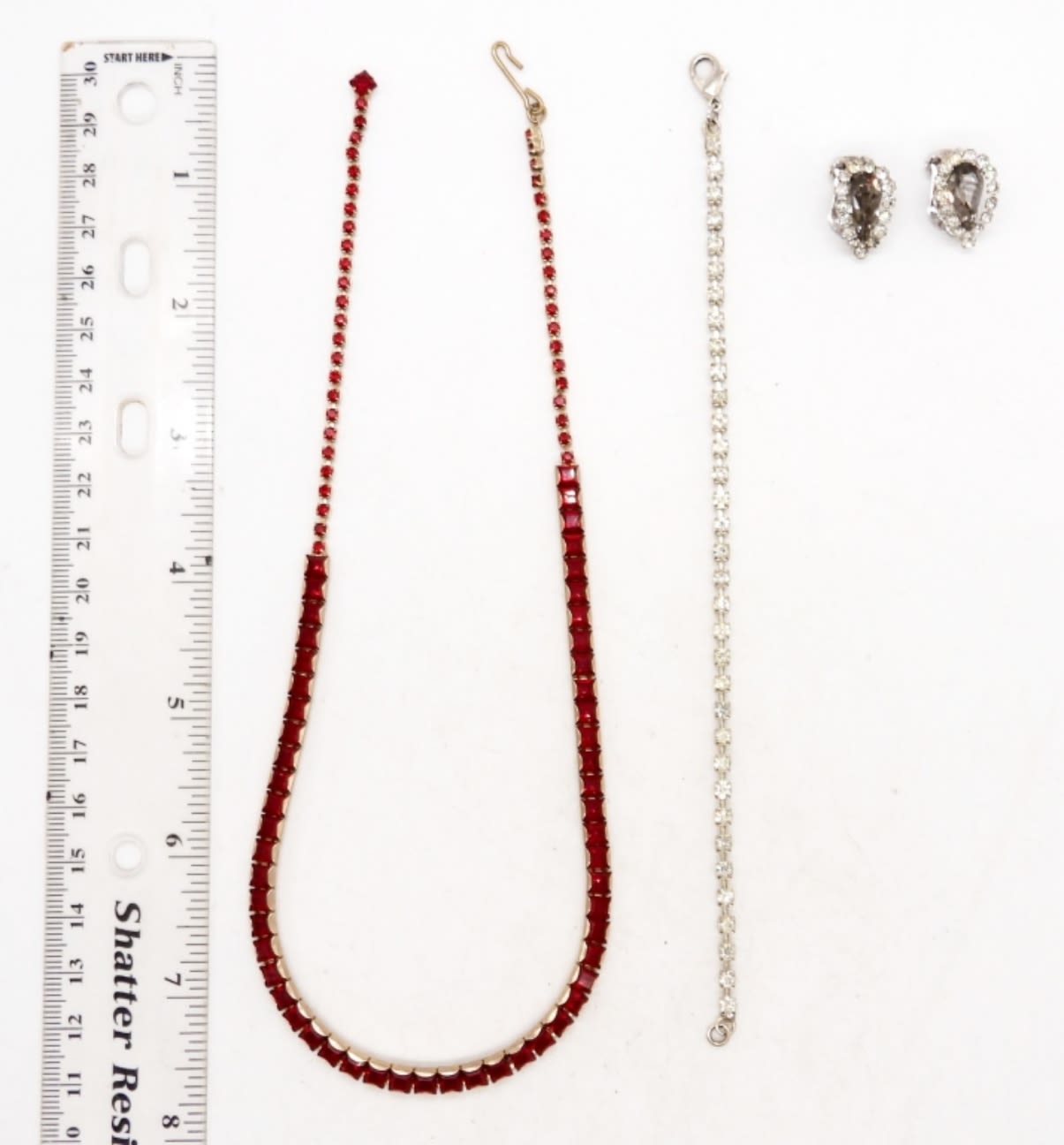 (1) 16 INCH NECKLACE; (1) 7 INCH TENNIS BRACELET; (1) PAIR OF CLIP-ON EARRINGS