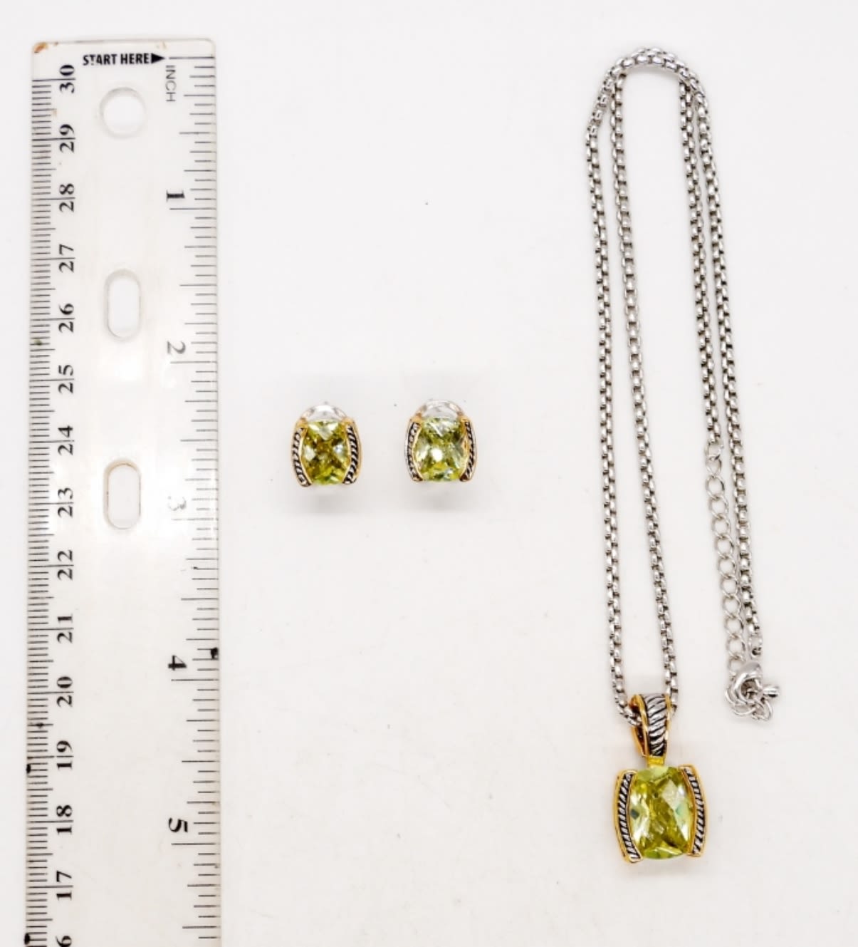 MATCHING SET WITH LARGE YELLOW GREEN CENTER GEMSTONES, GOLD & SILVER TONE ETCHED DESIGNS, 18 INCH CHAIN LENGTH, PIERCED EARRINGS