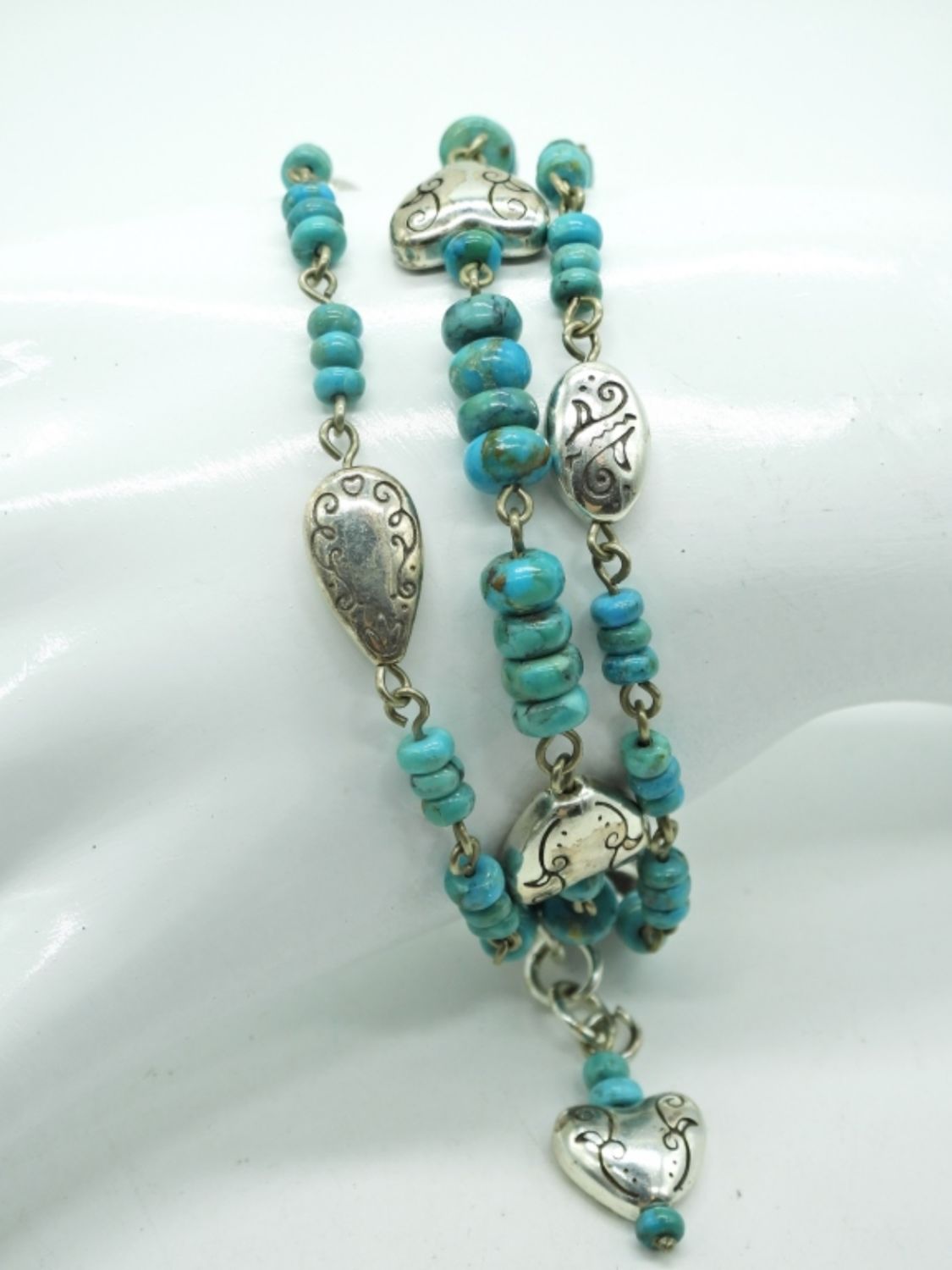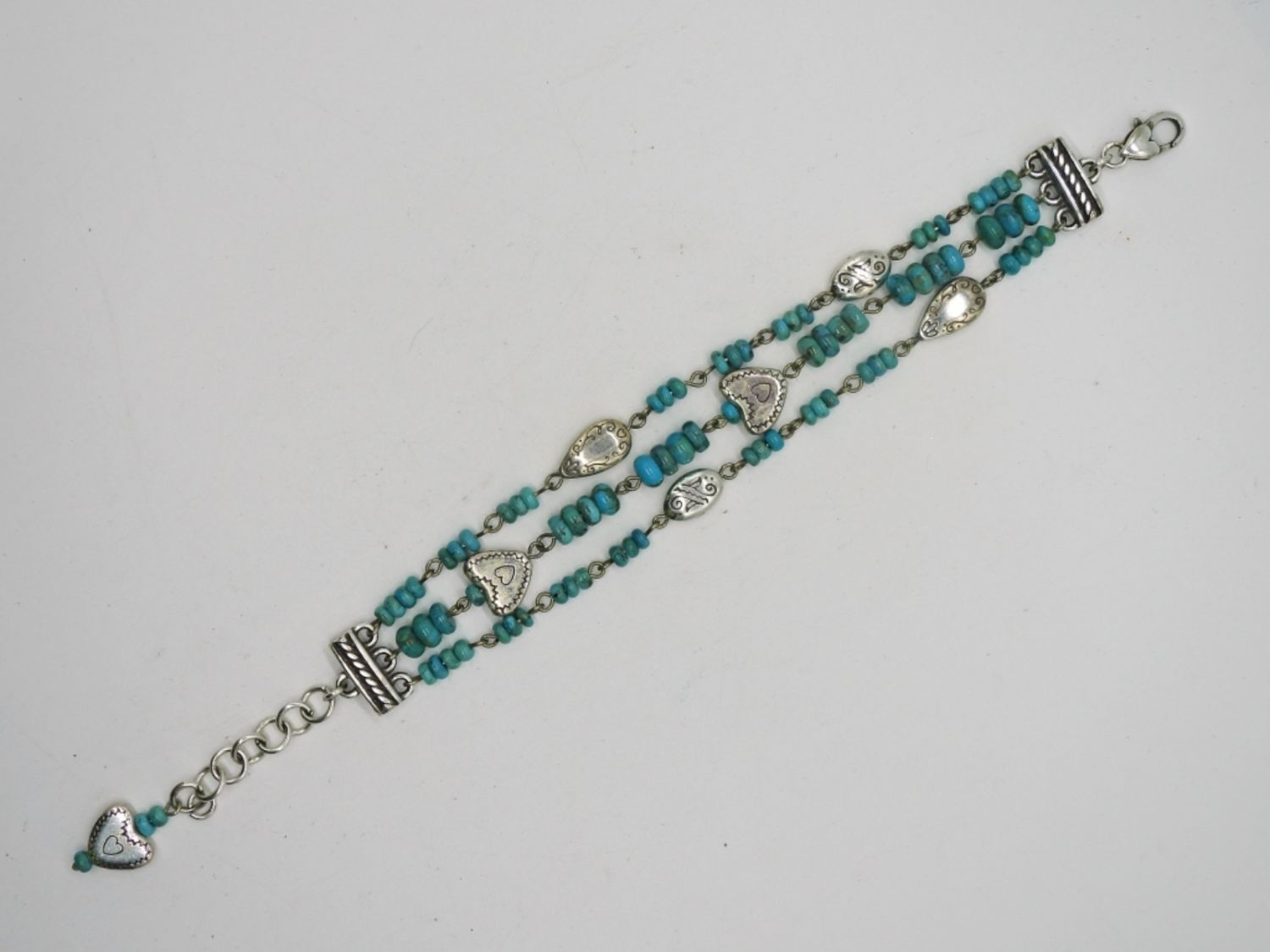 7-8 inch bracelet with turquoise colored stones and silver tone fittings.