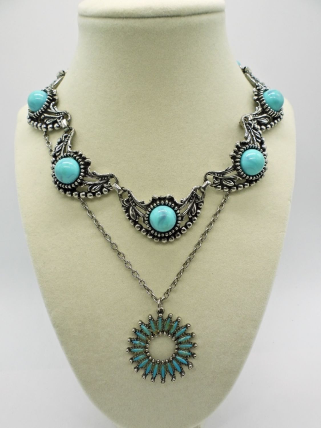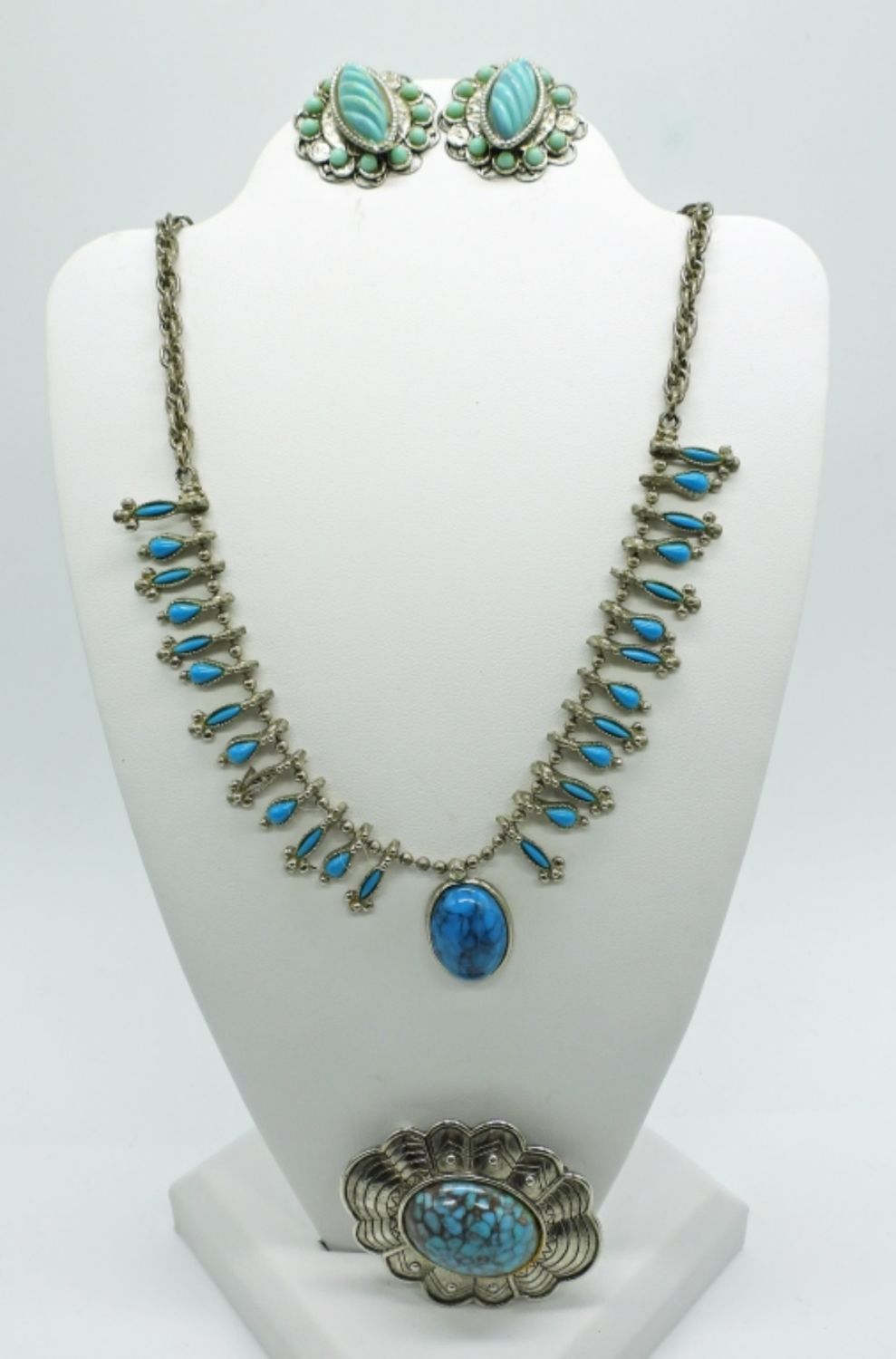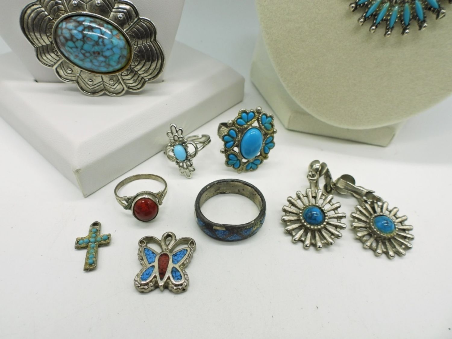 Three necklaces in various lengths 16-22 inches, two pairs of earrings, one brooch pin, four rings sizes 6-9, and two small pendants.