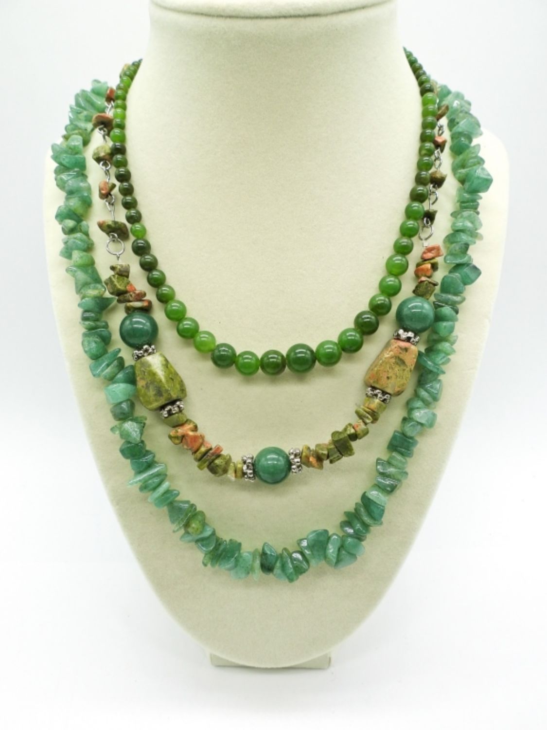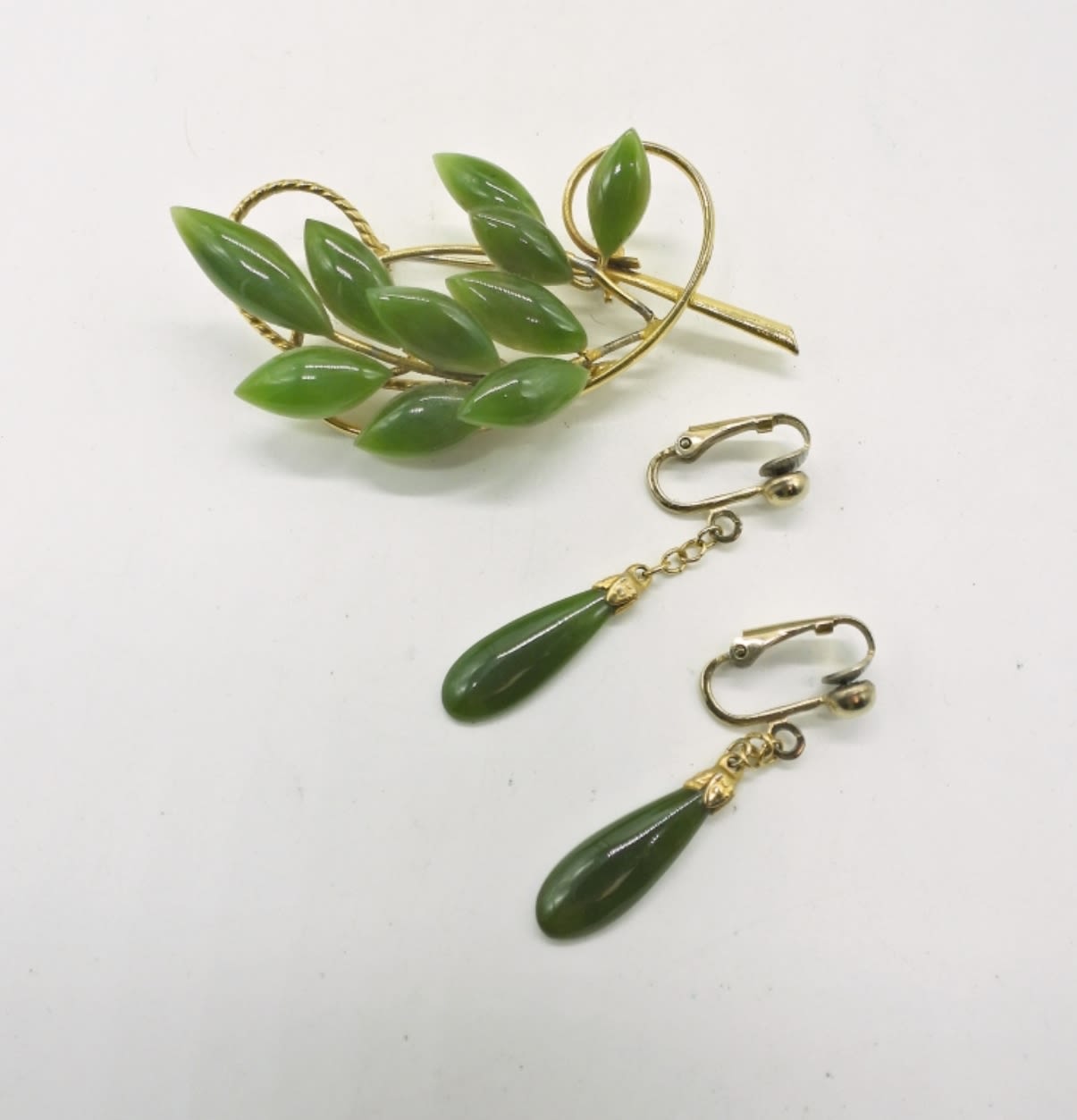 Three necklaces in various lengths 18-24 inches, one brooch pin 2.5 inches, and one pair drop earrings.