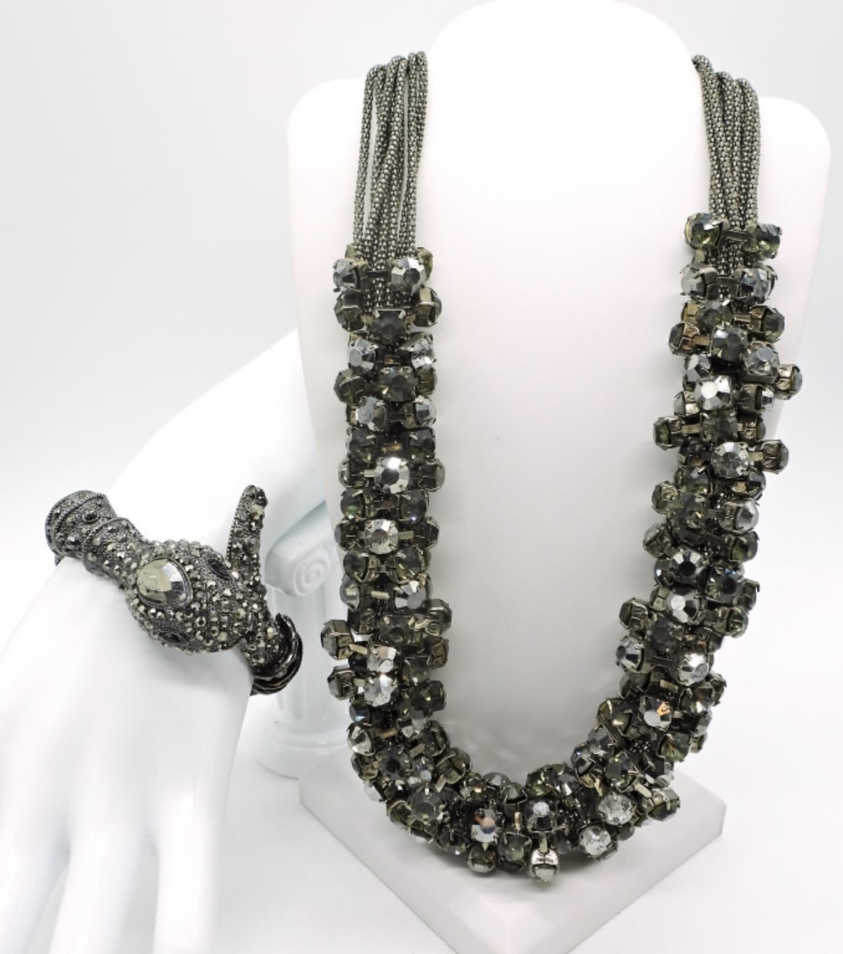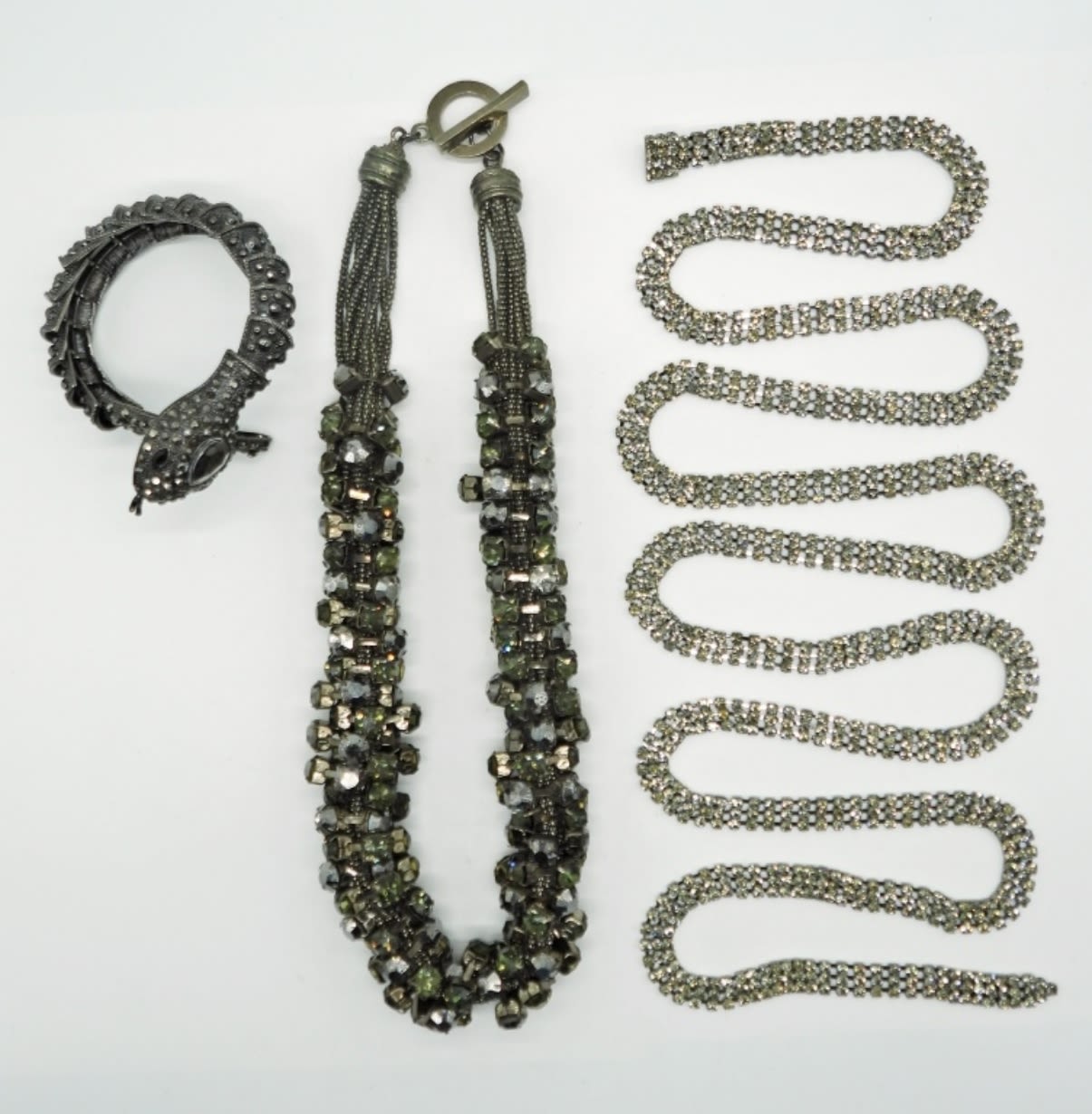 Snake bracelet 7-8 inches, lariat necklace with hook clasp 58 inches, and chunky toggle clasp necklace 21.5 inches. Beautiful and unique set!