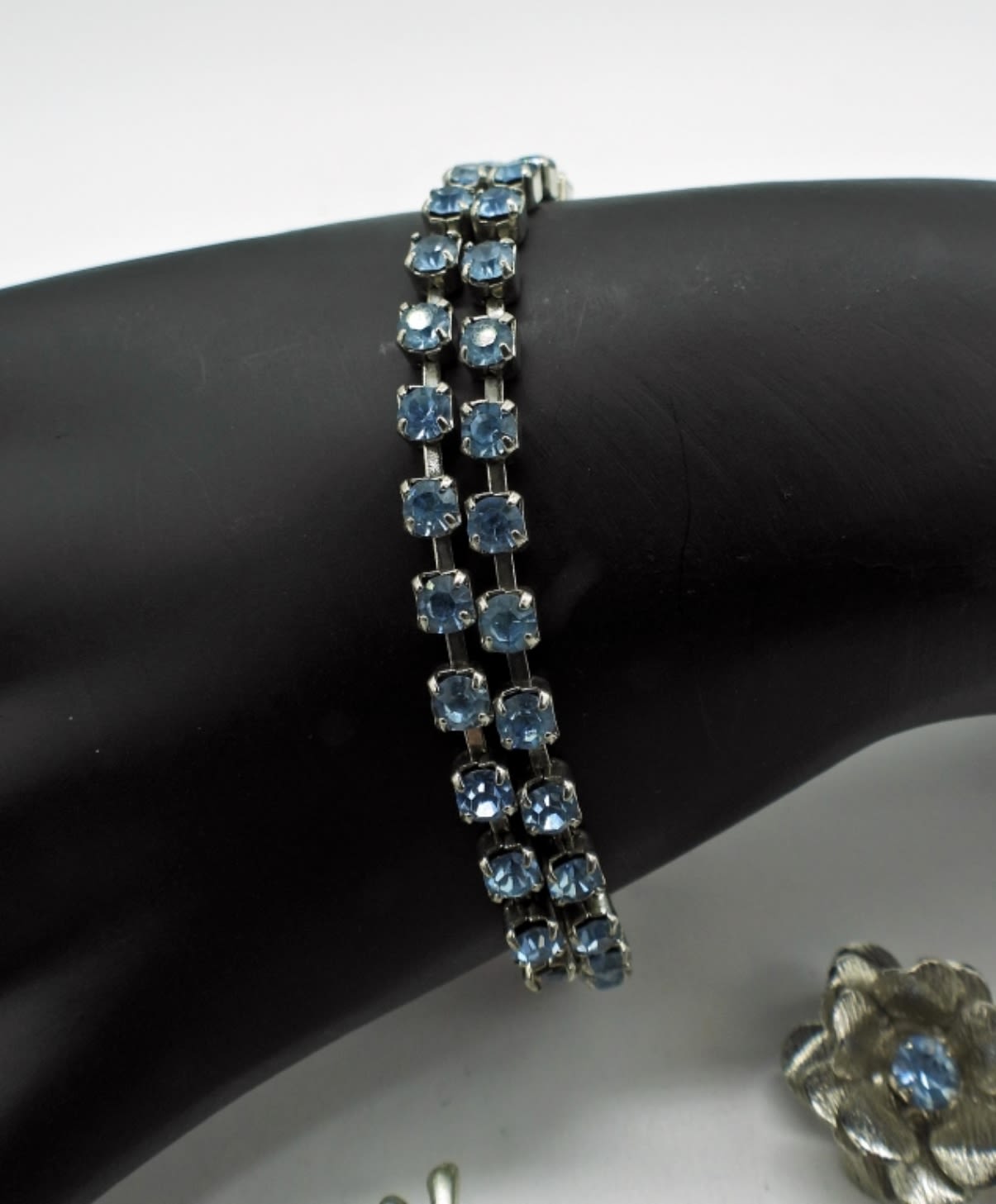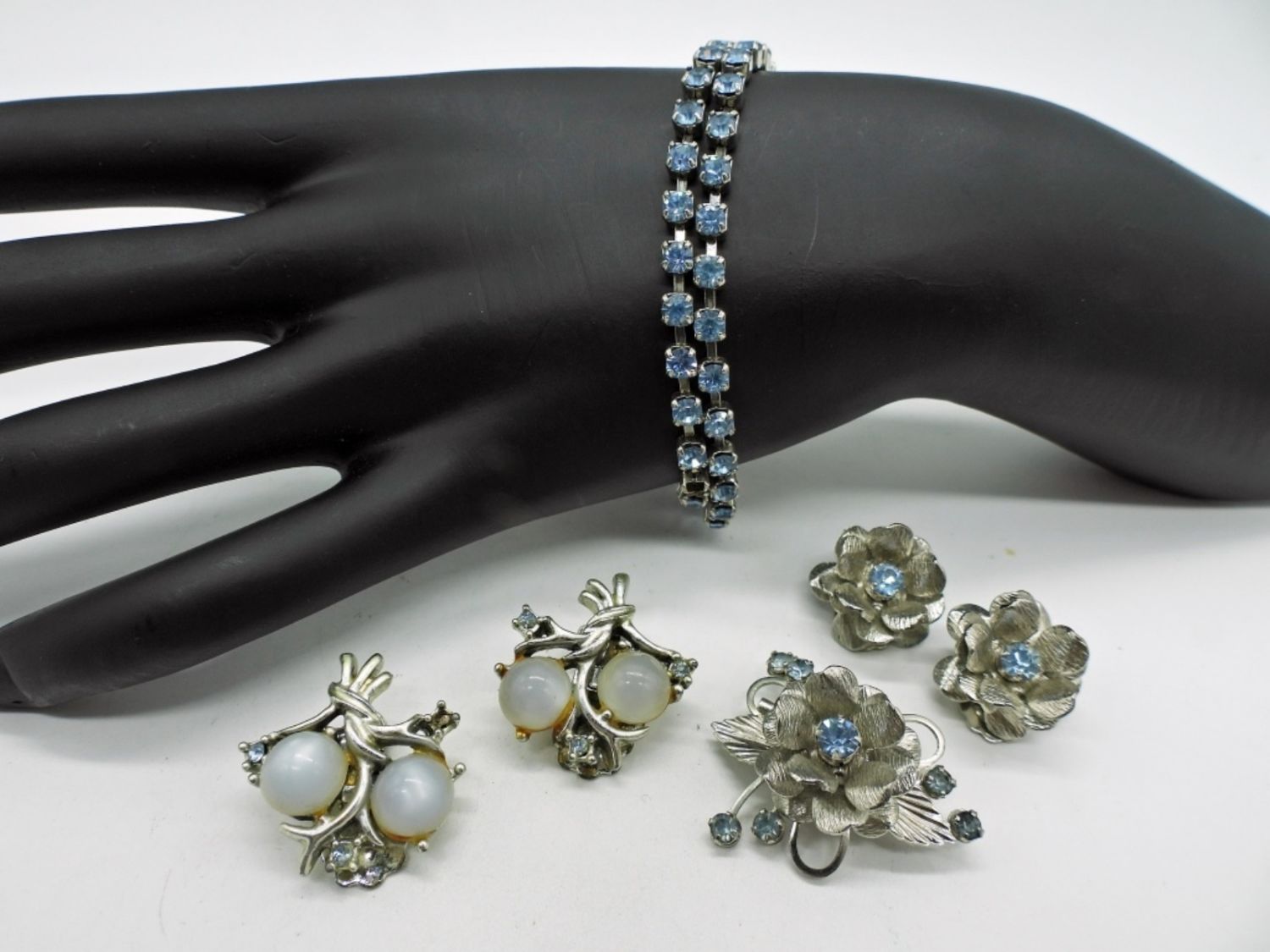 Matching pin and earrings, 7 inch bracelet, and one pair cat eye and rhinestone earrings.