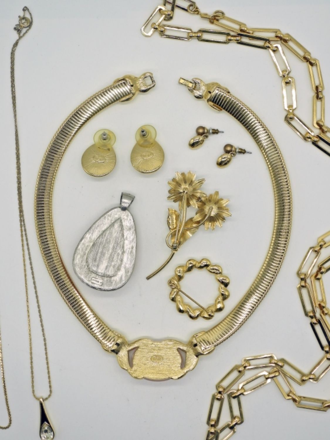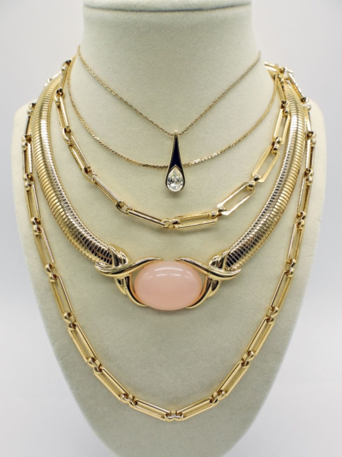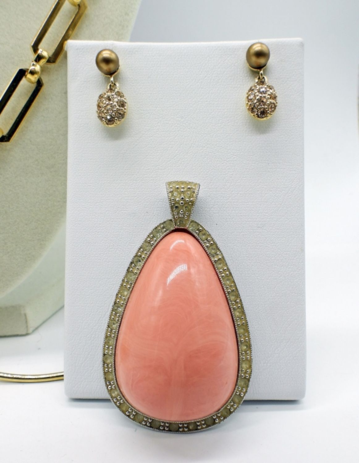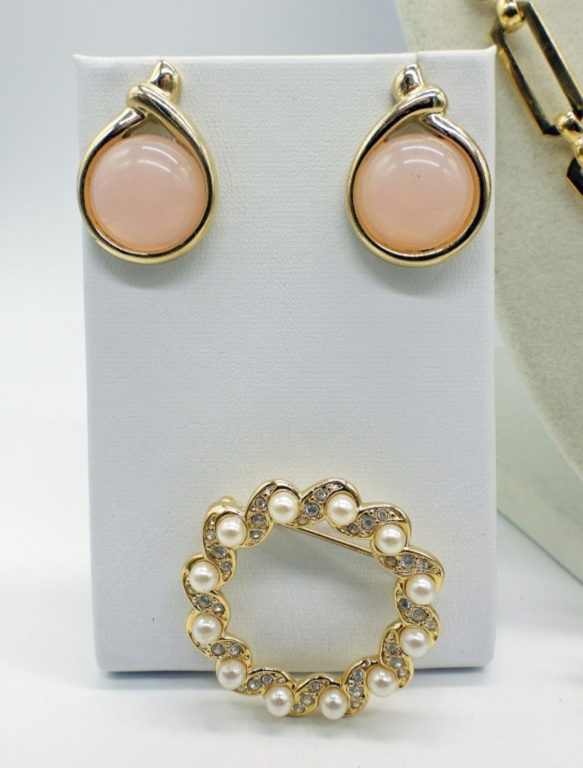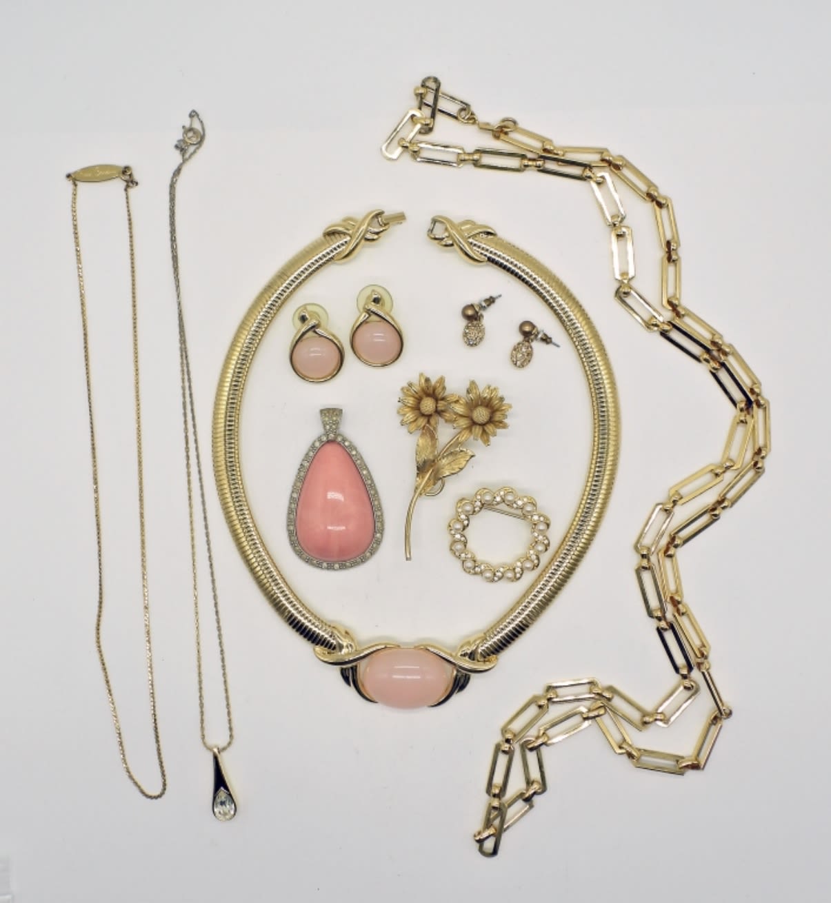 Monet, Givenchy, Trifari, Napier, and more. Three necklaces various lengths 18-36 inches long. two pairs earrings, one loose pendant, and two brooch pins. Pink themed, and gorgeous!