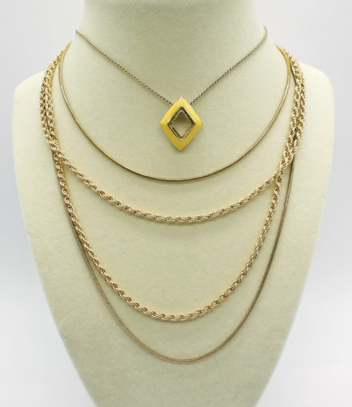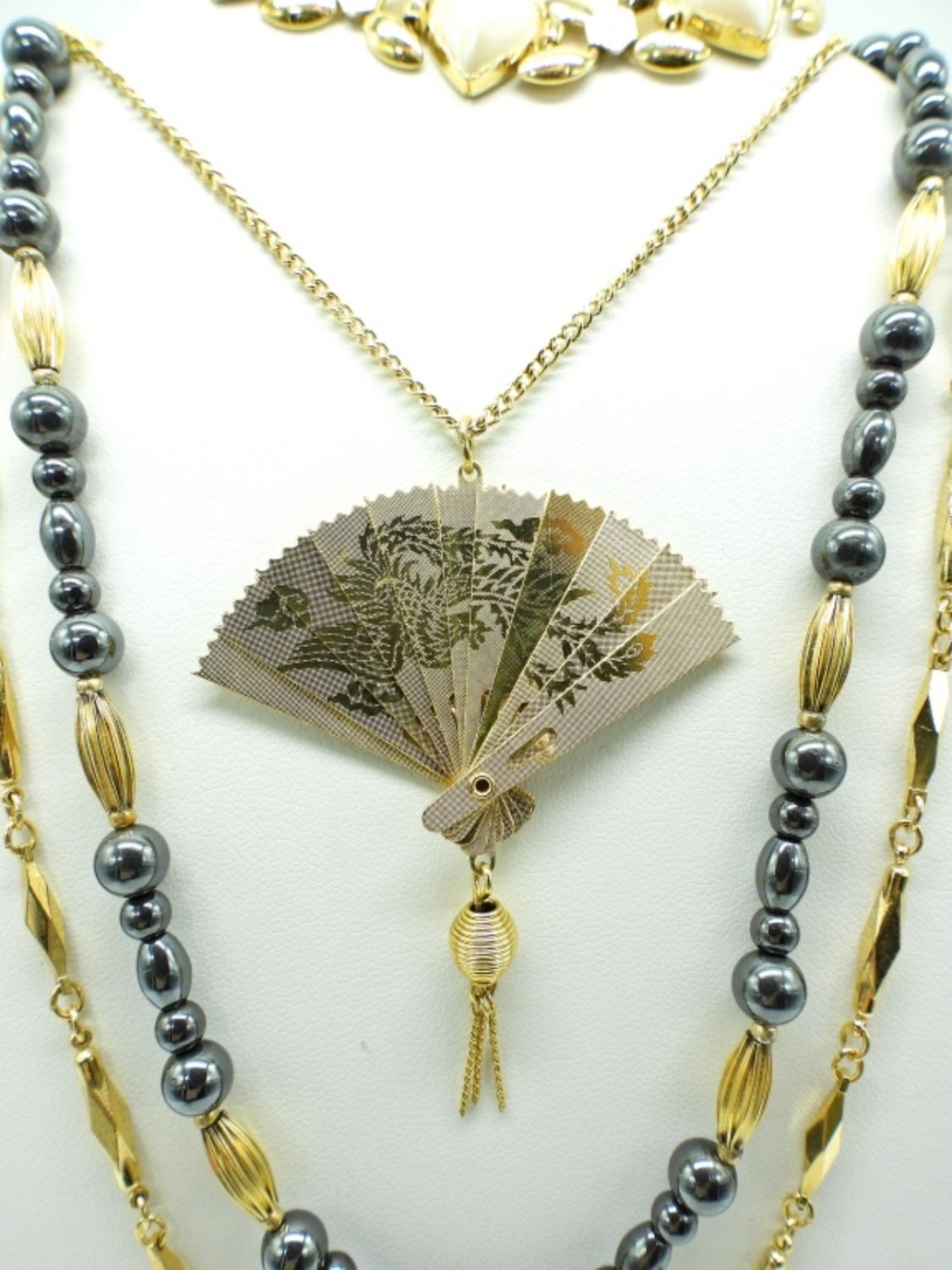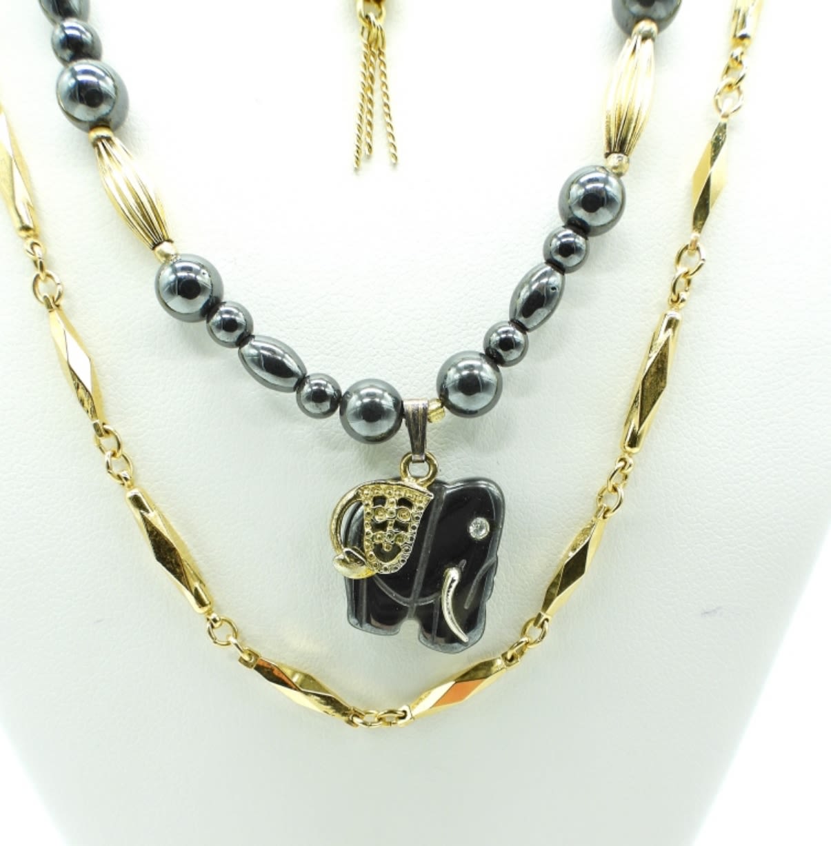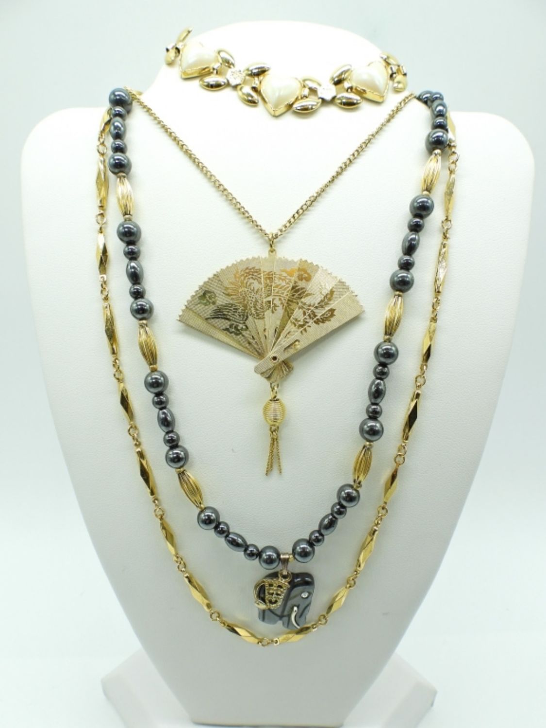 Gold tone necklaces in various styles, elephant, fan, and more. Various lengths 14-34 inches. Plus two 7 inch bracelets. Very pretty!