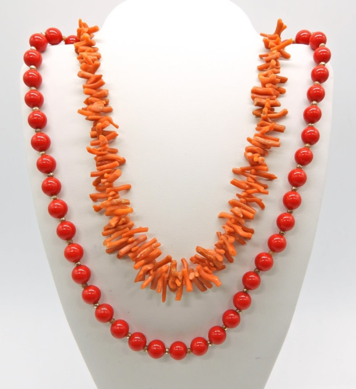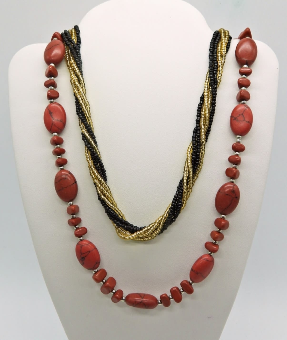 Four Beaded Necklaces, 17 inches. Two Red Beaded, One Black & Gold Beaded and One Coral like Beaded Necklaces.