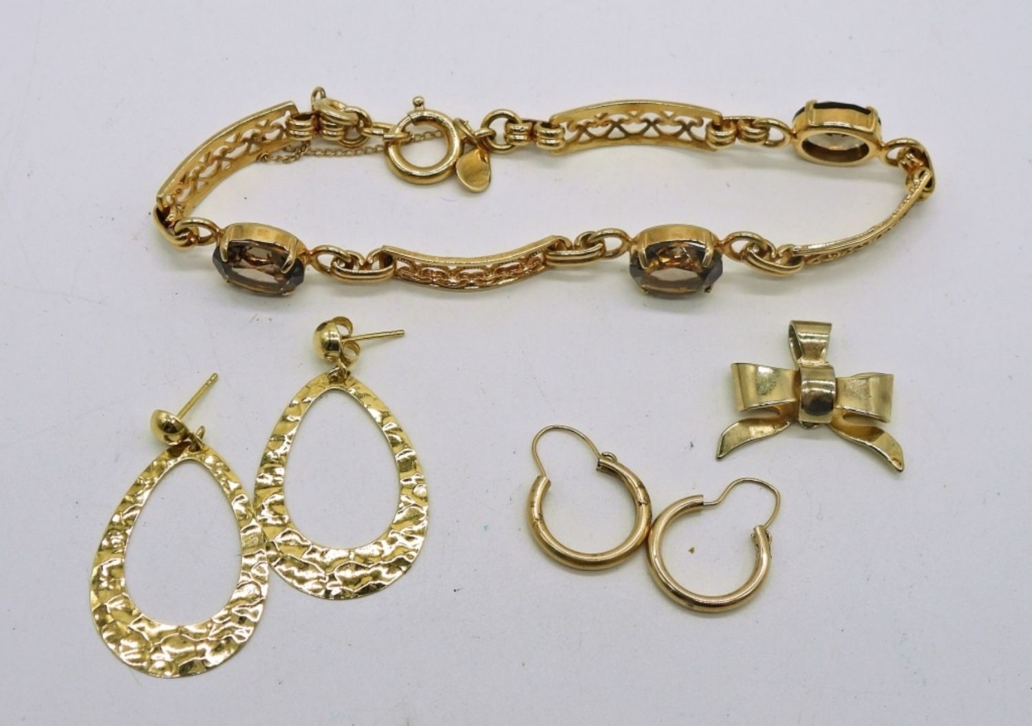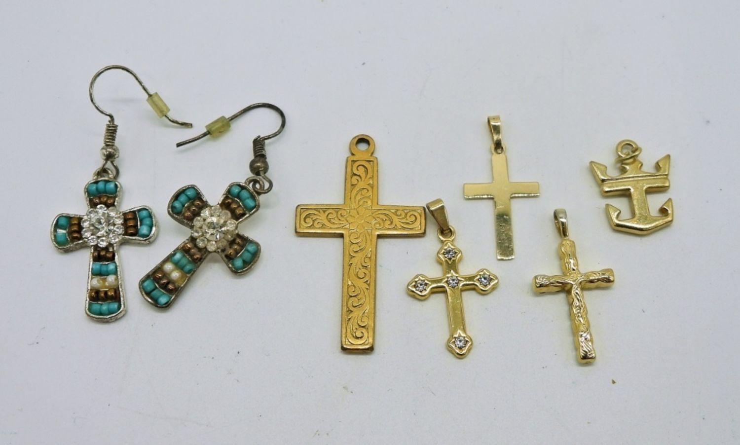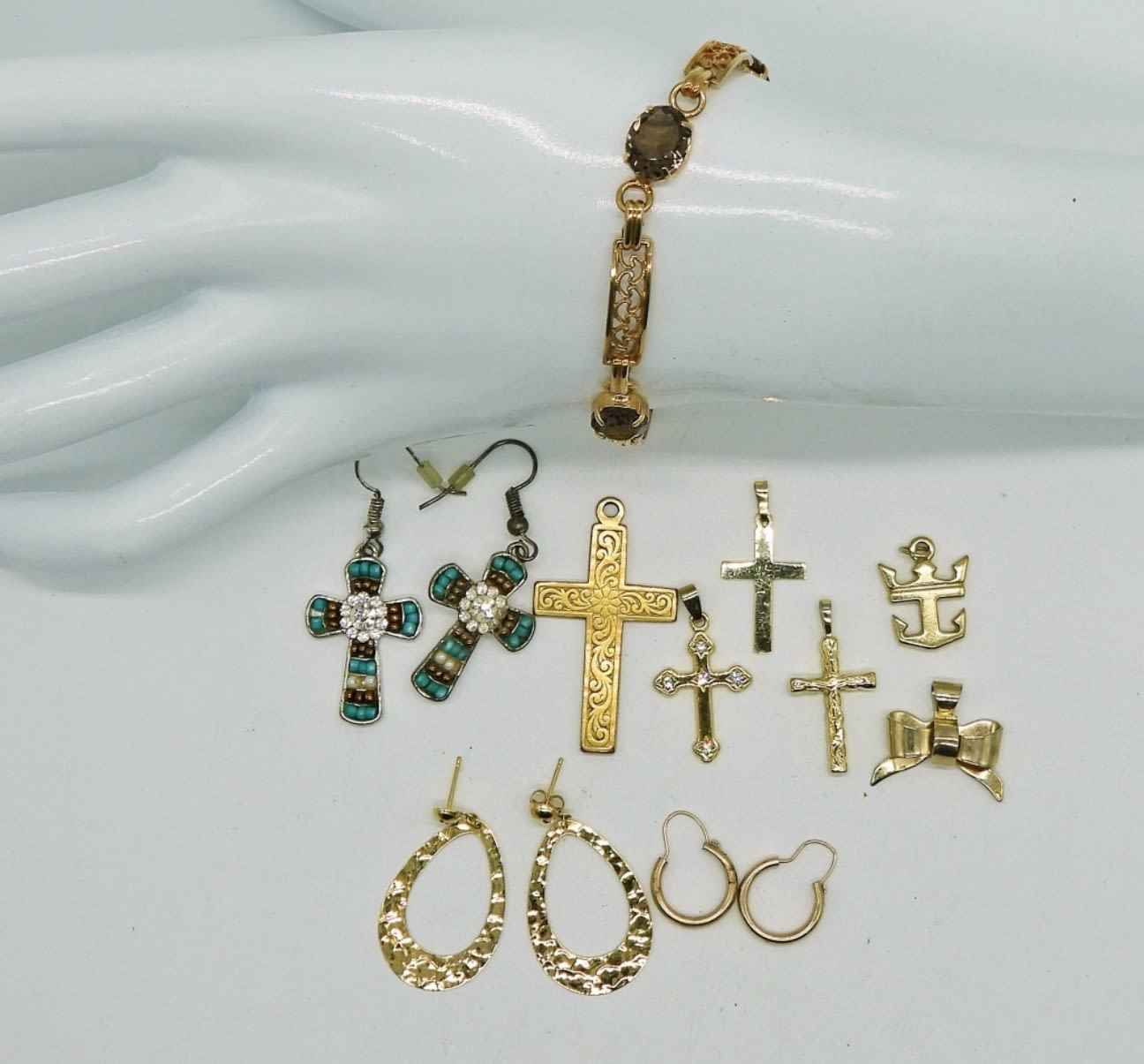 5 Gold Tone Cross Pendants, Beaded Cross Earrings, Gold Tone Bracelet with Gemstone & Gold Tone Earrings