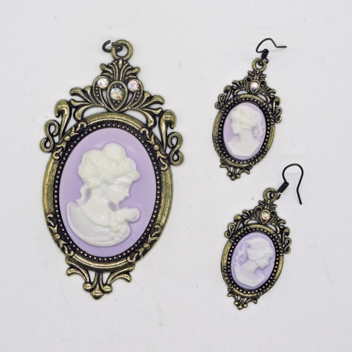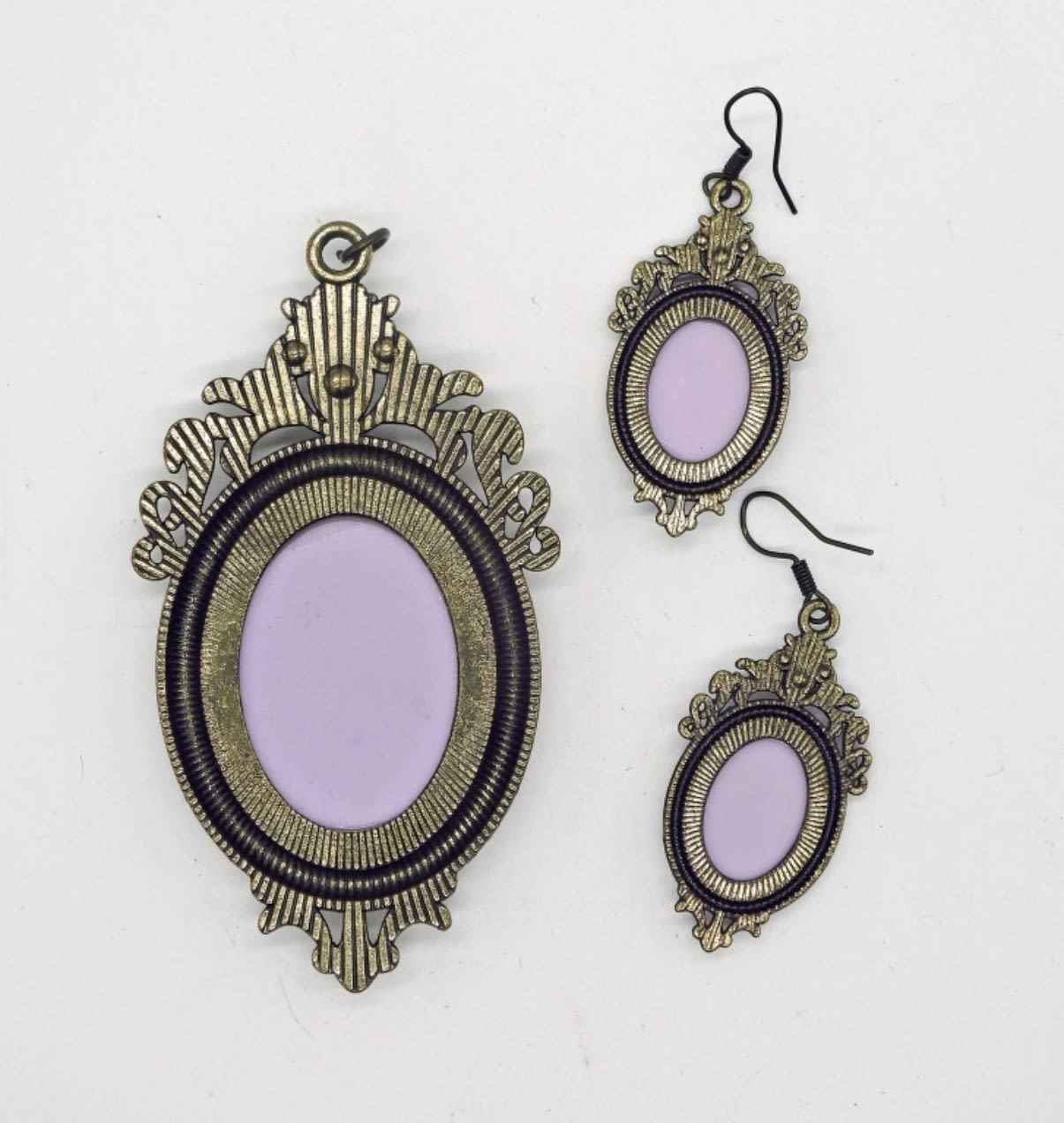 One 3 inch pendant, and one pair matching earrings. Super cute set!