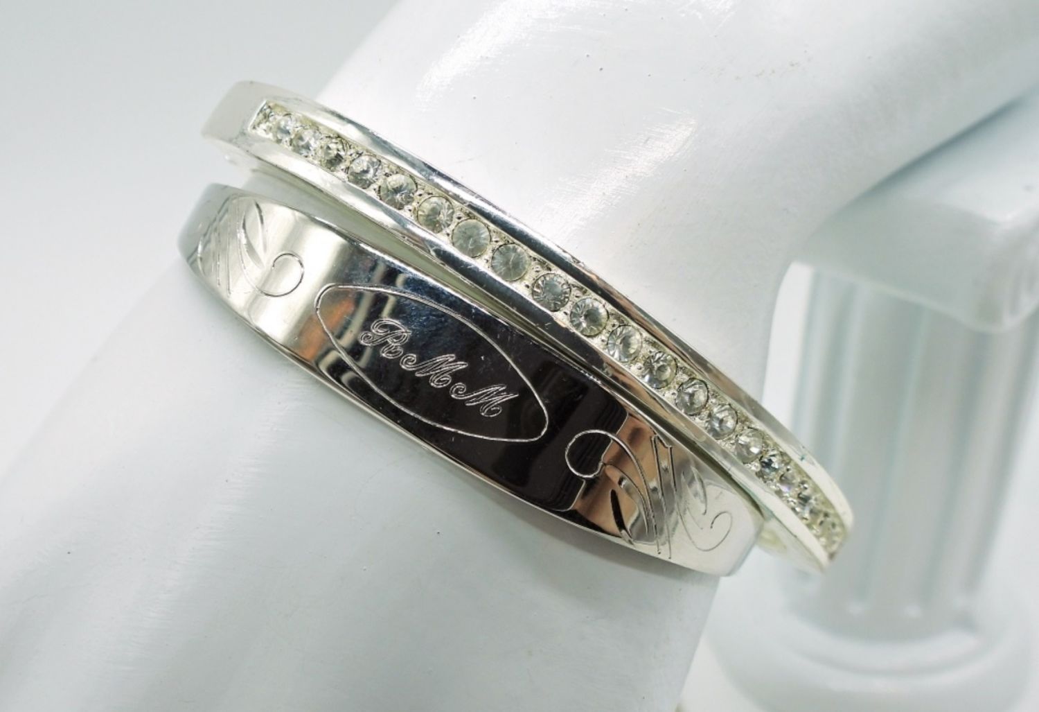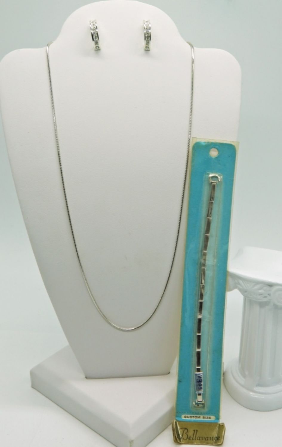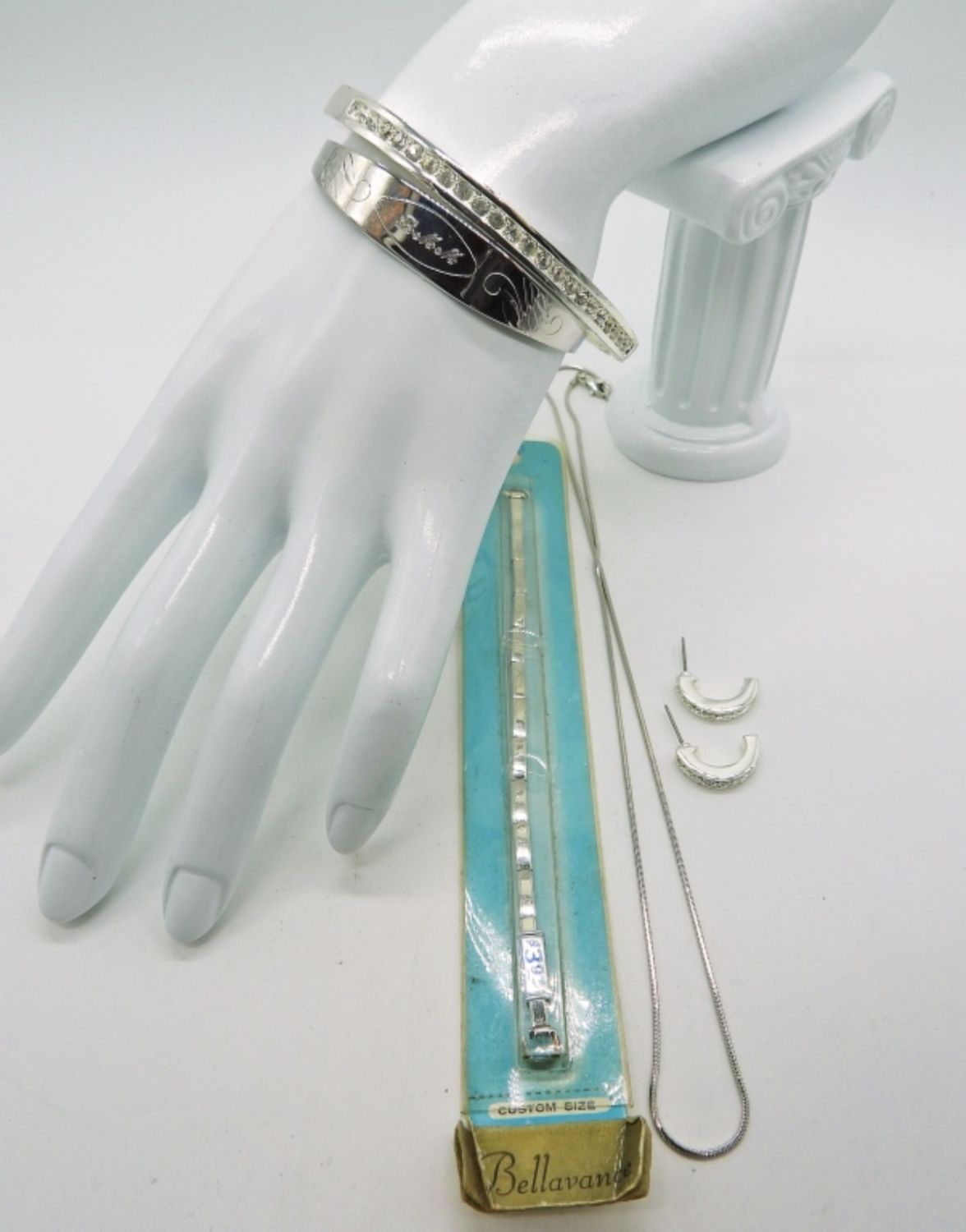 Two Silver Tone Bracelets with Engraving & Gemstones. Silver Tone Chain (16 in), Hoop Gemstone Earrings and Vintage Watch band still in the package.