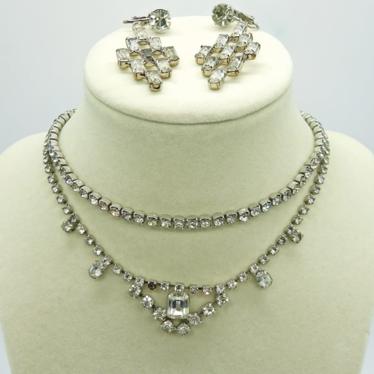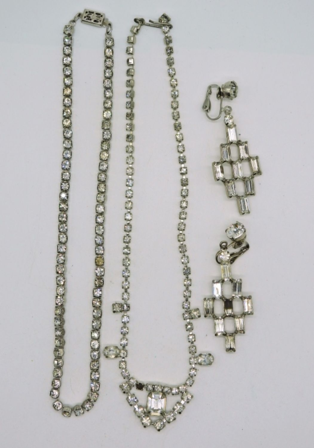 Two 14 inch, Vintage Rhinestone Chokers with a Pair of Clip On Rhinestone Dangle Earrings.