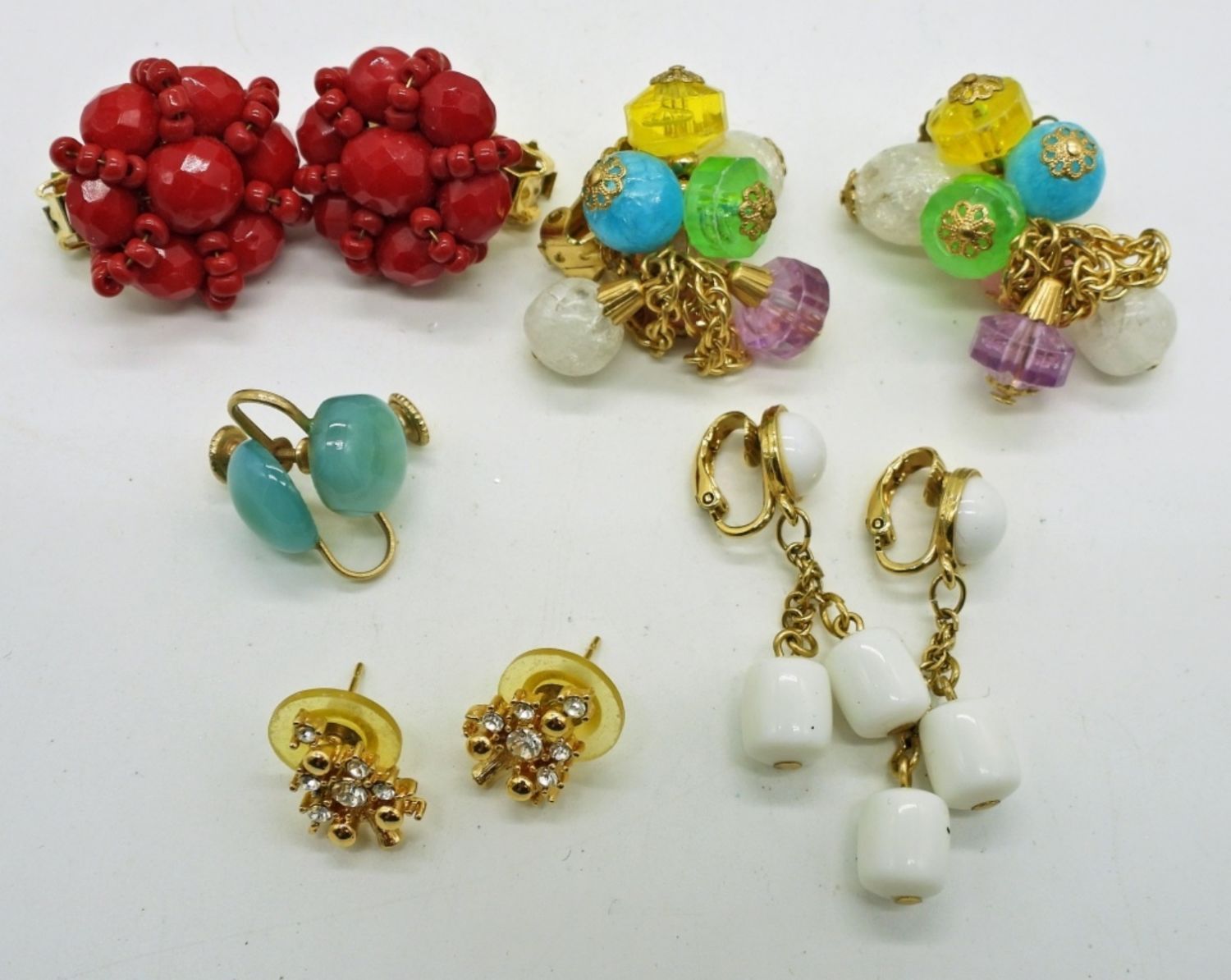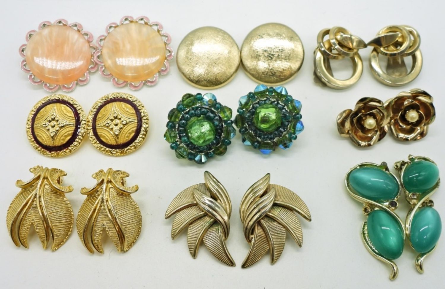 12 Vintage Clip on Earrings in Gold tone & 2 Pair of pierced earrings in Gold tone. Varying Gemstones, styles & colors.