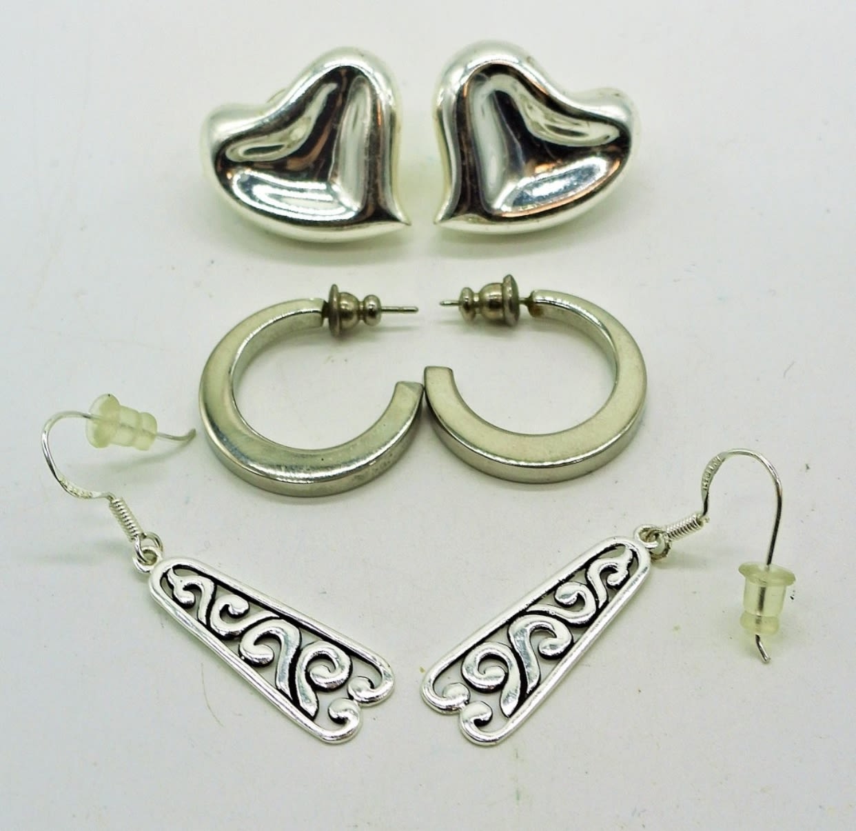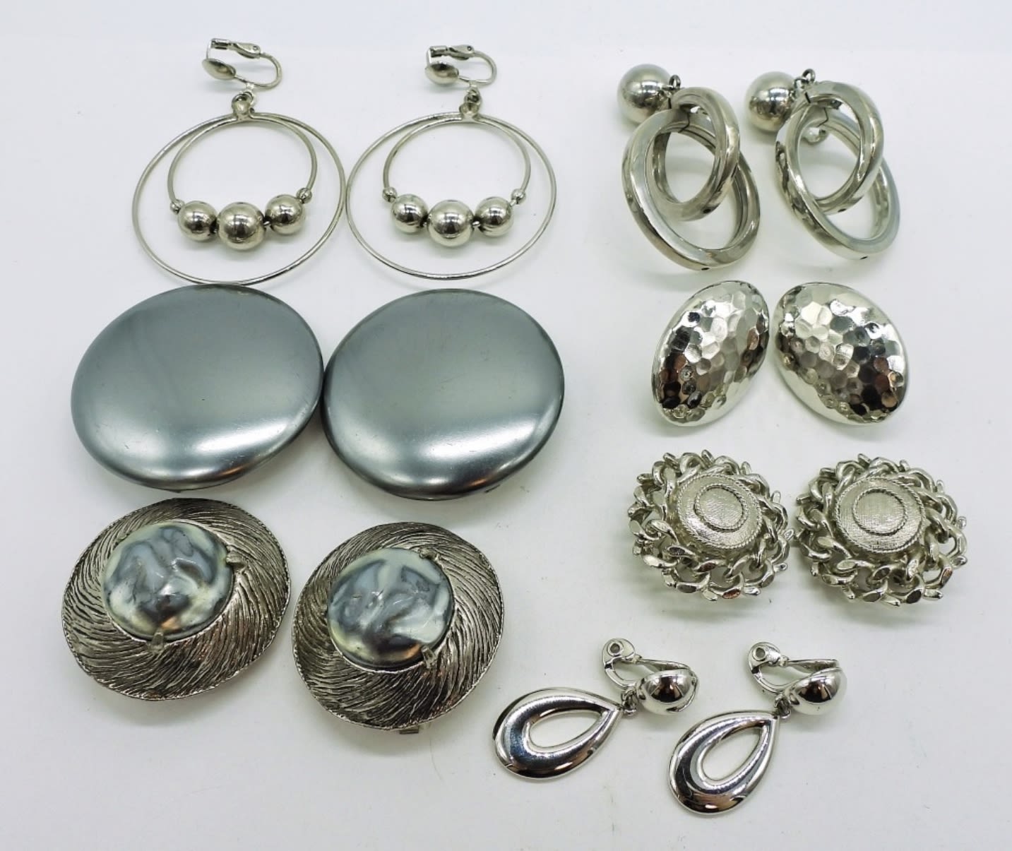 Seven sets of clip on silver tone earrings and Three sets of silver tone pierced earrings. Varying Sizes & Styles.