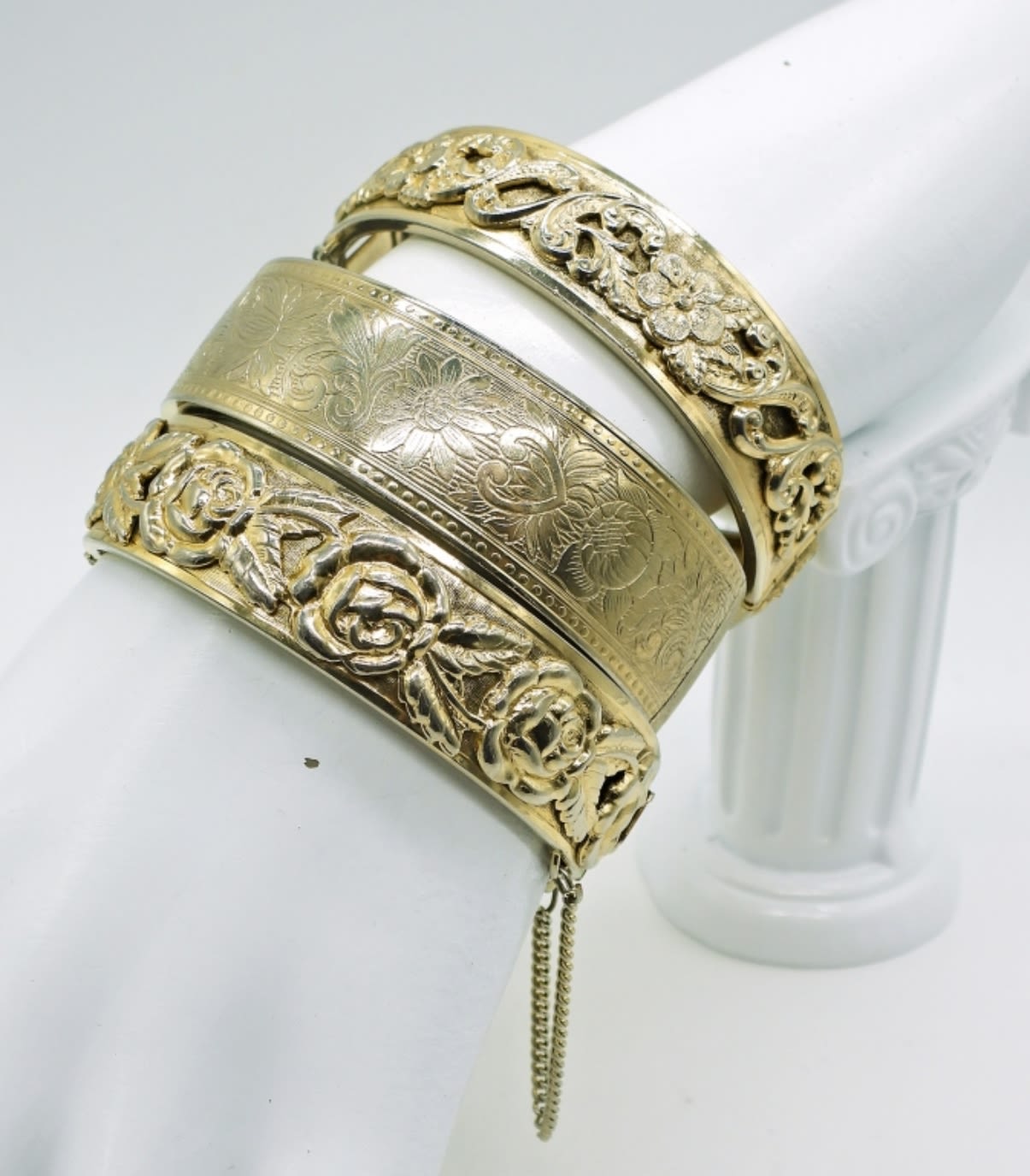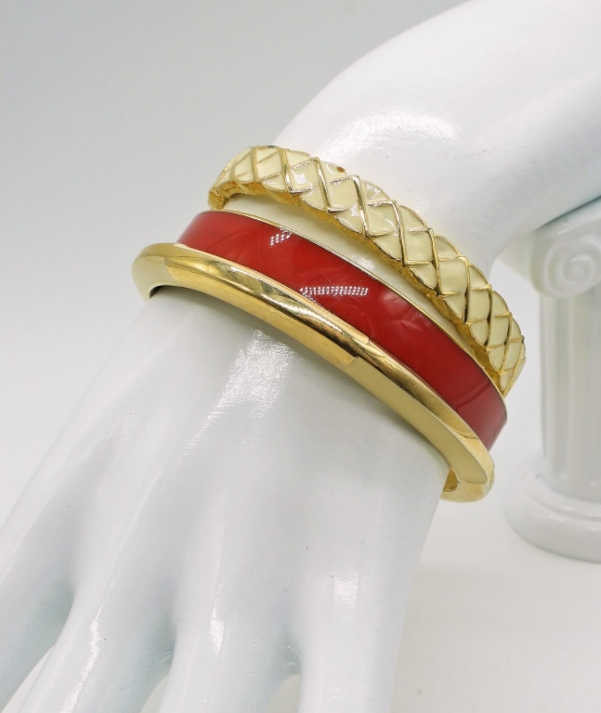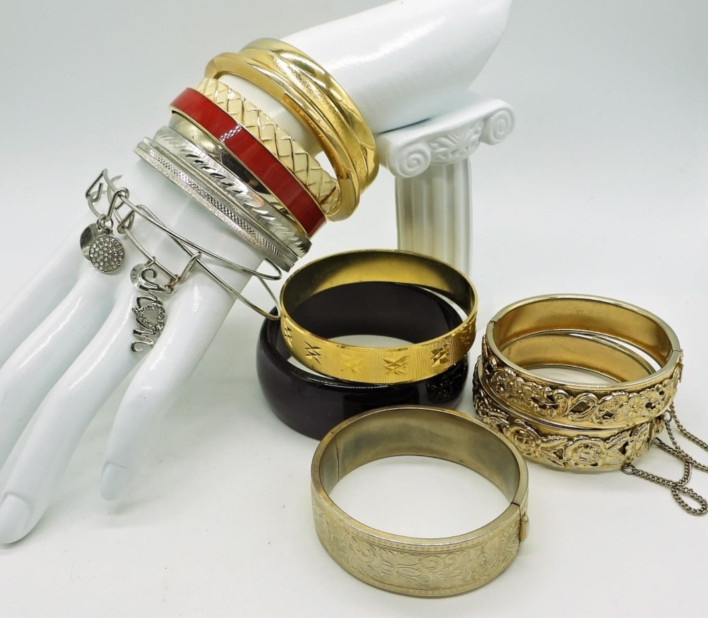 6 Gold Tone Bangles with Varying Designs, 5 Silver Tone Bangles, 3 Gold/Enameled Bangle & 1 Solid Black Bangle.