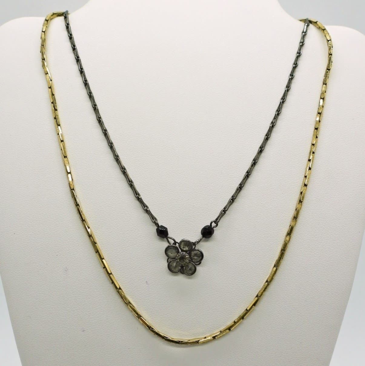 Petite Seiko Watch in Gunmetal, Gunmetal 16in Flower Necklace & Gold tone Chain 14 in.