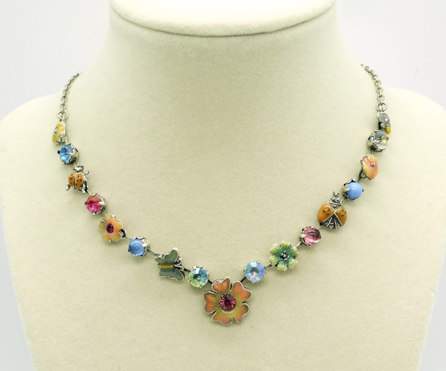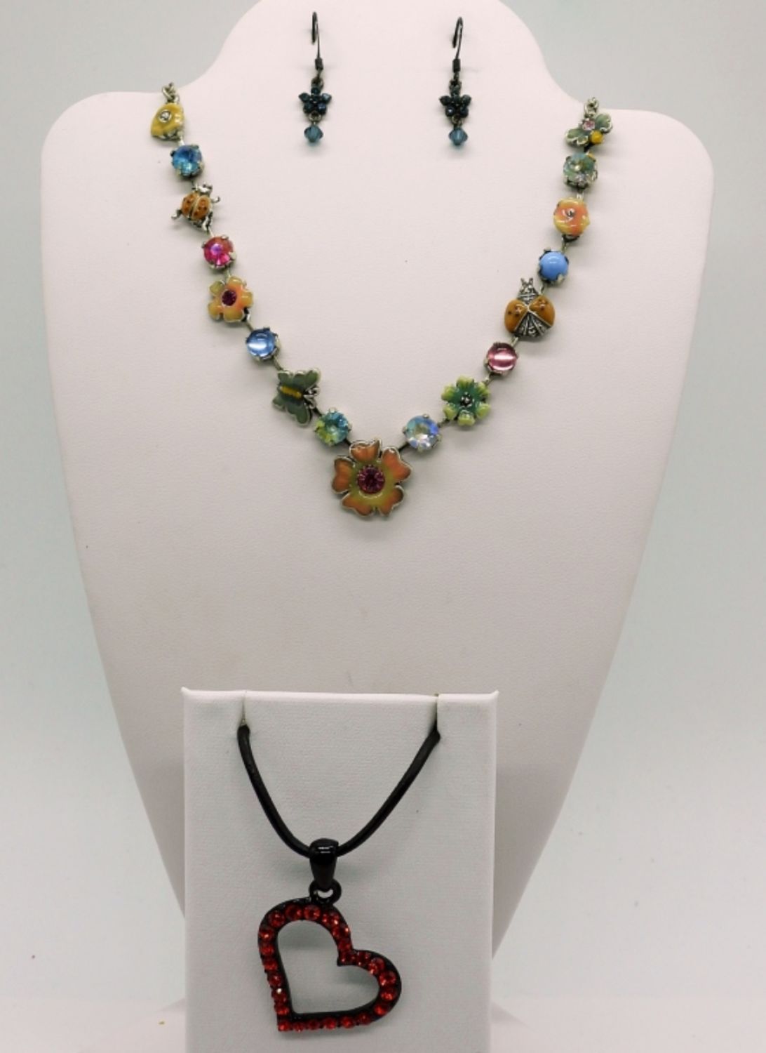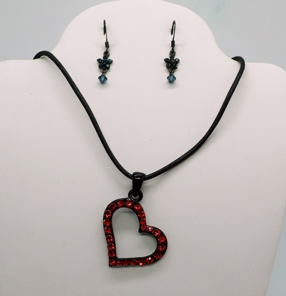 Silver Tone Enamel & Rhinestone Necklace, Leather Cord with Heart Pendant & Petite Blue Floral Earrings.