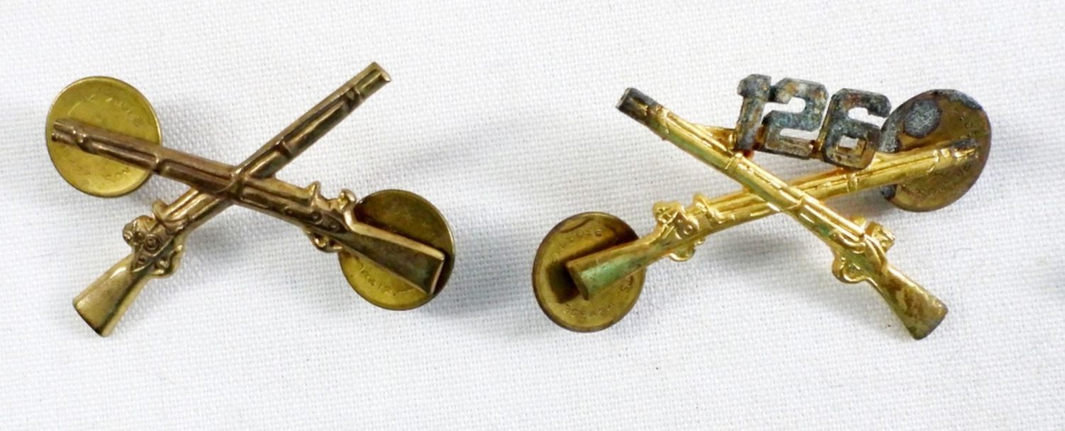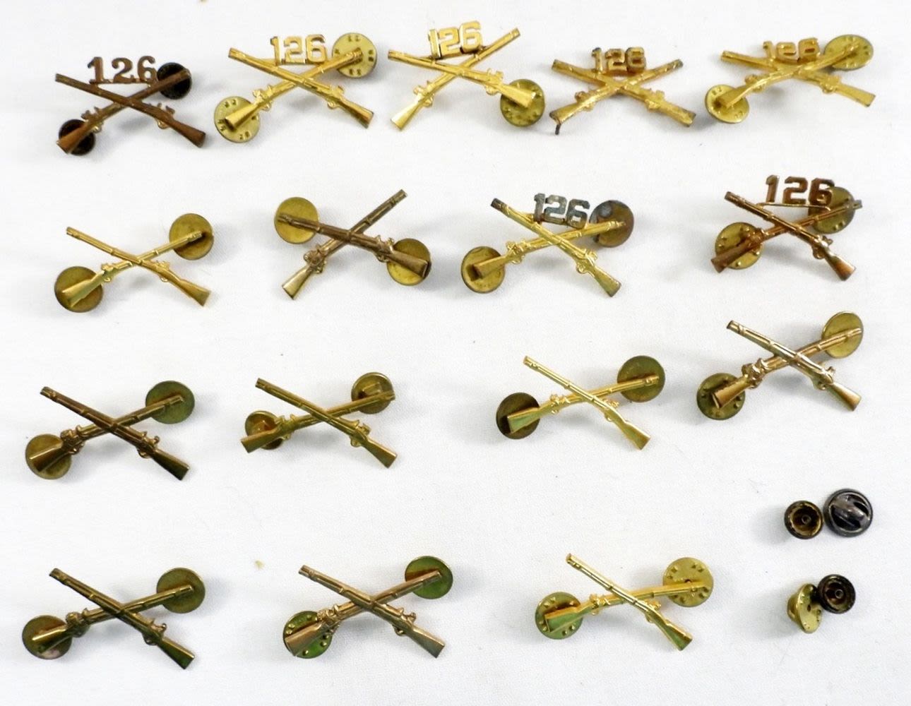 (7) 126th INFANTRY with one missing a prong, (9) RIFLE PINS