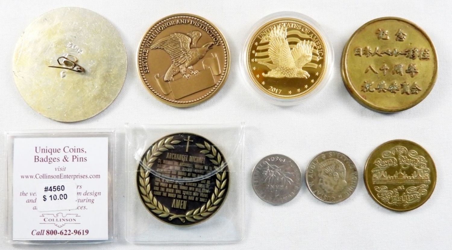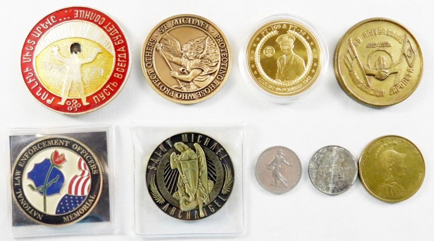 ENFORCEMENT OFFICERS MEMORAIL, (2) ST MICHAEL, (2) FOREIGN MEDALLION / PIN, (3) FOREIGN COINS