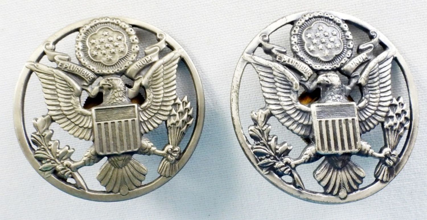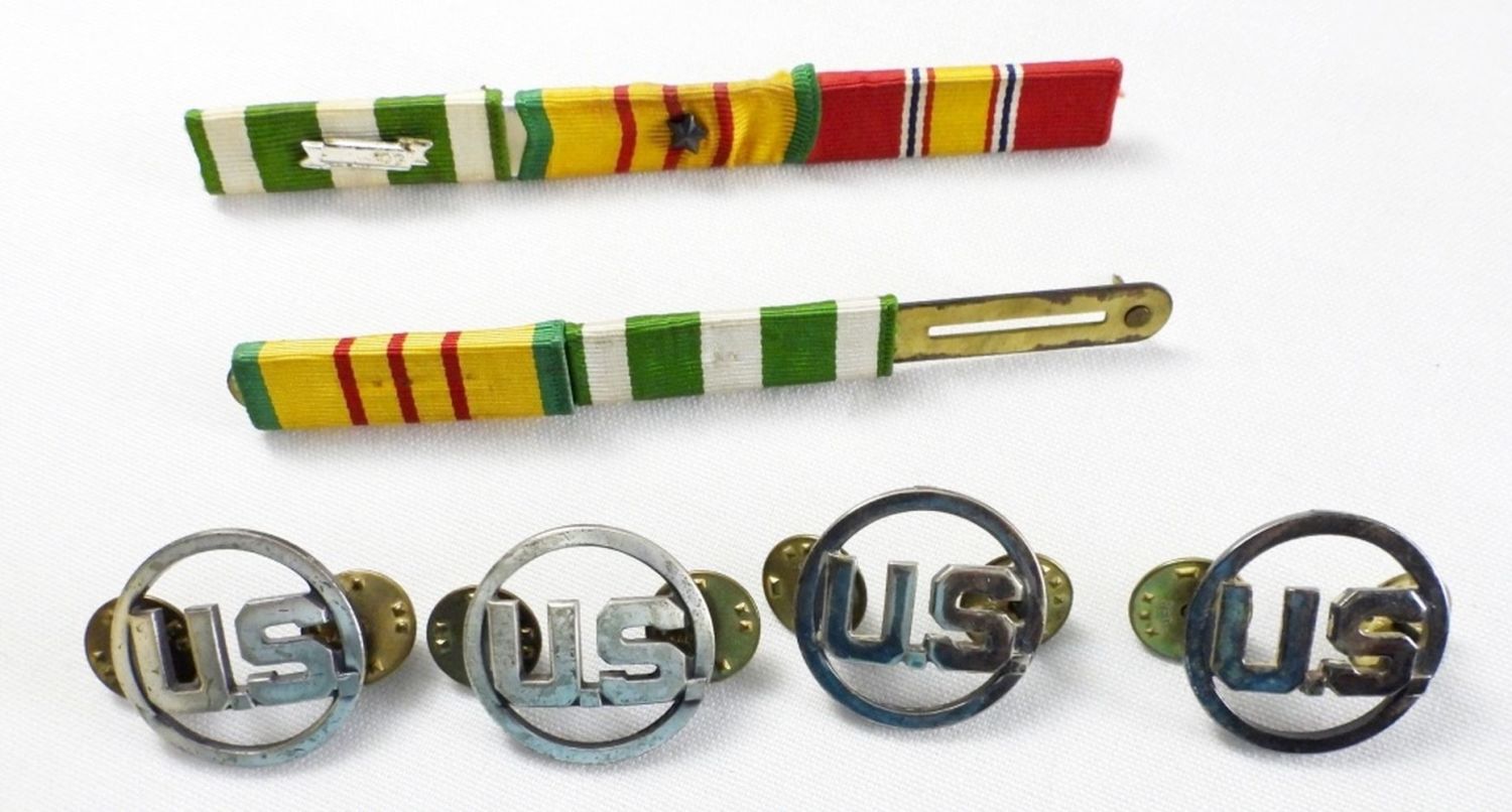 33″ & 36″ BELTS, (3) BUCKLES, (15) PATCHES, (4) U.S. PINS, (2) EAGLE HAT PINS, TIE CLASP & (2) BAR MEDALS