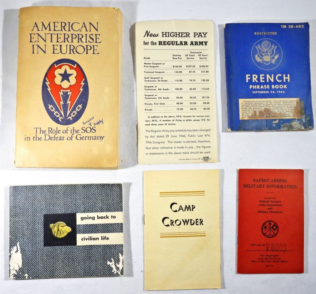 1945, SAFEGUARDING MILITARY INFORMATION GUIDE, AMERICAN ENTERPRISE IN EUROPE, CAMP CROWDER BOOKLET & ARMY PAY SCALE