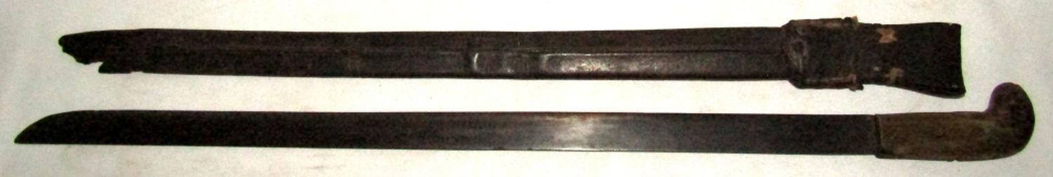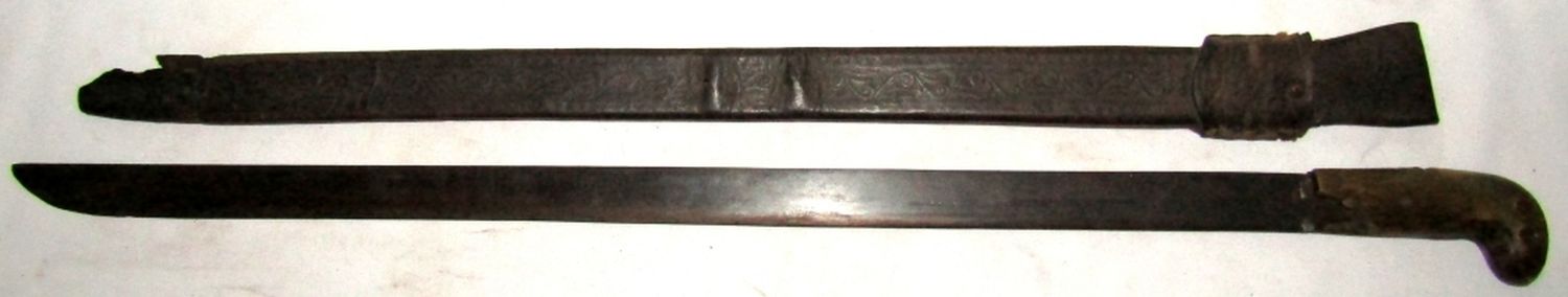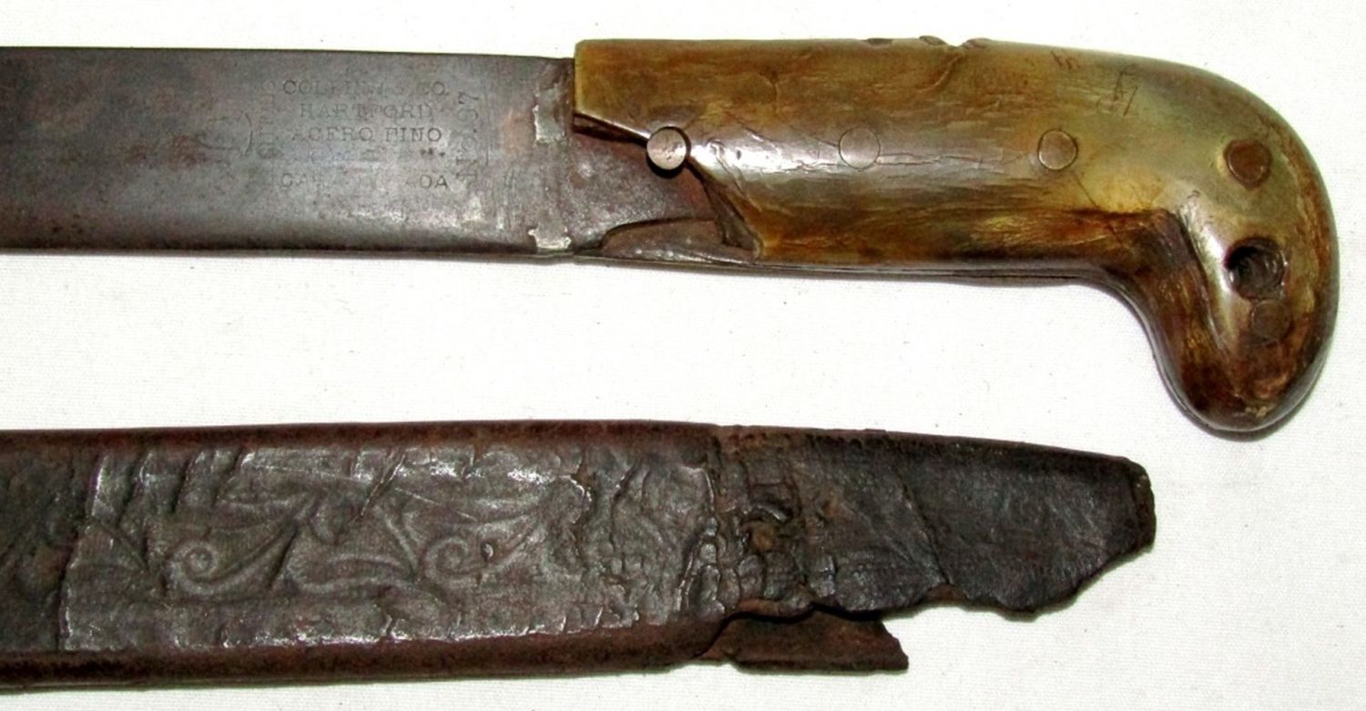 Blade Marked “Legitimus Collins & Co. Hartford Acero Fino Calidad Garantizada No. 87″; 27.5″ Blade, 32” Overall. (Blade handle had broken piece, pictured; Scabbard is torn at the tip, pictured.)