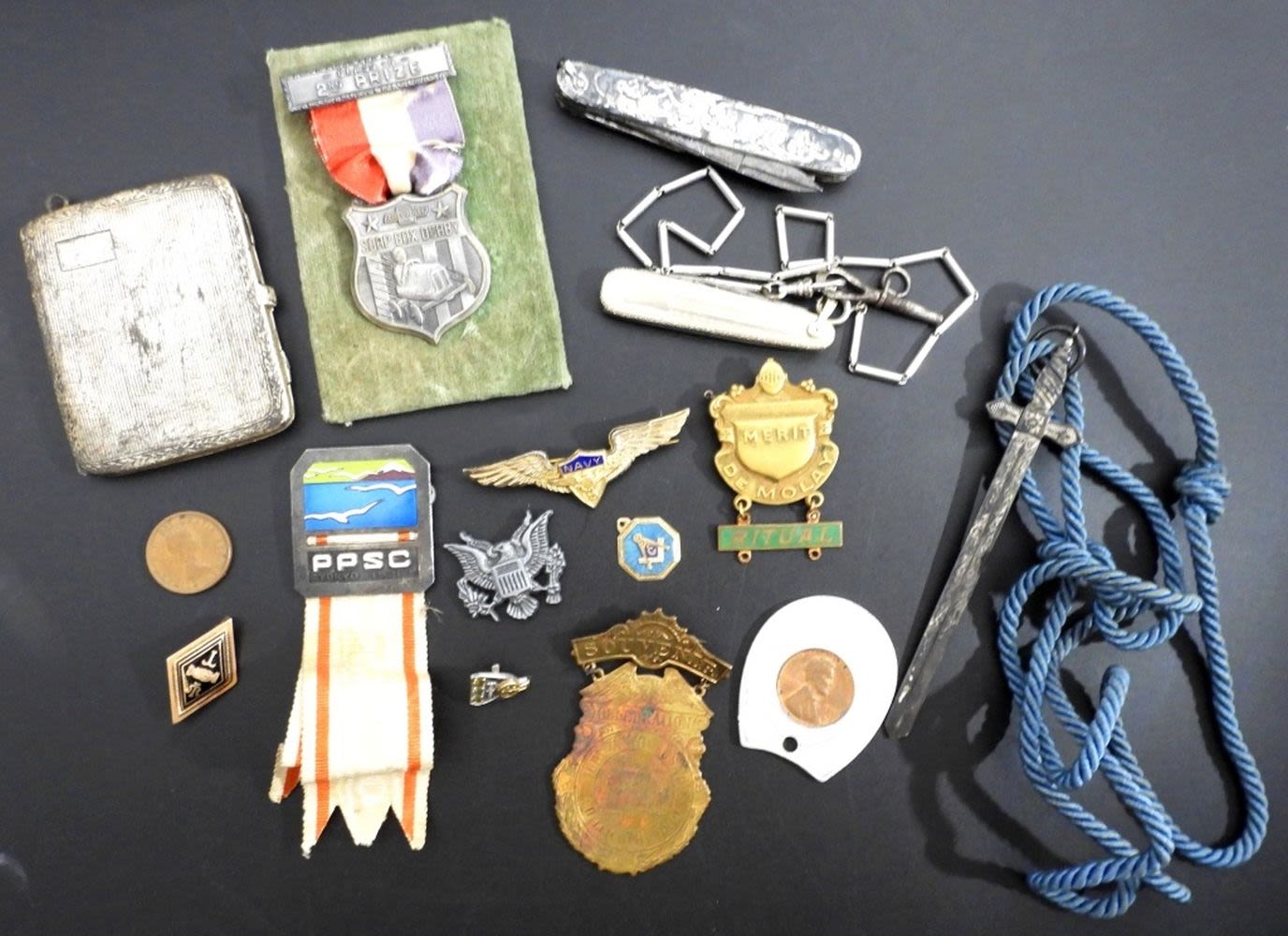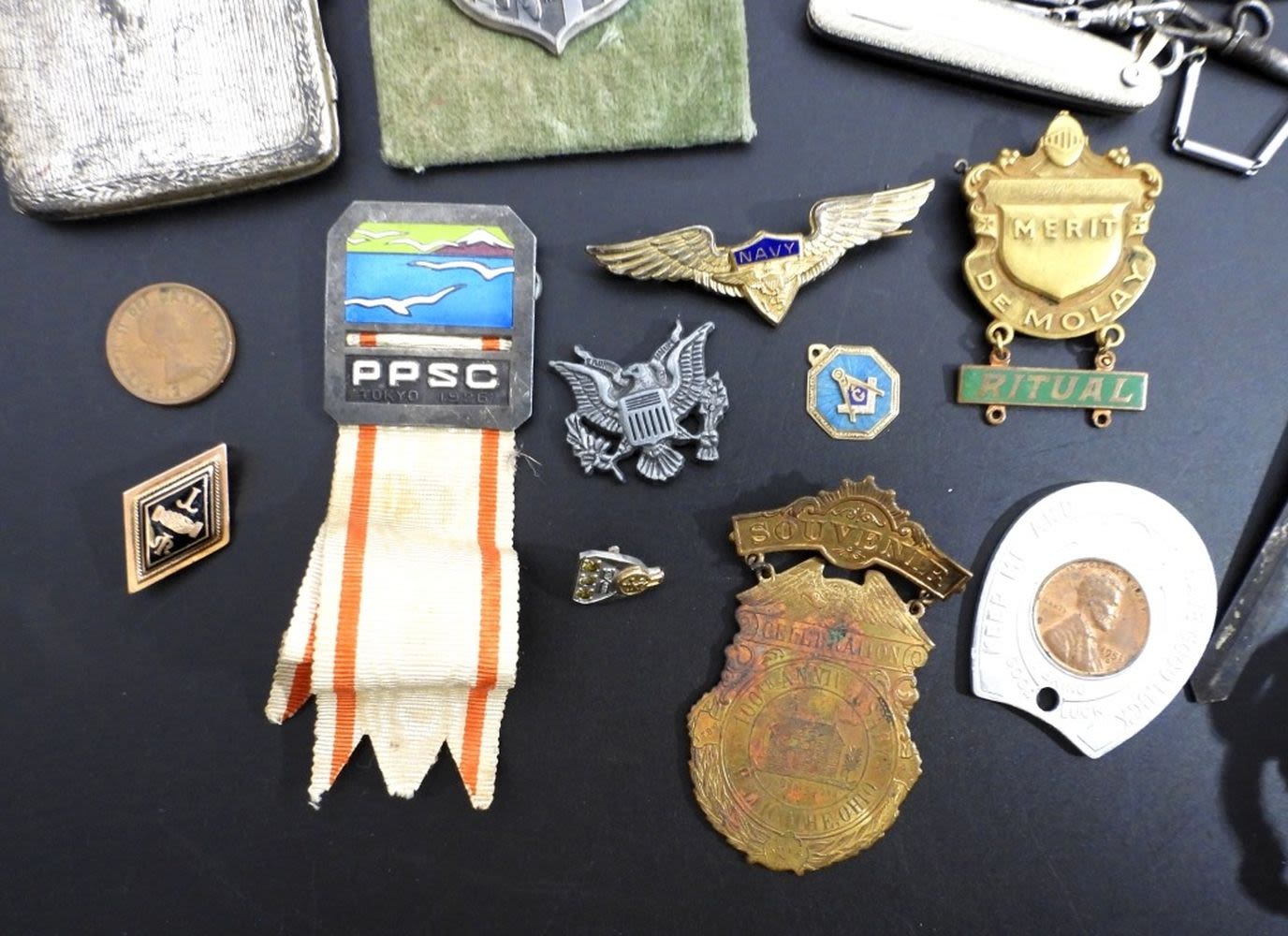 MASONIC GOLD FILL PINS, POCKETWATCH CHAIN / KNIFE, NAVY PIN, MERIT PIN & MORE