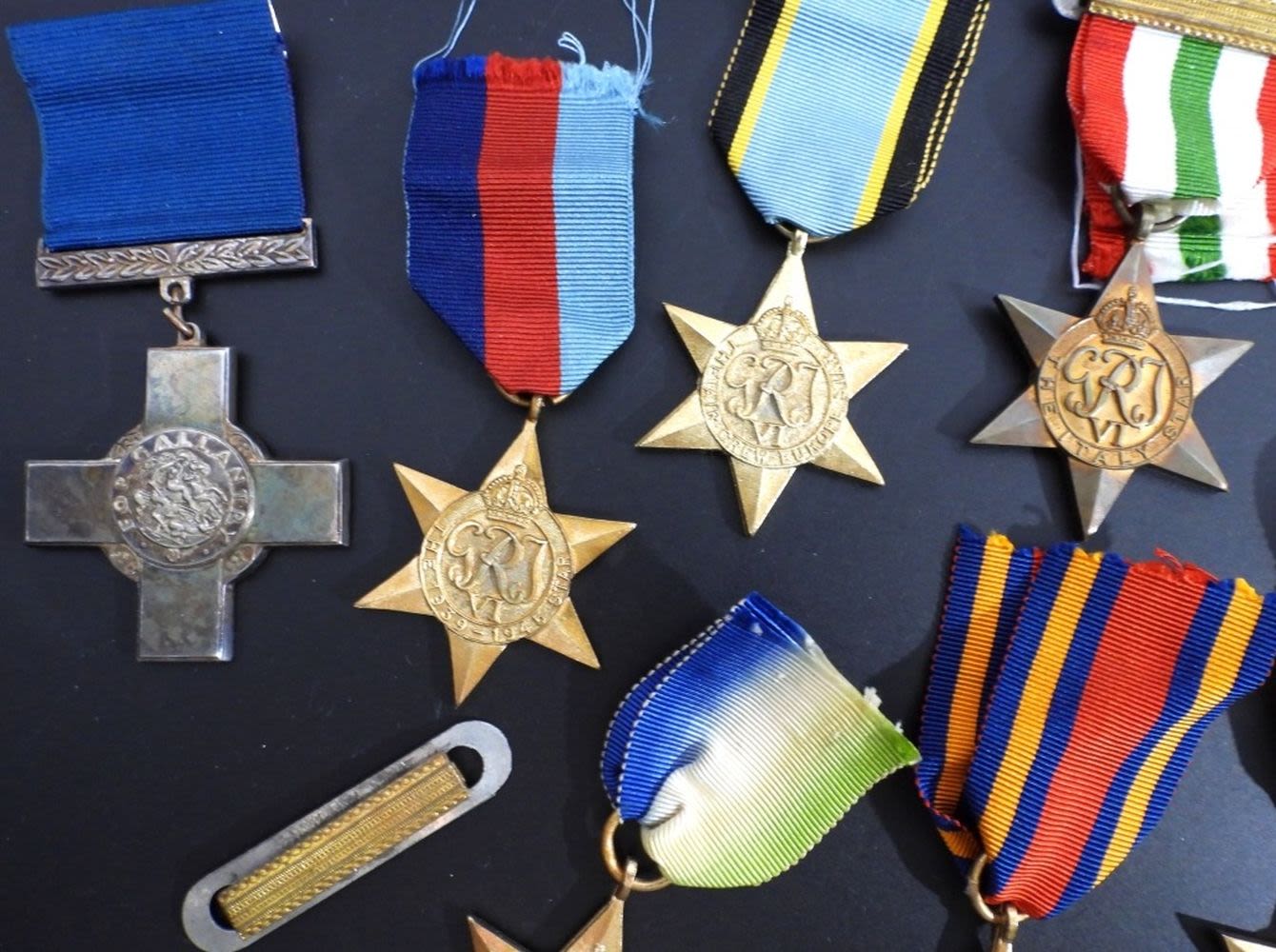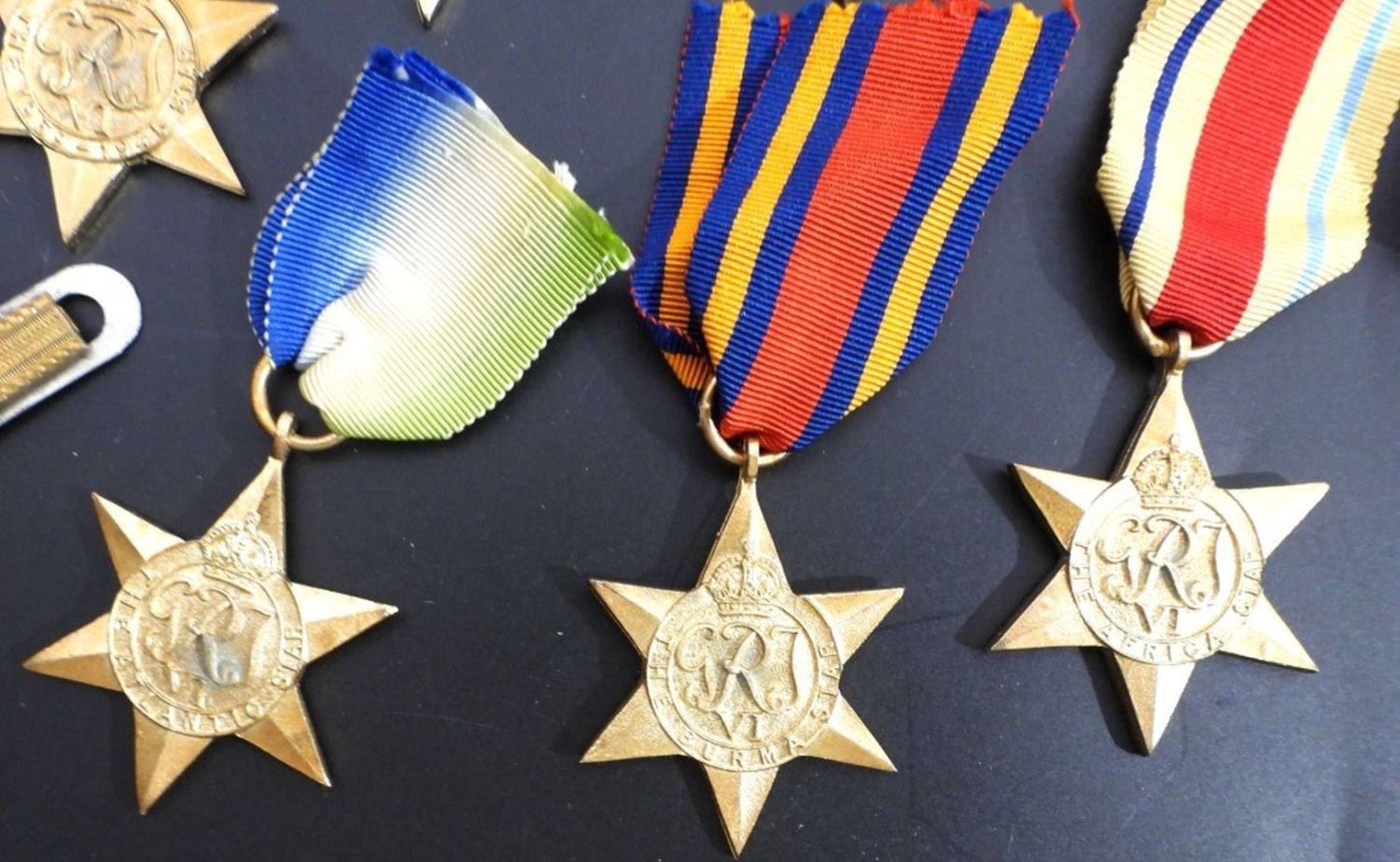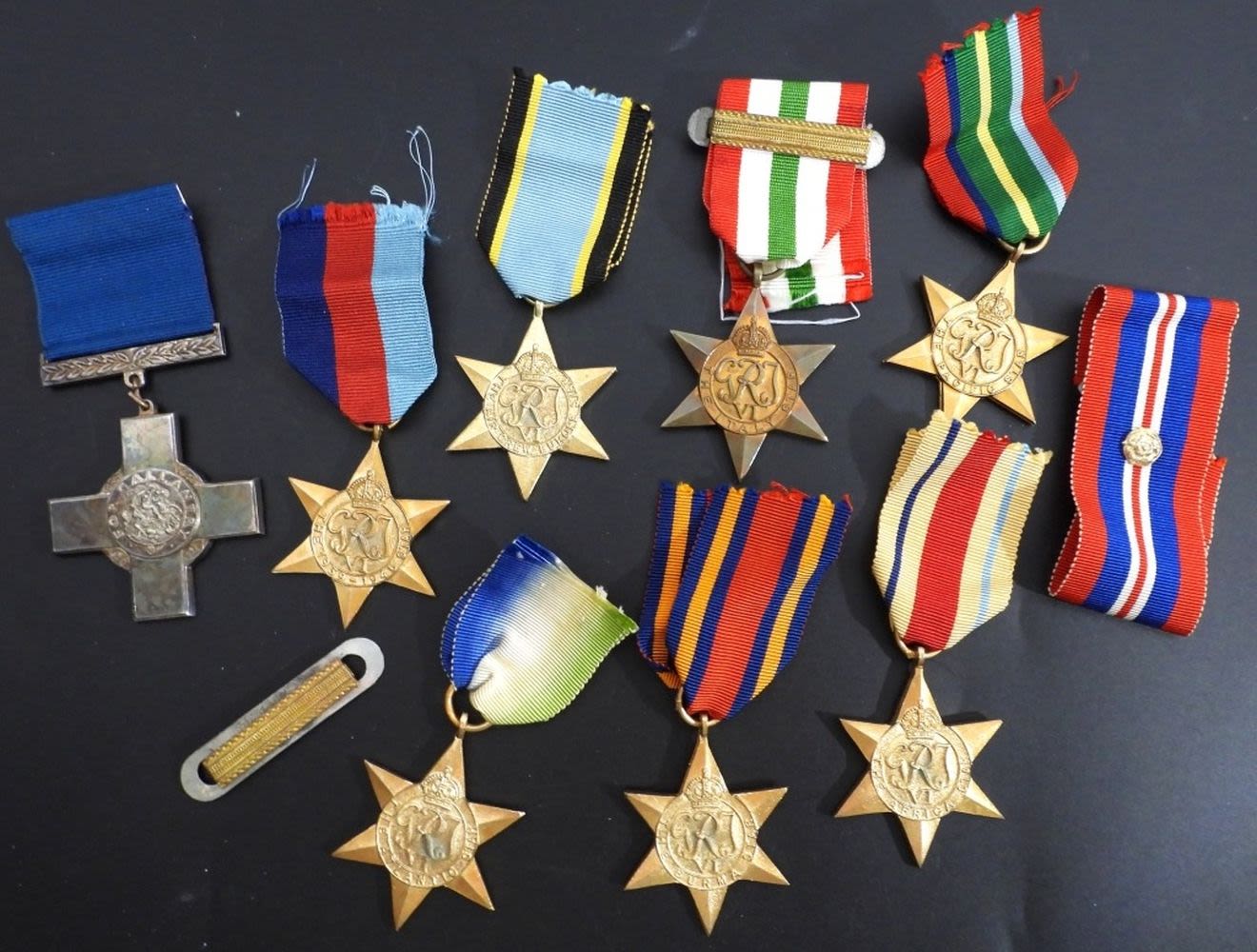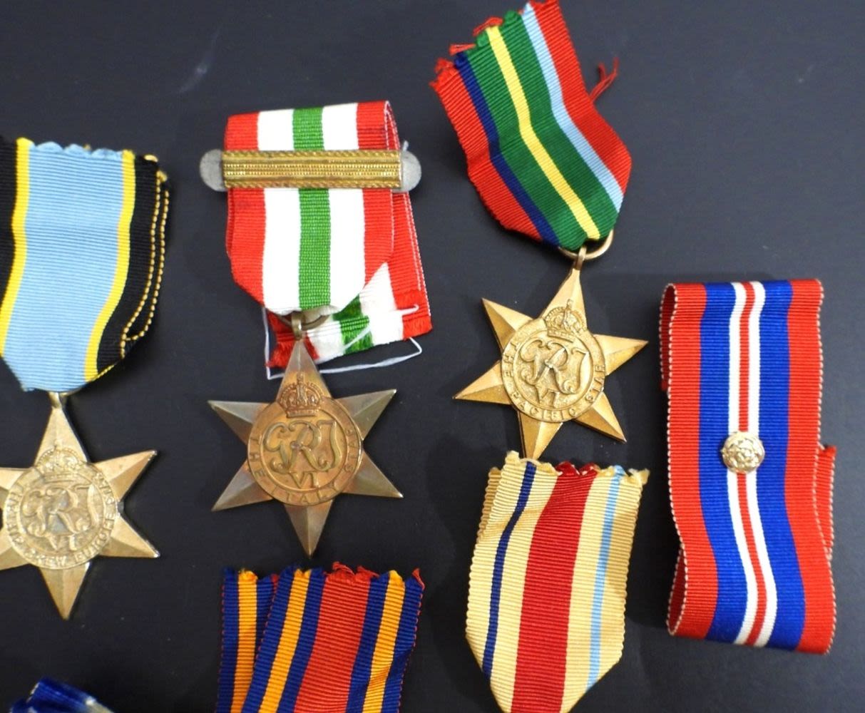 (1) THE ITALY STAR AUTHENTIC (6) REPLICA ATLANTICBURMA, AFRICA, PACIFIC, AIR CREW EUROPE, 1939-1945 plus “COPY” STAMPED FOR GALANTYRY RIBBON