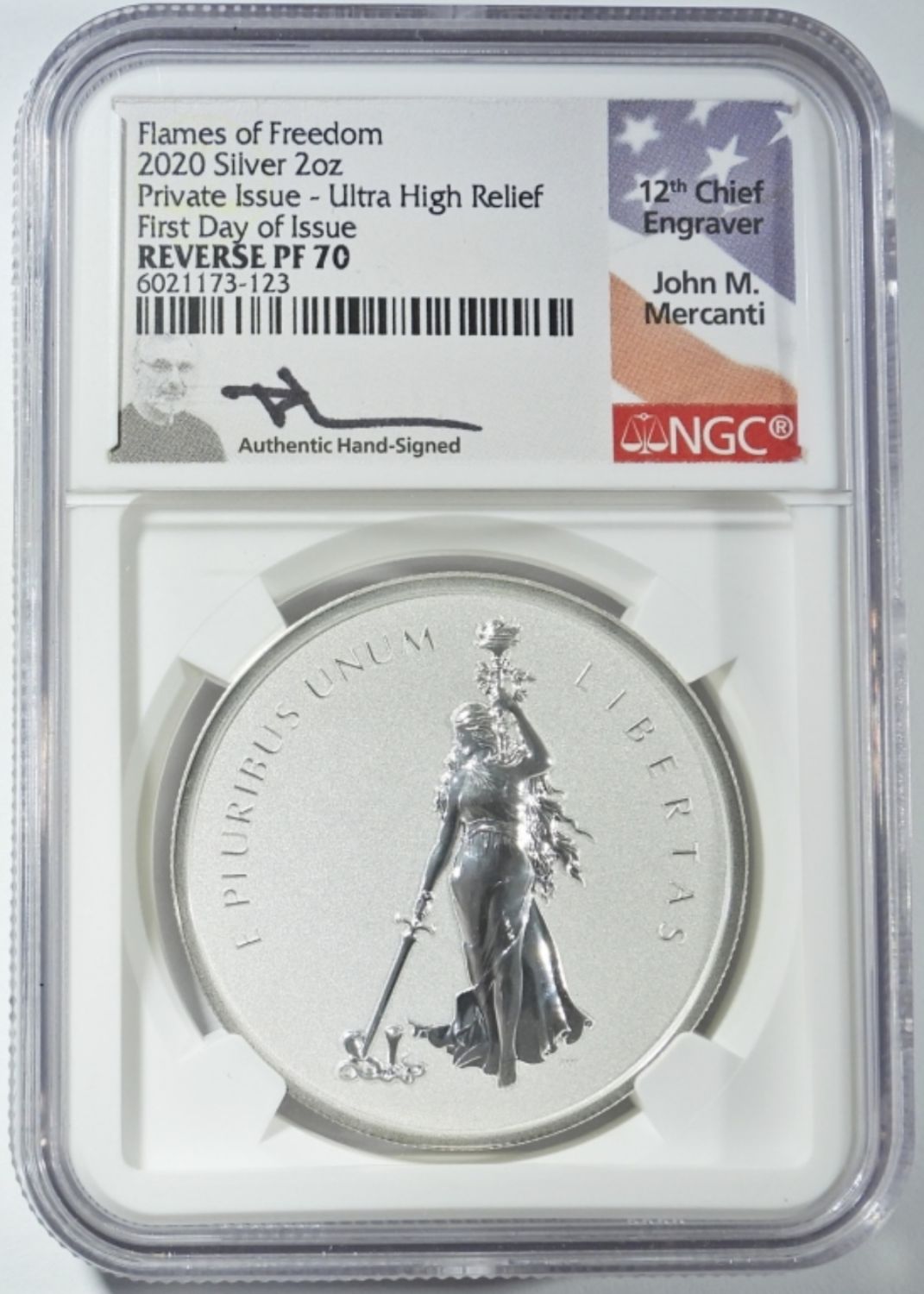 FIRST DAY OF ISSUE, SILVER 2oz, PRIVATE ISSUE – ULTRA HIGH RELIEF. DON EVERHART & JOHN MERCANTI SIGNED.