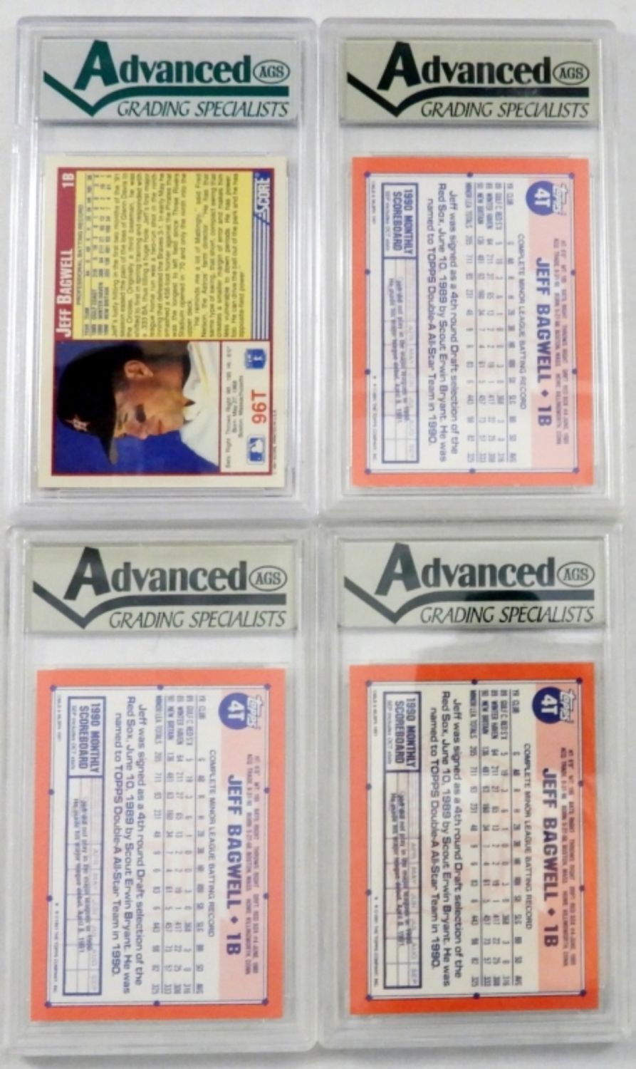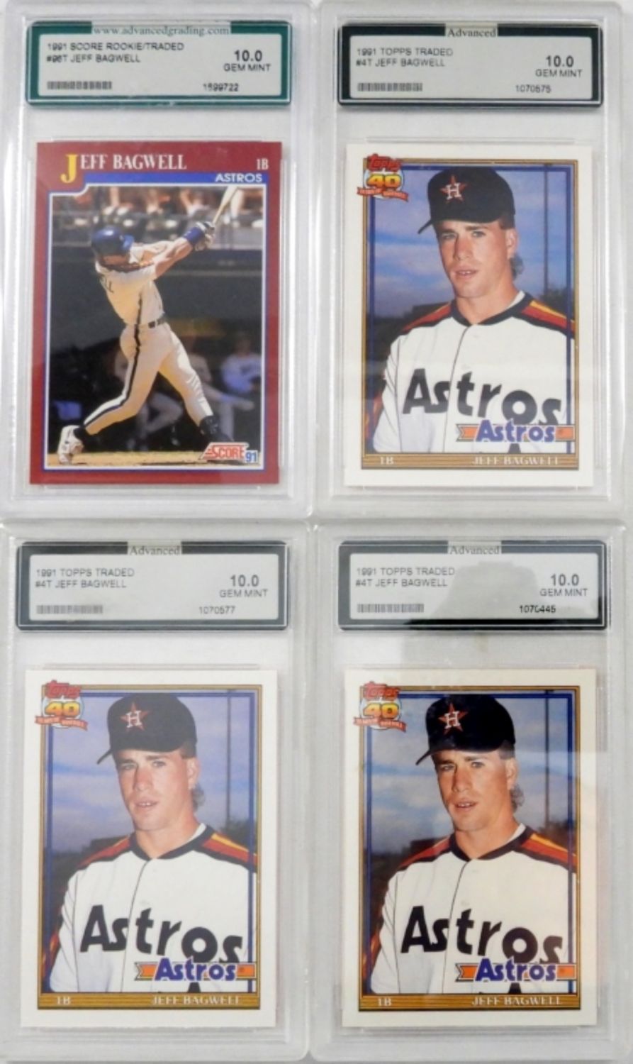 1991 SCORE ROOKIE / TRADED #96T JEFF BAGWELL BASEBALL CARD GRADED BY AGS 10 GEM MINT; ALSO (3) 1991 TOPPS TRADED #4T JEFF BAGWELL GRADED BY AGS GEM MINT 10