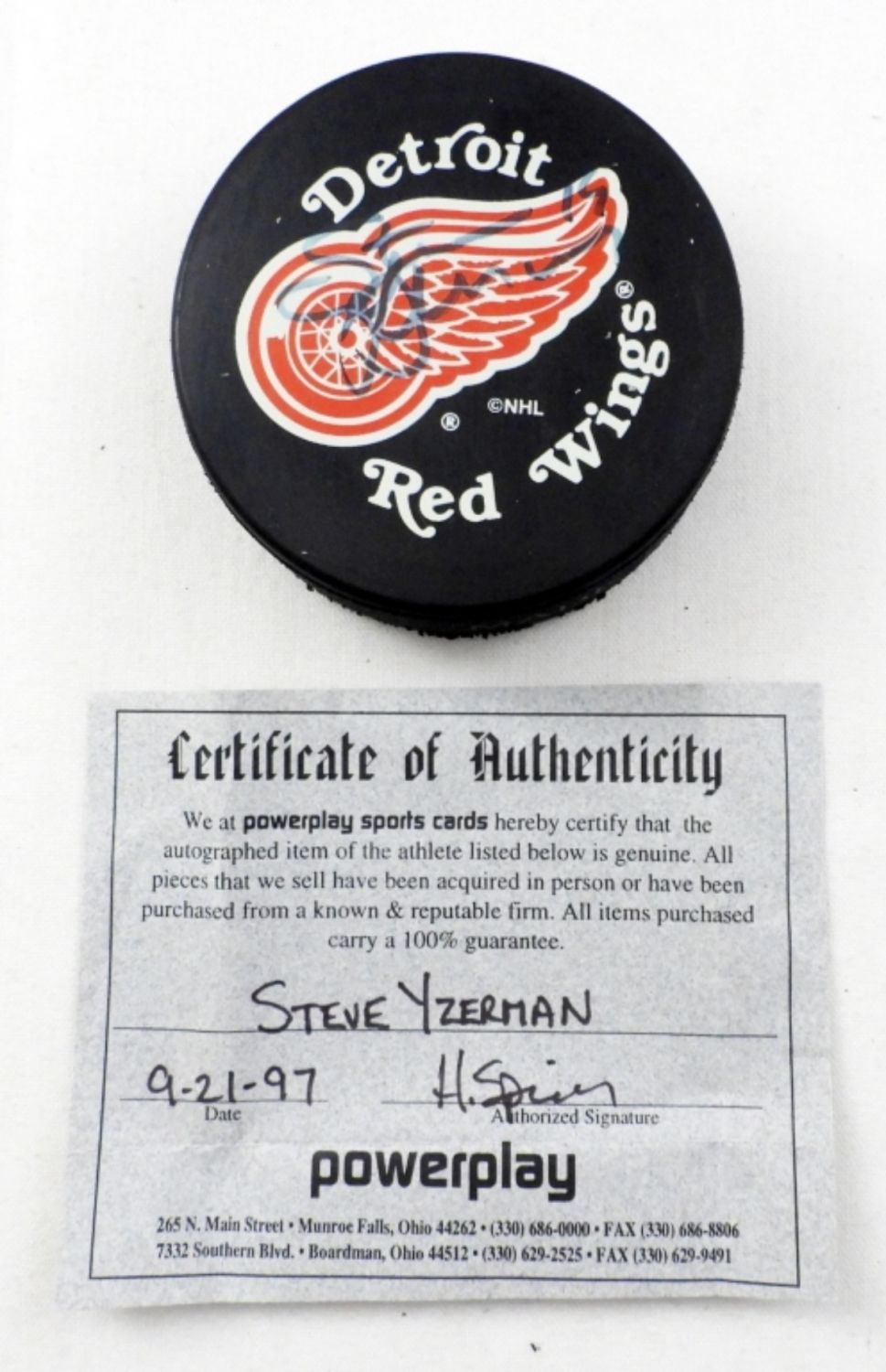 SIGNED ON THE OFFICIAL LICENSED PRODUCT OF THE NHL RED WINGS, COA IS FROM POWERPLAY SPORTS CARDS 1997
