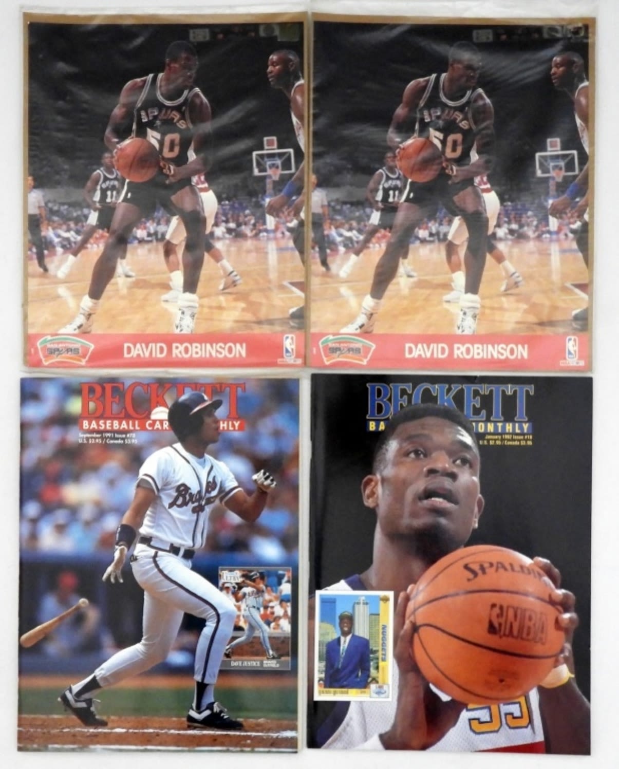 2 DUPLICATES OF DAVID ROBINSON FROM SAN ANTONIO SPURS NBA HOOPS ACTION PHOTOS, 2- BECKETT BASKETBALL CARDS AND MONTHLY 1990 AND 1992 DIKEMBE MUTOMBO AND DAVID ROBINSON ON THE COVERS, 1 SPORTS ILLUSTRATED SHAQUILLE O’NEAL ON THE COVER, 1 RUNNIN’ REBEL BASKETBALL ’90-91 OFFICIAL GAME PROGRAM