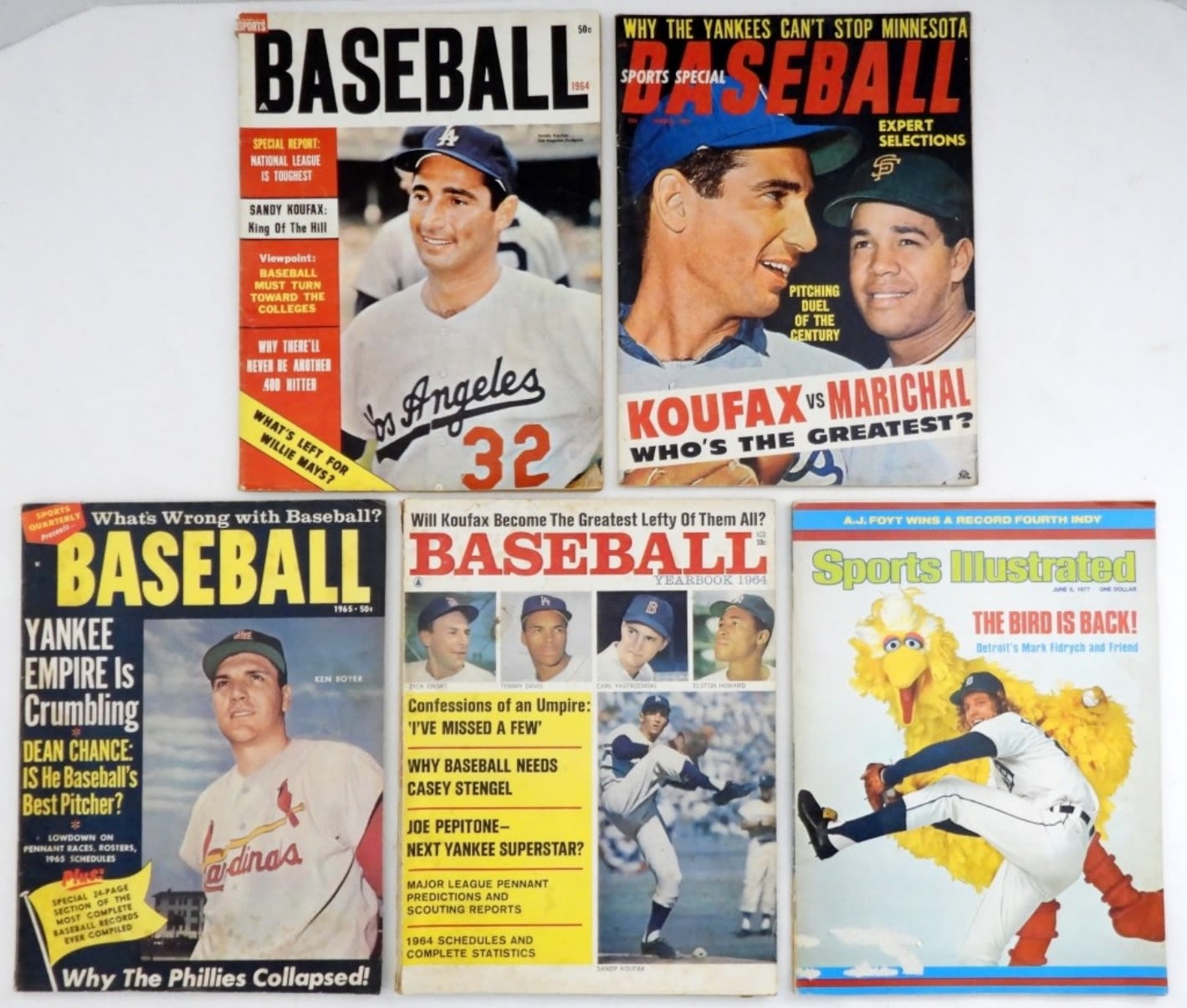 1- SPORTS ILLUSTRATED 1977 WITH MARK FIDRYCH, 1- SPORTS SPECIAL BASEBALL 1966 KOUFAX AND MARICHAL, 1-COMPLETE SPORTS BASEBALL 1964 SANDY KOUFAX,1-BASEBALL YEARBOOK 1964, AND 1- BASEBALL 1965