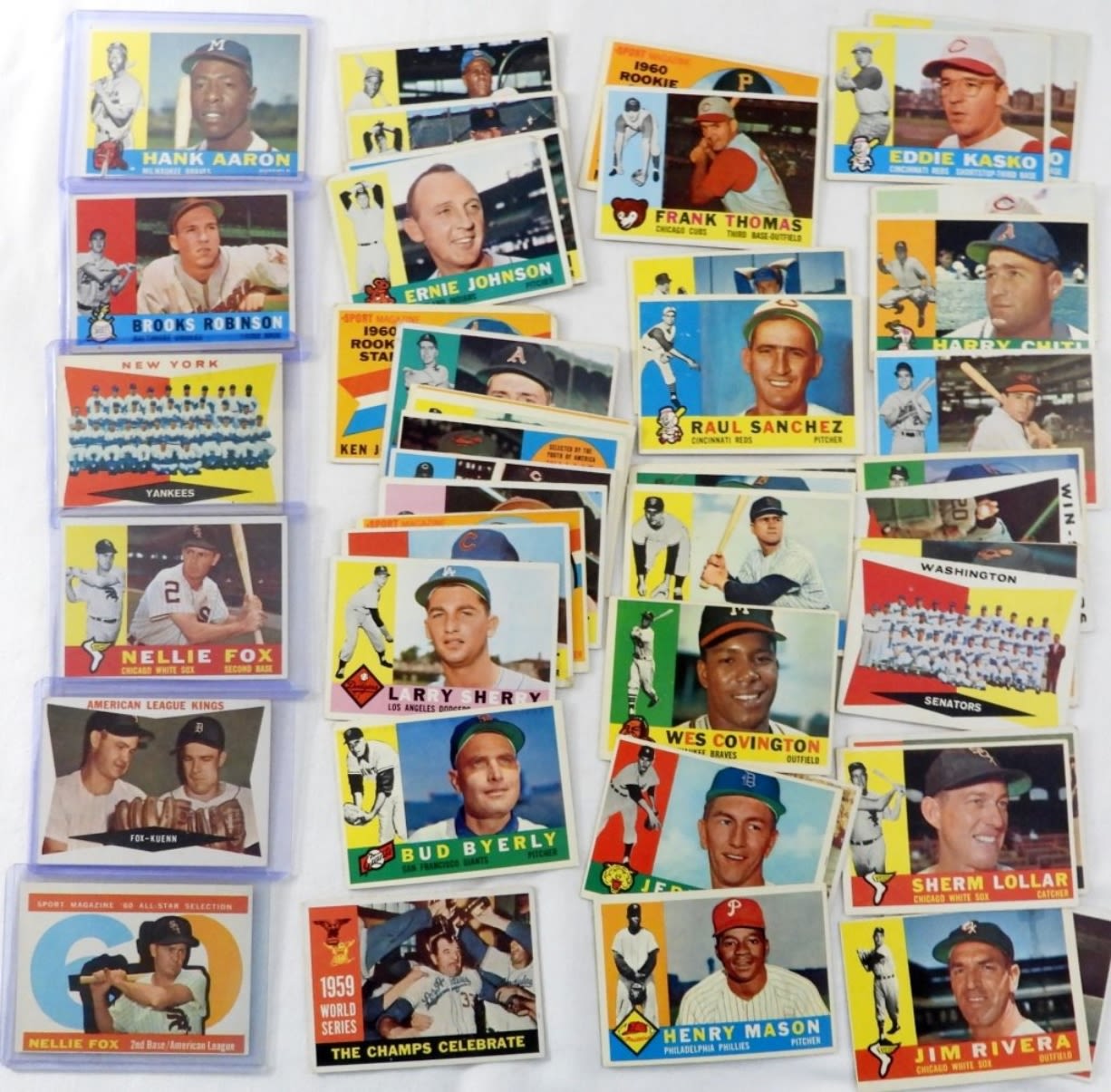 #300 AARON FAIR with a sizeable tear, #28 B. ROBINSON VGEX, #332 YANKEES marked, NELLIE FOX #100, #429, #555 plus WORLD SERIES CARDS & MORE – MOSTLY VGEX+ / EX with (7) LESSER CONDITION