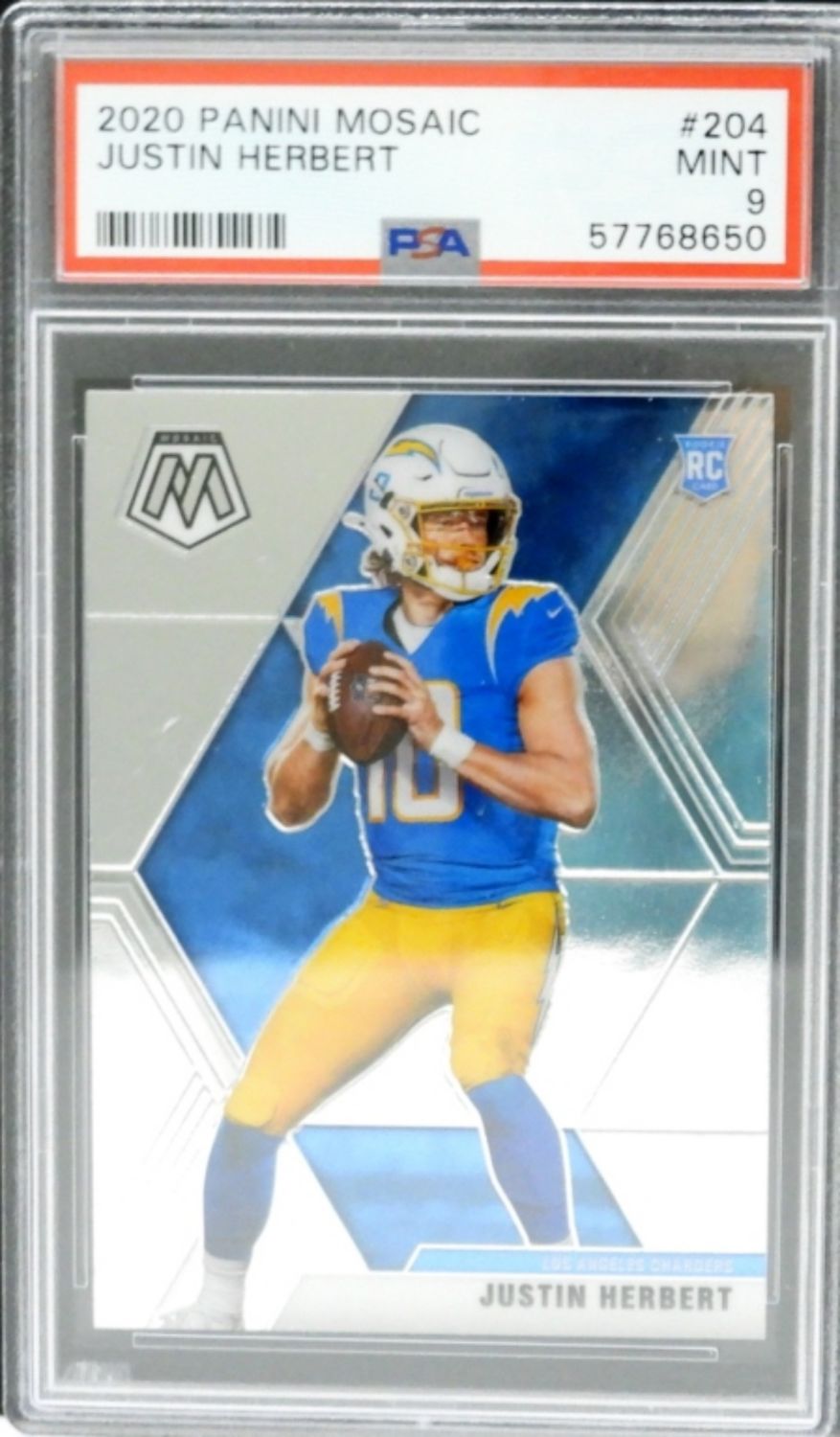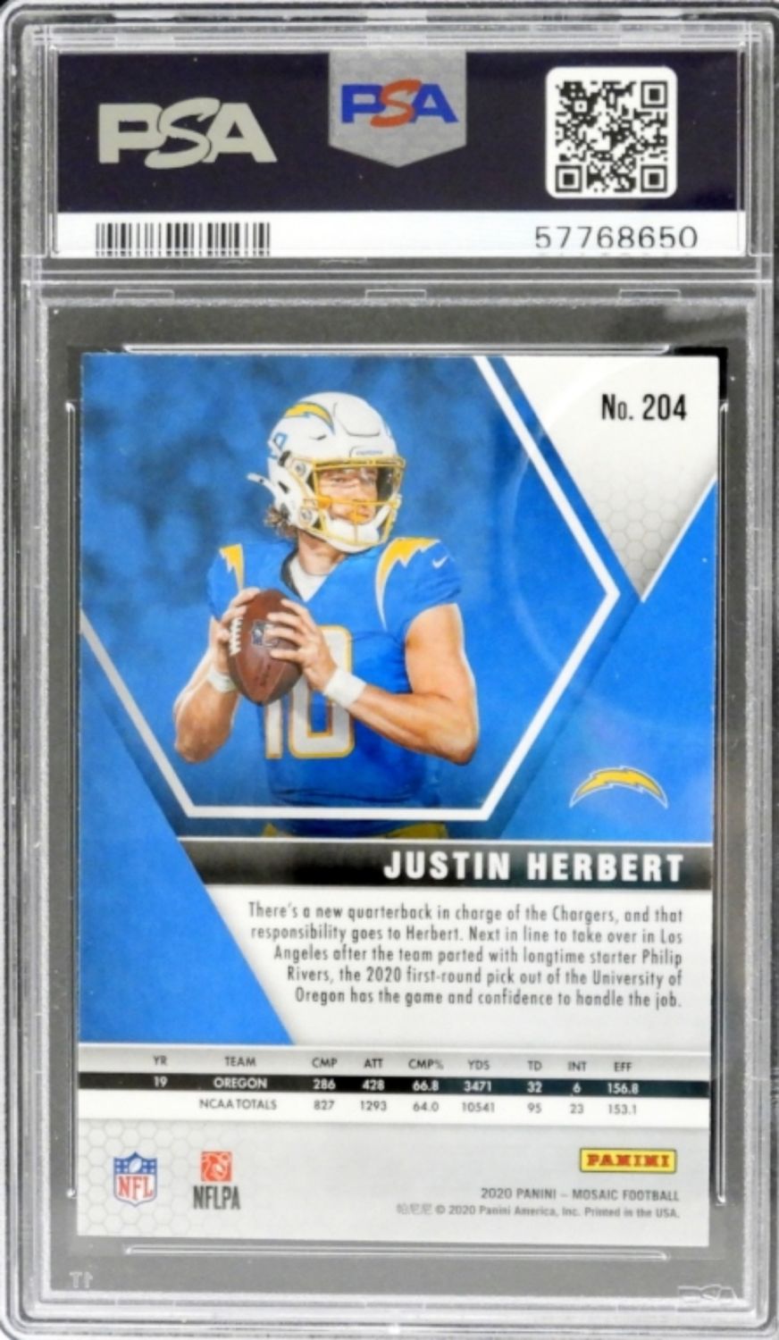2020 PANINI MOSAIC JUSTIN HERBERT RC ROOKIE CHARGERS FOOTBALL CARD #204 GRADED BY PSA 9 MINT