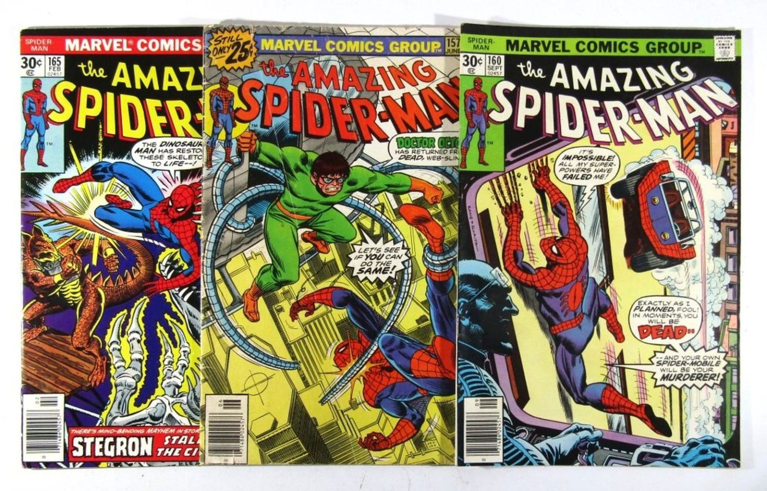 #157 (1976) Doc Octopus, #160 (1976) 1sr Appearance of Spider-Mobile, #165 (1977) Stegron; Bronze Age Comics – VG/Good Conditions.