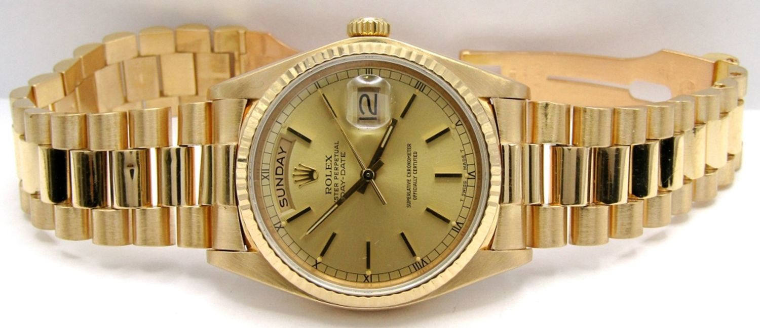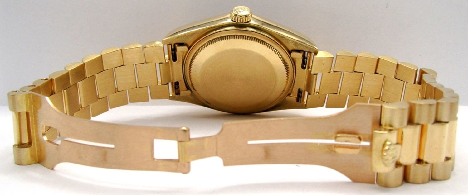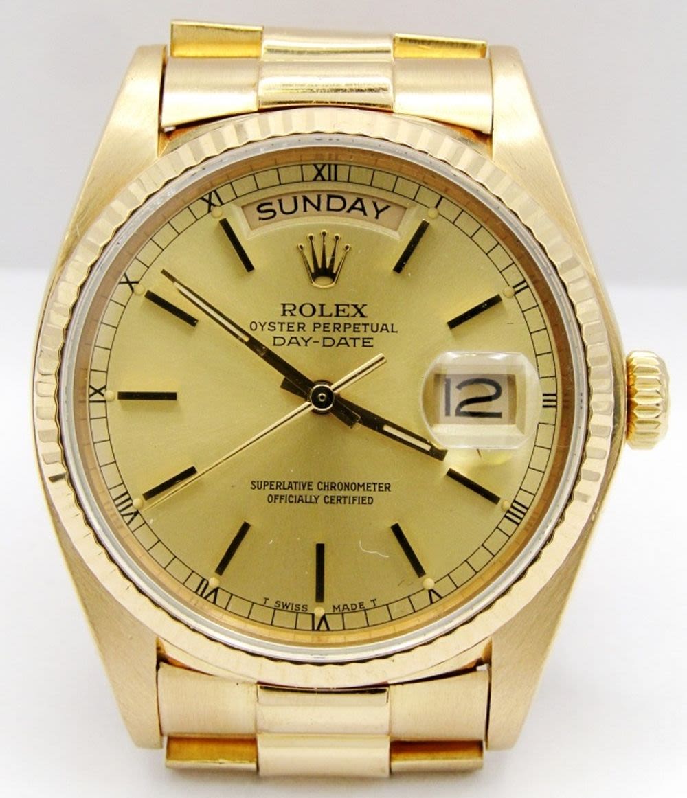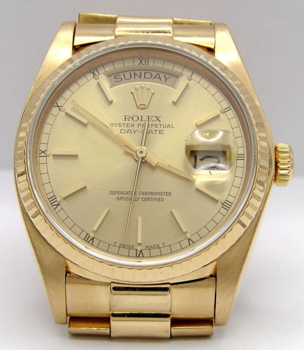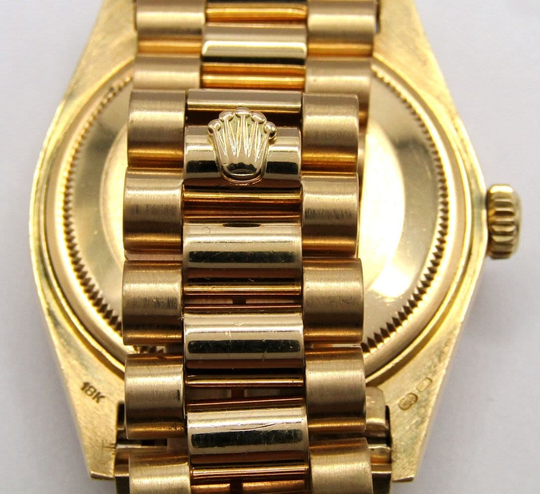 Ref 18038 Single Quick, 36mm Case, Circ 1983, Perfect Champagne Stick Dial, Sapphire Crystal, Presidential Band with Hidden Clasp. Complete with Leather Box, Books, Hang Tags, and Warranty; Working at time of listing.