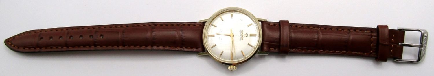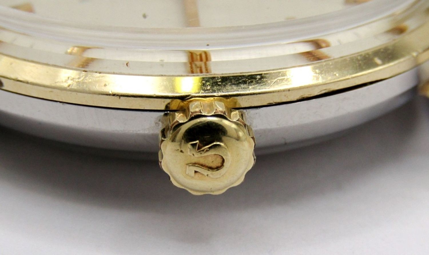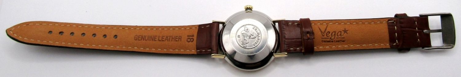 Ref LL 6066, Nice Silver Linen Dial, 17 Jewel Cal 550 Movement, 34mm Diameter, Stainless Logo Case with Gold Bezel and Lugs. New Strap; Working at time of listing.