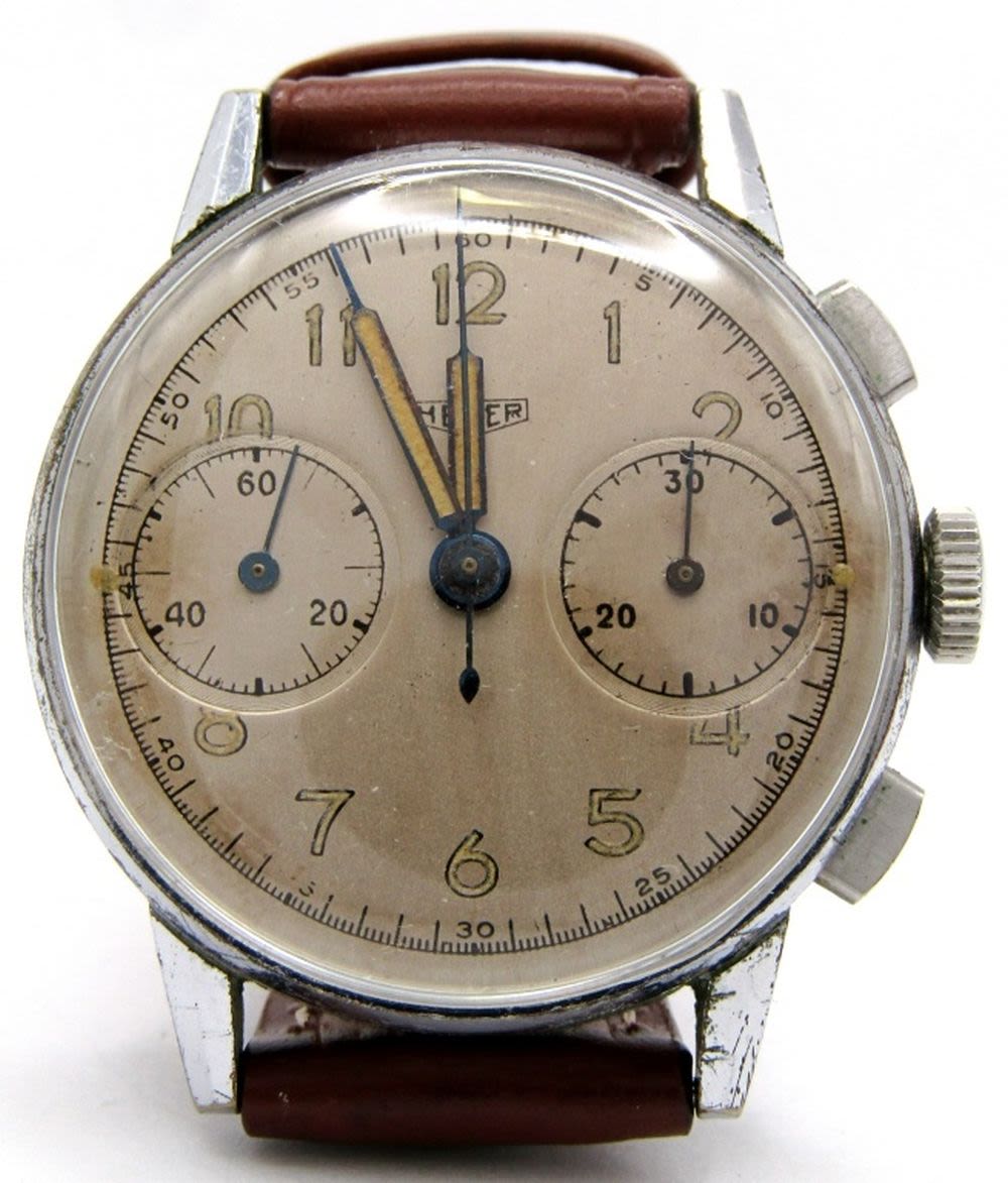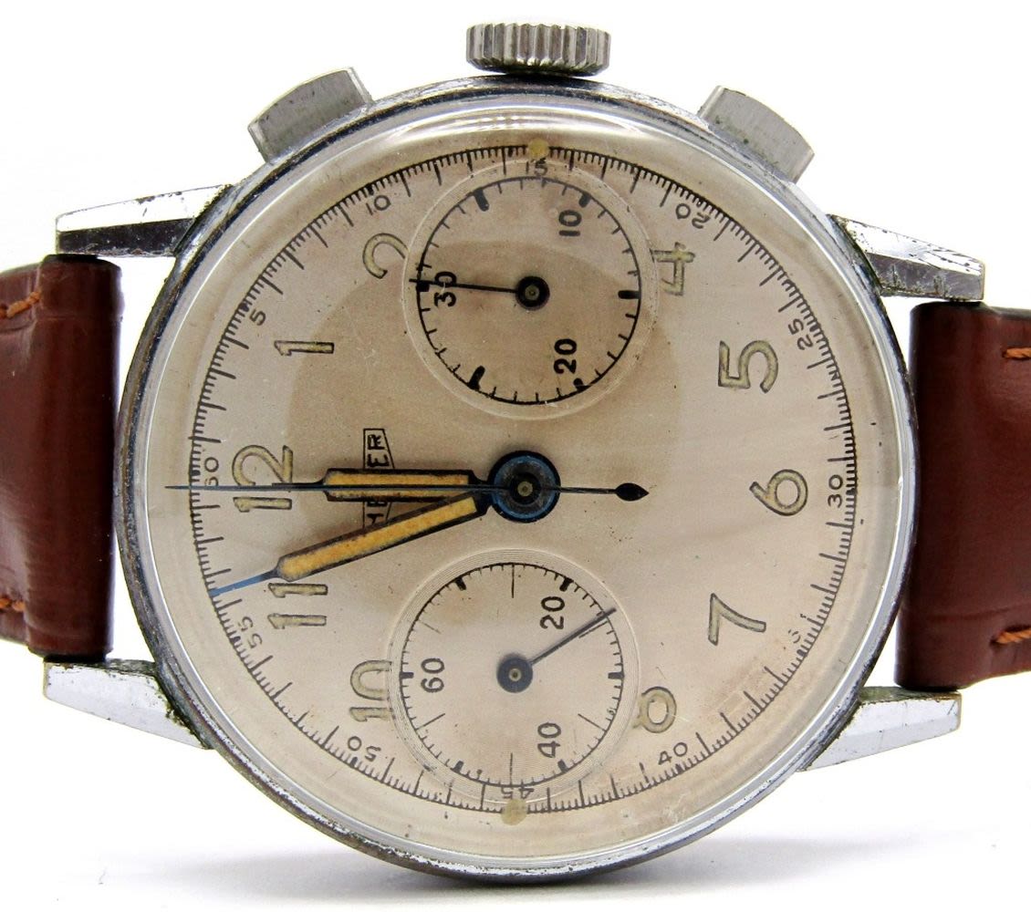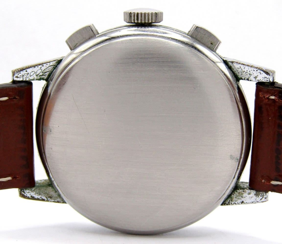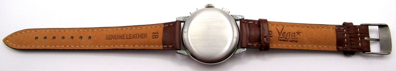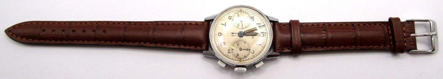 36mm, 17 Jewel Movement (Valjoux), Chrome Case with Stainless Back, Older Refinish Dial. New Strap; Working at time of listing.