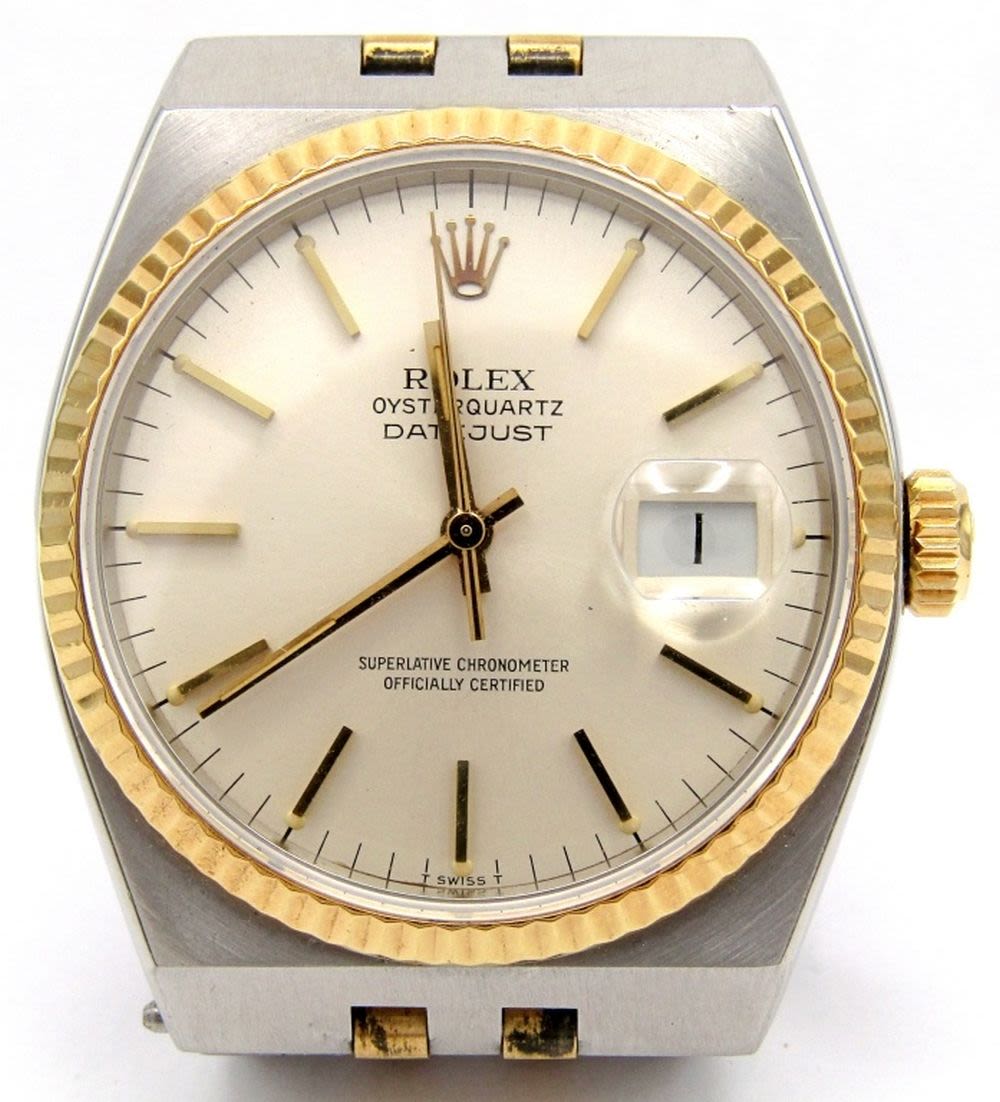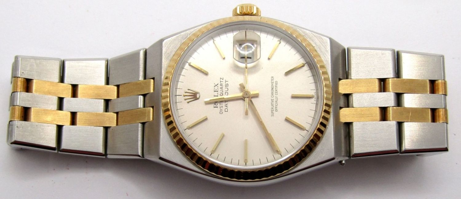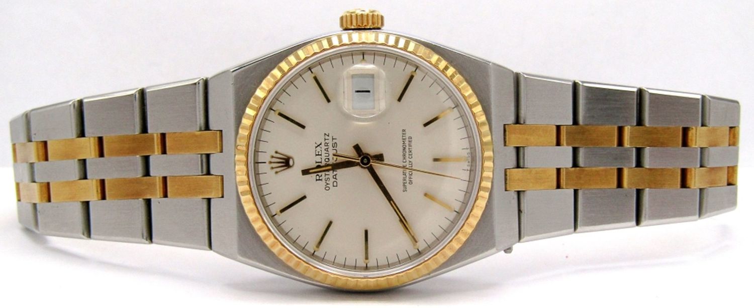 Ref. 17013, Perfect Silver Stick Dial, 36mm, Special Integral Bracelet for this Model. Circ 1986, Sapphire Crystal, Fresh Battery Installed; Working at time of listing.