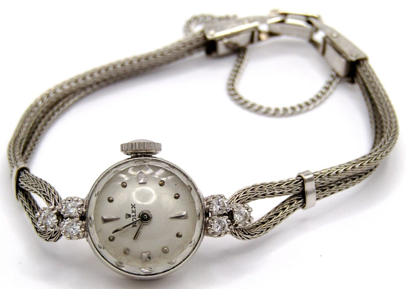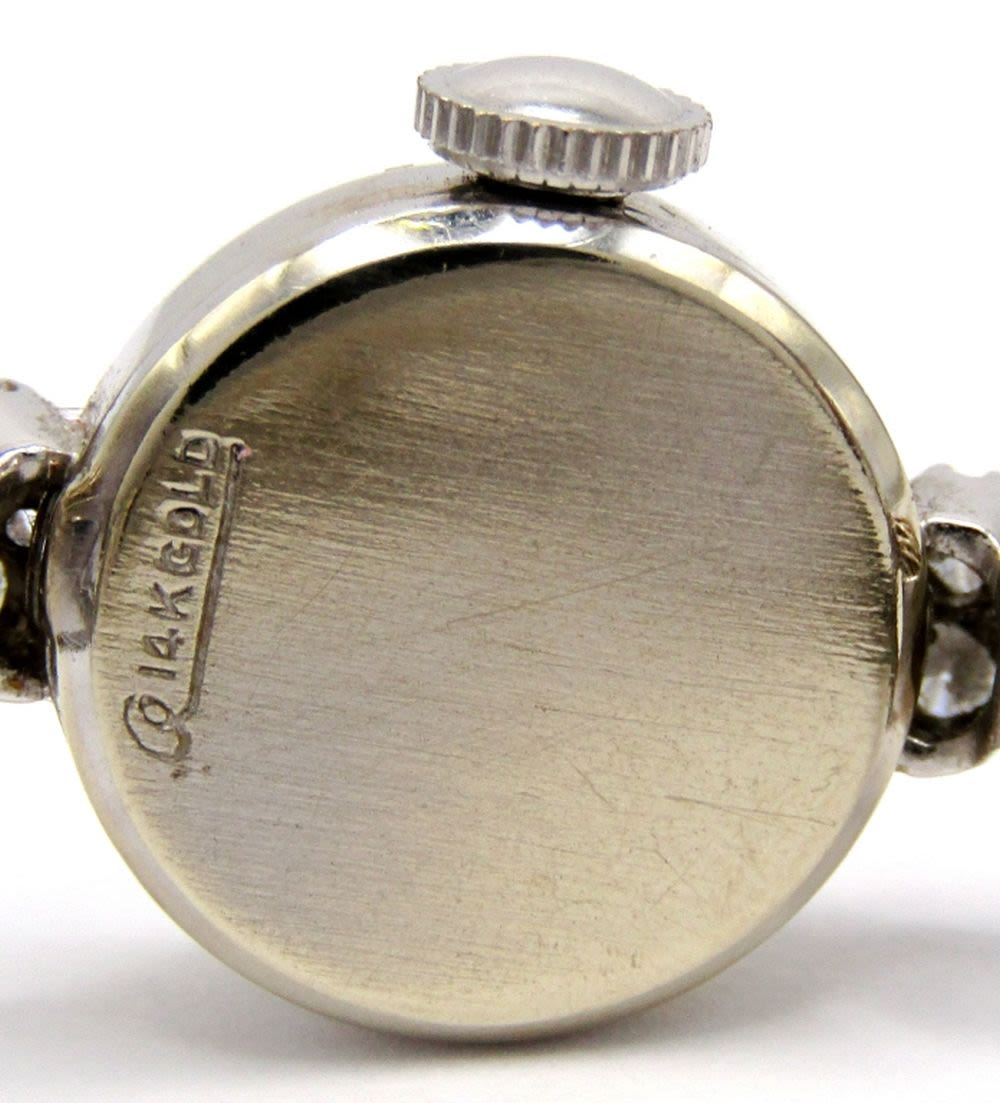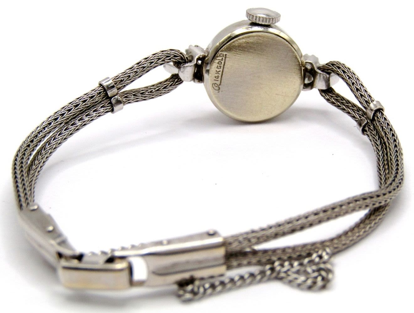 Ref 96128, Nice White Dial, 17 Jewel Cal 1400 Movement, 14LT White Gold Case Set with 6 Full Cut Diamonds. Cord Style Bracelet is 14KT White Gold with White Gold Clasp; Working at time of listing.