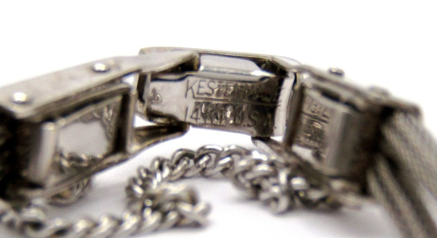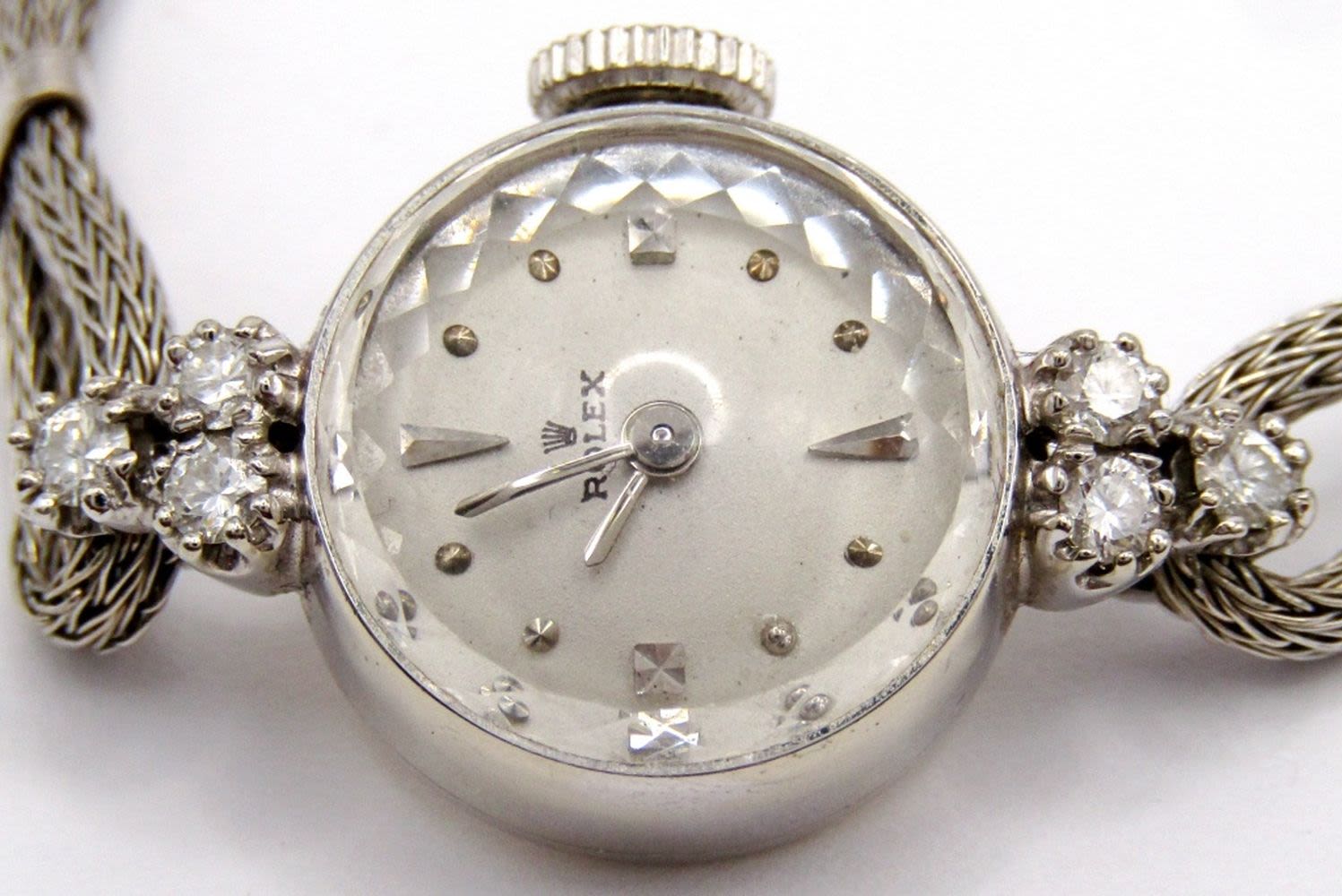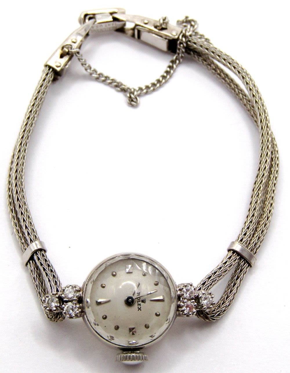 Ref 96128, Nice White Dial, 17 Jewel Cal 1400 Movement, 14LT White Gold Case Set with 6 Full Cut Diamonds. Cord Style Bracelet is 14KT White Gold with White Gold Clasp; Working at time of listing.