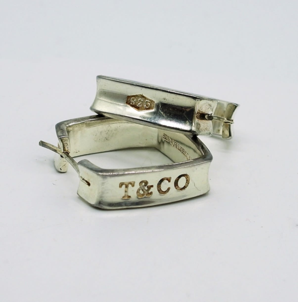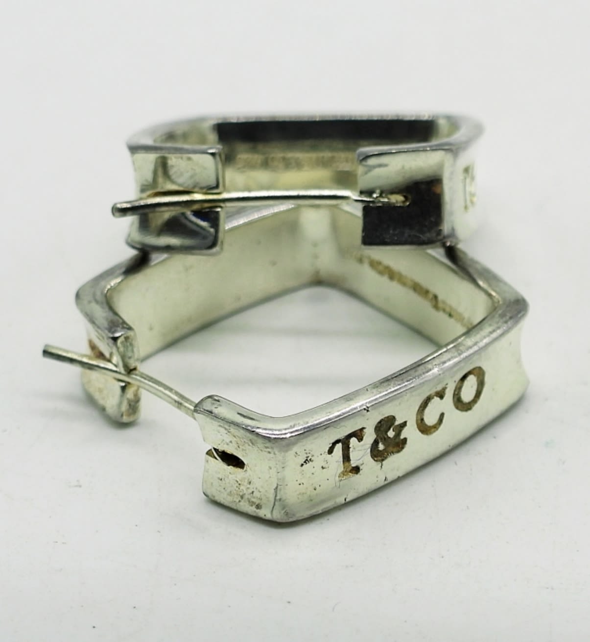 Vintage Sterling Square shaped hoops with T&CO Etched on the front facing portion. These are in wonderful condition! 5.6DWT