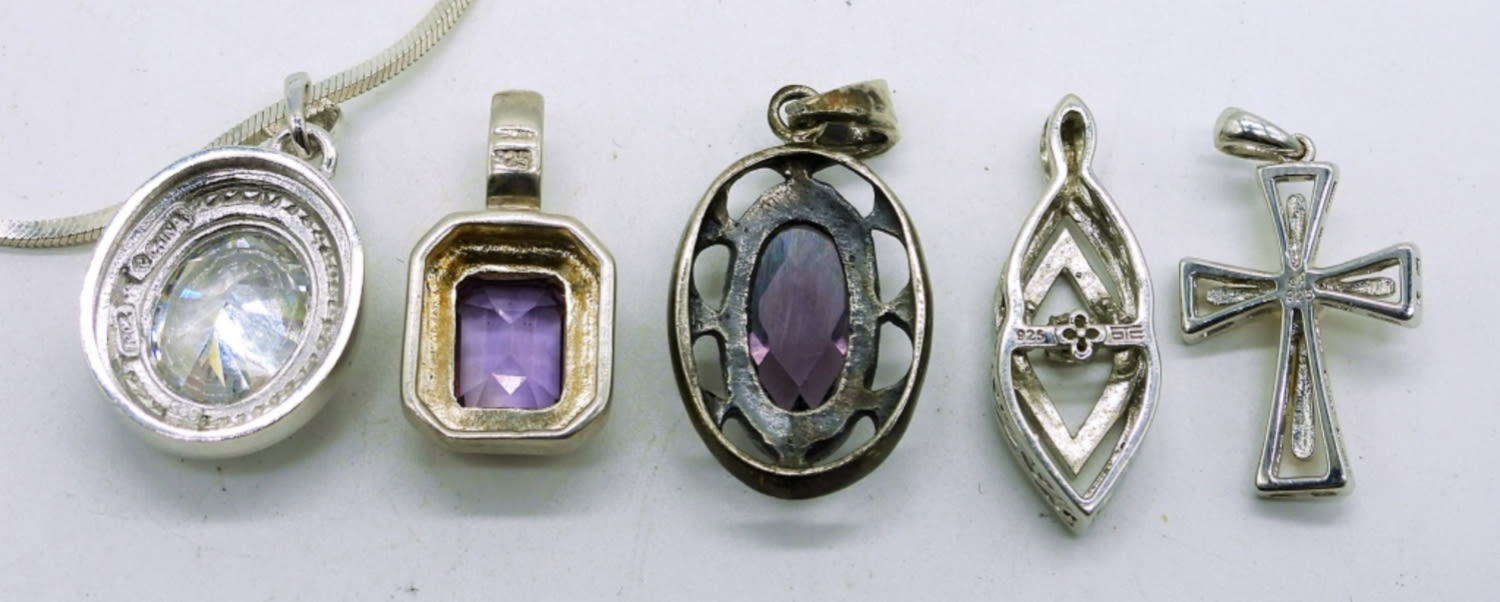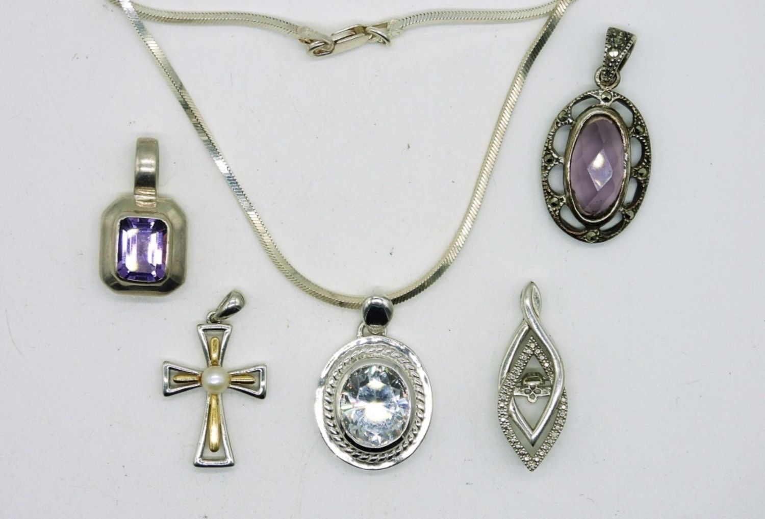 Five Sterling Silver Pendants with Amethyst & Diamond Colored Gemstones. 19 inch Sterling Silver Chain. 16DWT