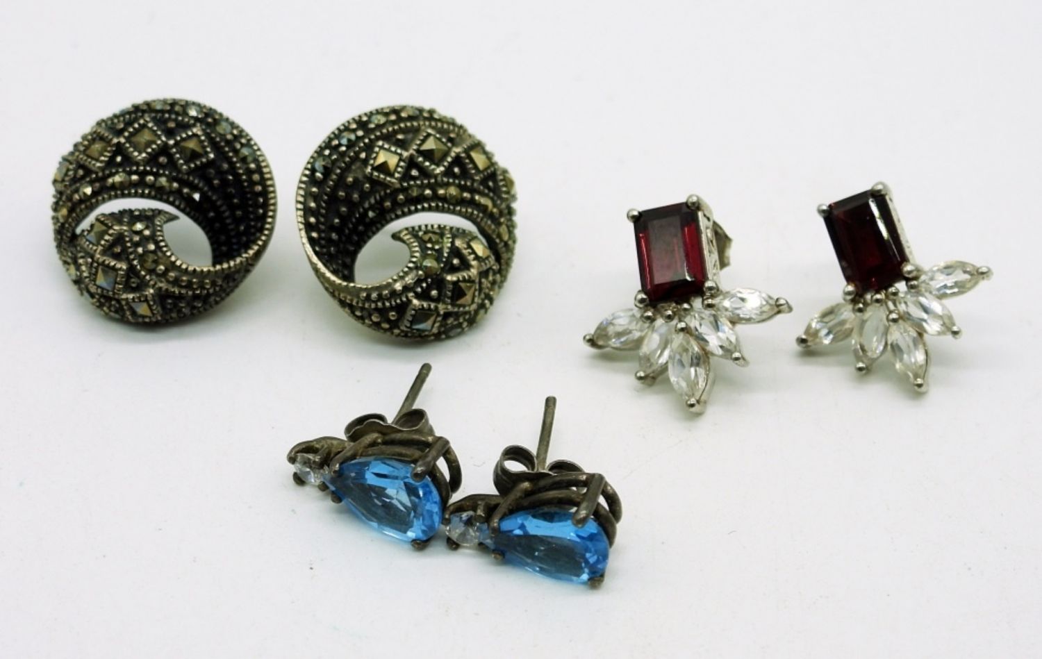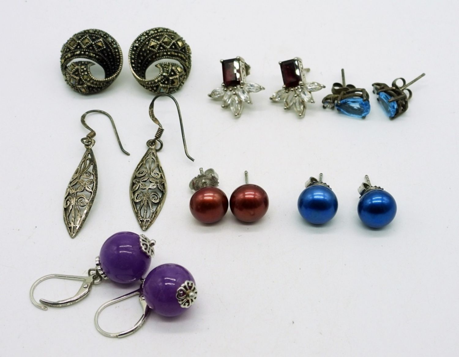 Two Sterling Colored Pearl Earrings, Blue Topaz Earrings, Garnet Earrings, Purple Beaded Earrings, Marcasite Earrings and Silver Scroll Work Earrings. 16DWT